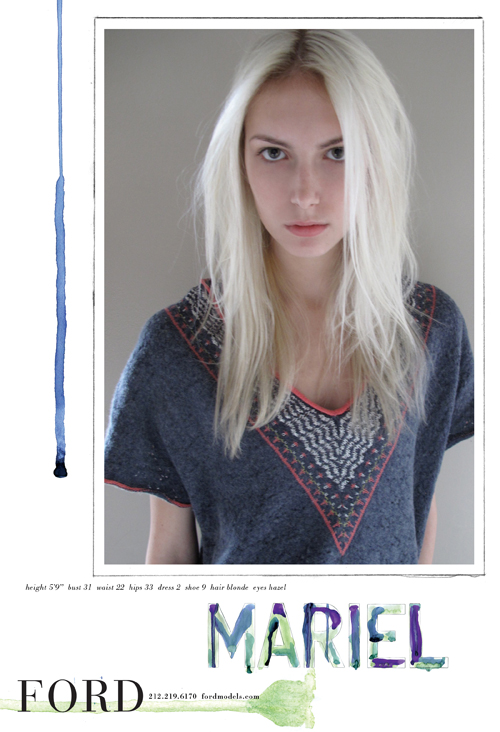 First Name:MarielLast Name:SoehnerNationality:AmericanHair Color:BlondeEye Color:HazelDate of Birth:April 12, 1992Place of Birth:Rochester, New YorkHeight:5'10" ; 178cmMeasurements:(US) 31-23.5-32 ; (EU) 79-59.5-81Dress Size:(US) 2 ; (EU) 32Shoe Size:(US) 9 ; (EU) 40 ; (UK) 6.5Mother agency:Ford Models - New York Agencies: