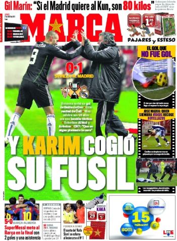 Early in the first half, Benzema collected possession outside the Sevilla box, charged into it, dragged the ball back inside the defender before slotting under the body of goalkeeper Andres Palop.