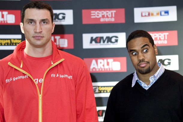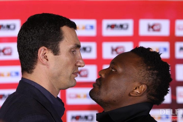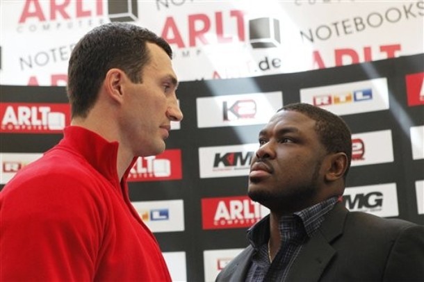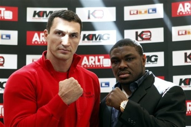 Wladimir Klitschko from the Ukraine and Samuel Peter of Nigeria, from left, pose for photographers on during a news conference in Frankfurt, Germany on Monday, Sept. 6, 2010. IBF, WBO and IBO heavyweight Champion Wladimir Klitschko will try to defend his title against Samuel Peter of Nigeria in Frankfurt, Germany, on upcoming Saturday.