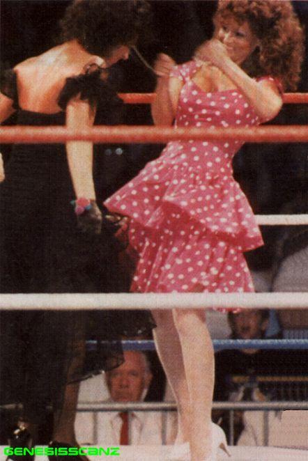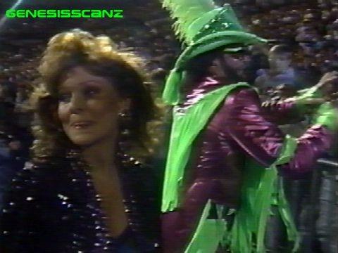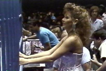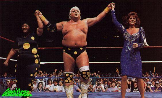 At the first ever SummerSlam, The Mega Powers teamed up against André the Giant and Ted DiBiase, The Mega Bucks with Jesse Ventura as the referee. Most of the pre-match build-up centered around Elizabeth, who by this time was at the peak of her popularity. The tease for the match was that if things got bad, Elizabeth, billed as the secret weapon of The Mega Powers, was going to wear a bikini under her fancy clothes. Towards the end of match, André and Dibiase were in control, so Elizabeth got up on the apron and ripped her skirt off to reveal a red bikini bottom, which distracted both André and DiBiase. The Mega Powers quickly took advantage of the situation and won the match after Ventura made a reluctant three-count (Savage rode Ventura's arm down to the mat to finalize the count).