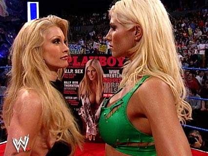 Sable briefly became a face again when she appeared on the cover of Playboy magazine for the third time in her career. On the cover, she appeared with fellow diva Torrie Wilson, making them the first WWE Divas to pose in Playboy together. Surrounding the release of the cover, the duo feuded with Raw divas Stacy Keibler and Miss Jackie, even though all four women were faces at the time. The two teams squared off at WrestleMania XX in an Interpromotional Tag Team Evening Gown match, but the divas started the match in their underwear, making it more of a lingerie match. Sable and Wilson were victorious.The change was rumored to have occurred because Sable had suffered damage to her breast.