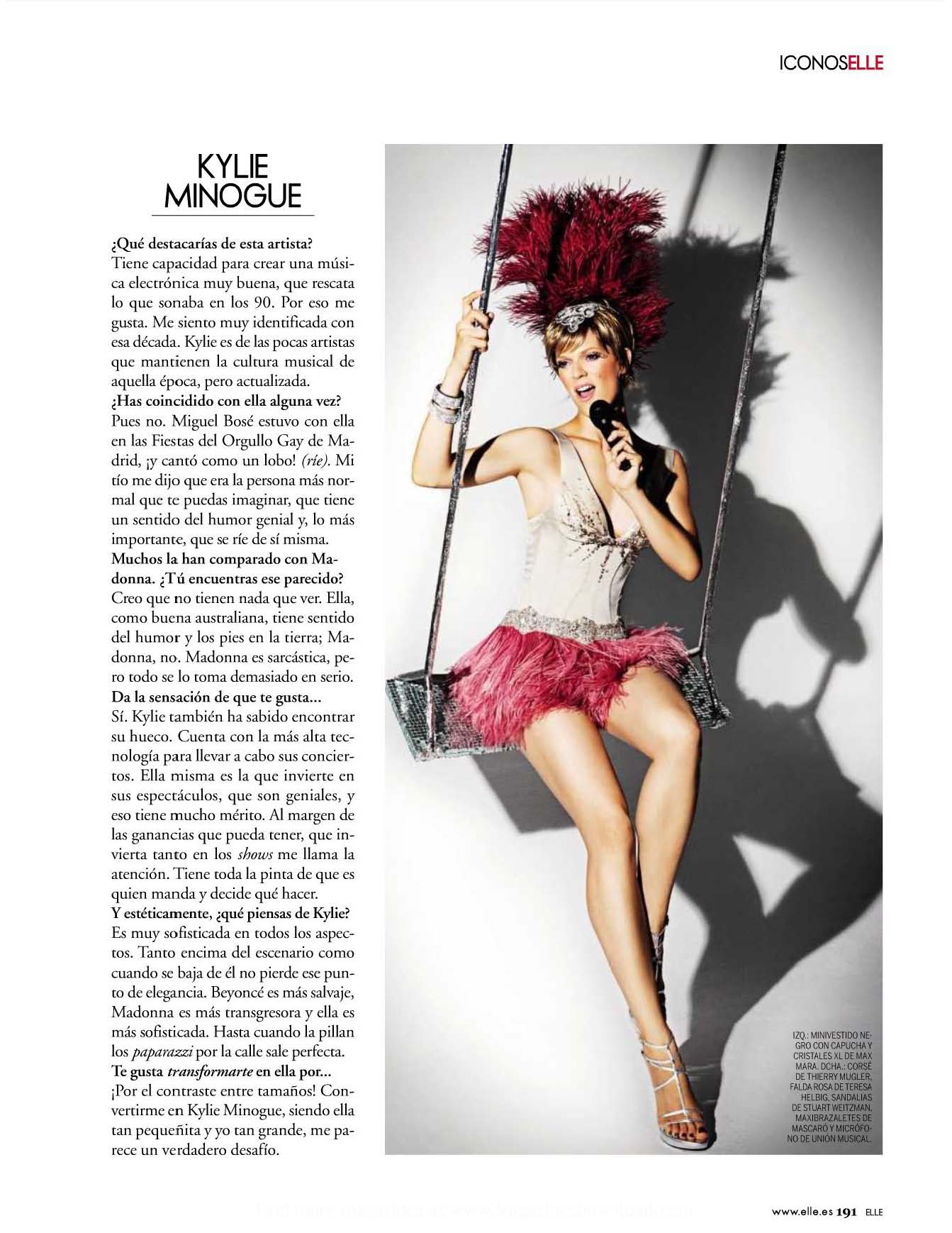 Spain: 'Vanidad' - March/April 1995; 'Marie Claire' - May 2001; 'Woman' - November 2001; 'Vanidad' - 2004; 'Neo2' - 2002; 'Vanidad' - June 2005; 'Woman' - November 2005; 'Elle' - December 2006; 'Arte de Vivir' - September 2007; 'Woman' - November 2007; 'Vanidad' - December 2007; 'El Pais Semanal' - September 14 2008; 'Zero' - October 2008; 'Vanity Gay' - #31 2008; 'Marie Claire' - September 2009; 'Mujer Hoy' - January 09, 2010
