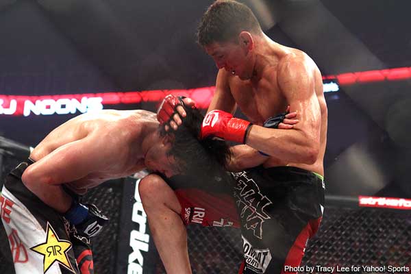 "I beat his ass. But you know, that little fucker. Man that fucker is tough. I mean I hit him, but then he comes out with this karate shit and little dude can bang. I mean he fucked up my eye and shit... That's why I went to the ground and go go'd him. You dont see that shit in MMA. Who in MMA go go's anyone cept me."