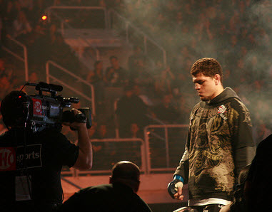 There were also, of course, the two grand, highly entertaining debacles in which he's participated for the benefit of television cameras. One took place in 2008, when he stepped into the cage to demand a match with rival K.J. Noons ("Don't be scared, homey!"), a scene that involved a bum's rush from Noons' father and Nick's flipping off the crowd while Nate threw what looked awfully like gang signs. The other was last year's infamous Strikeforce brawl on CBS, where the Diaz brothers, among other Gracie students, stomped Jason "Mayhem" Miller while buffoonish announcer Gus Johnson plaintively begged them to stop over the house microphone. ("Gentlemen! We're on national television!")