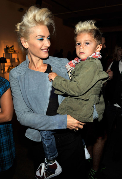 With her signature blonde pompadour, dressed in a blue military jacket and black silk parachute pants, Stefani politely took photos with star-struck fashionistas as she kept tabs on her two little boys, Kingston and Zuma Nesta Rock.