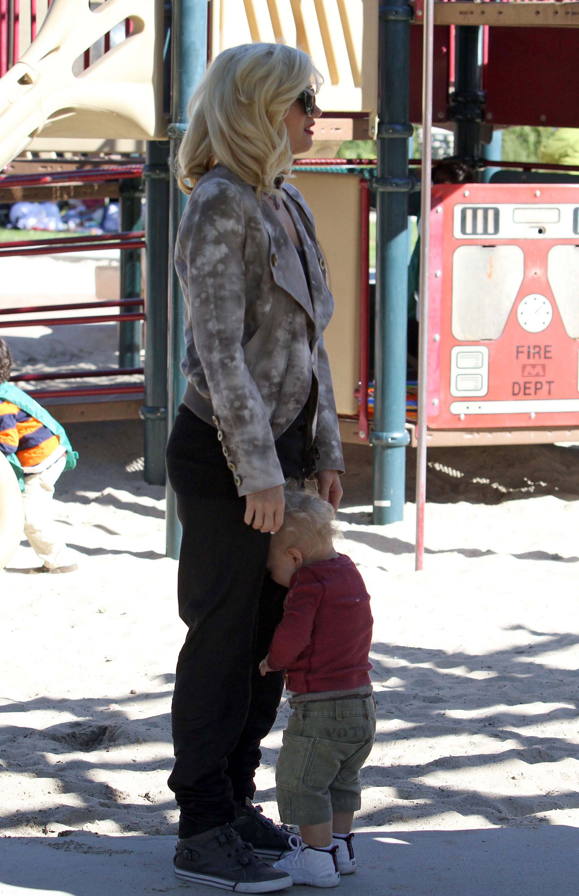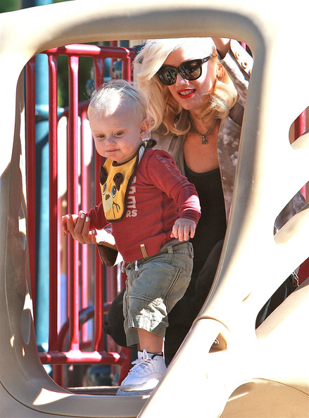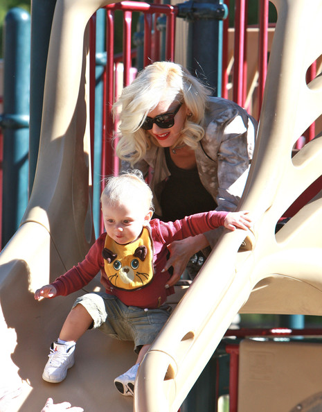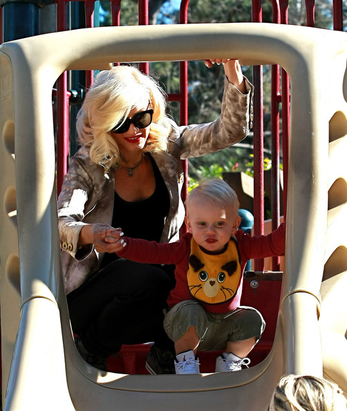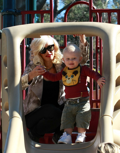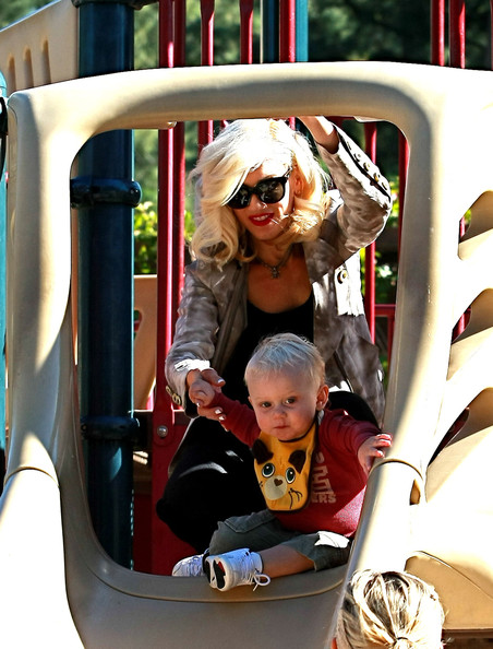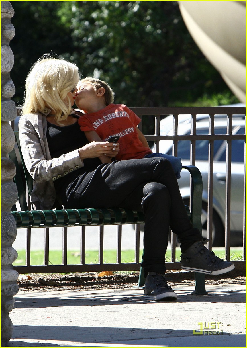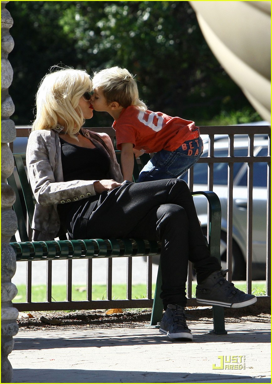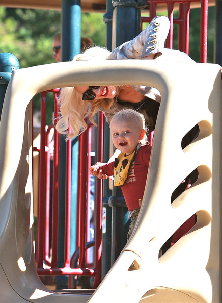 Gwen Stefani gets a kiss from her 3 3/4-year-old son Kingston while watching 17-month-old Zuma play at Coldwater Park on Thursday in Beverly Hills, Calif.
