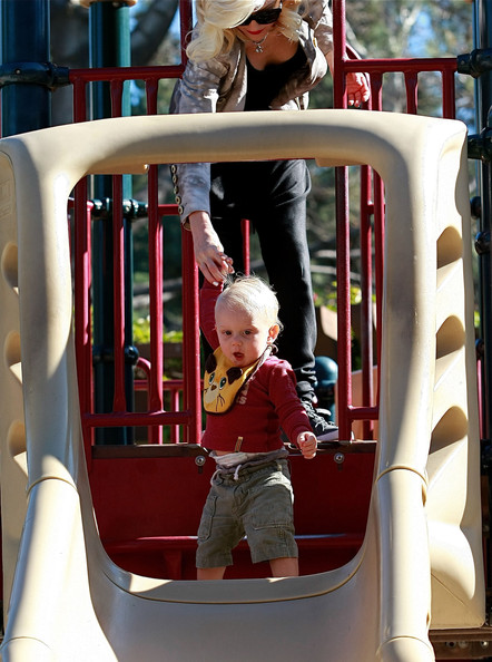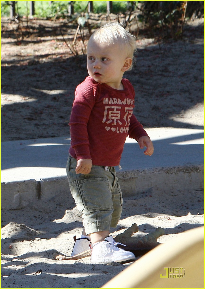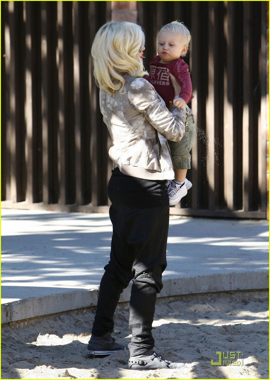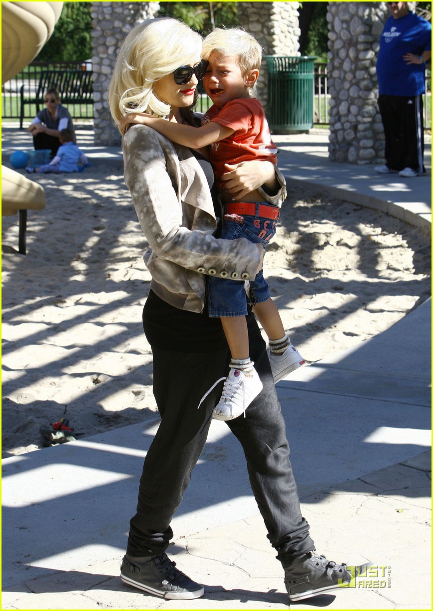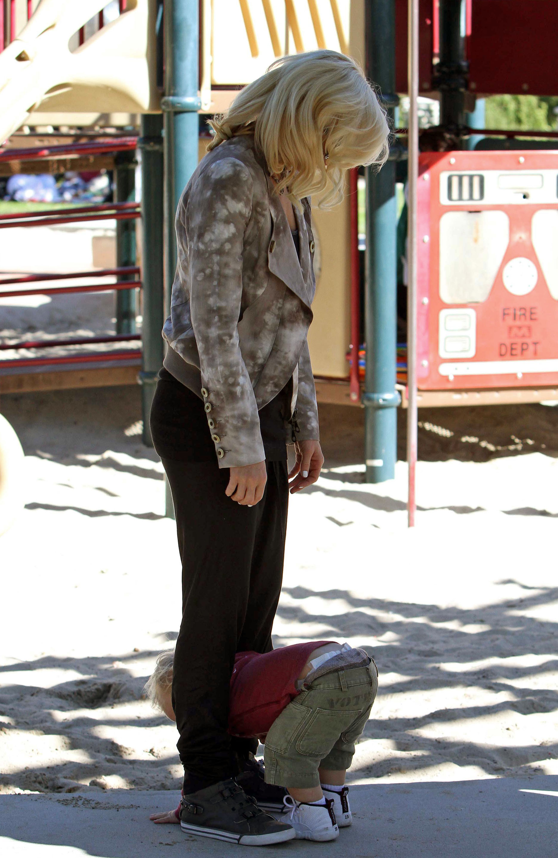 Gwen Stefani gets a kiss from her 3 3/4-year-old son Kingston while watching 17-month-old Zuma play at Coldwater Park on Thursday in Beverly Hills, Calif.