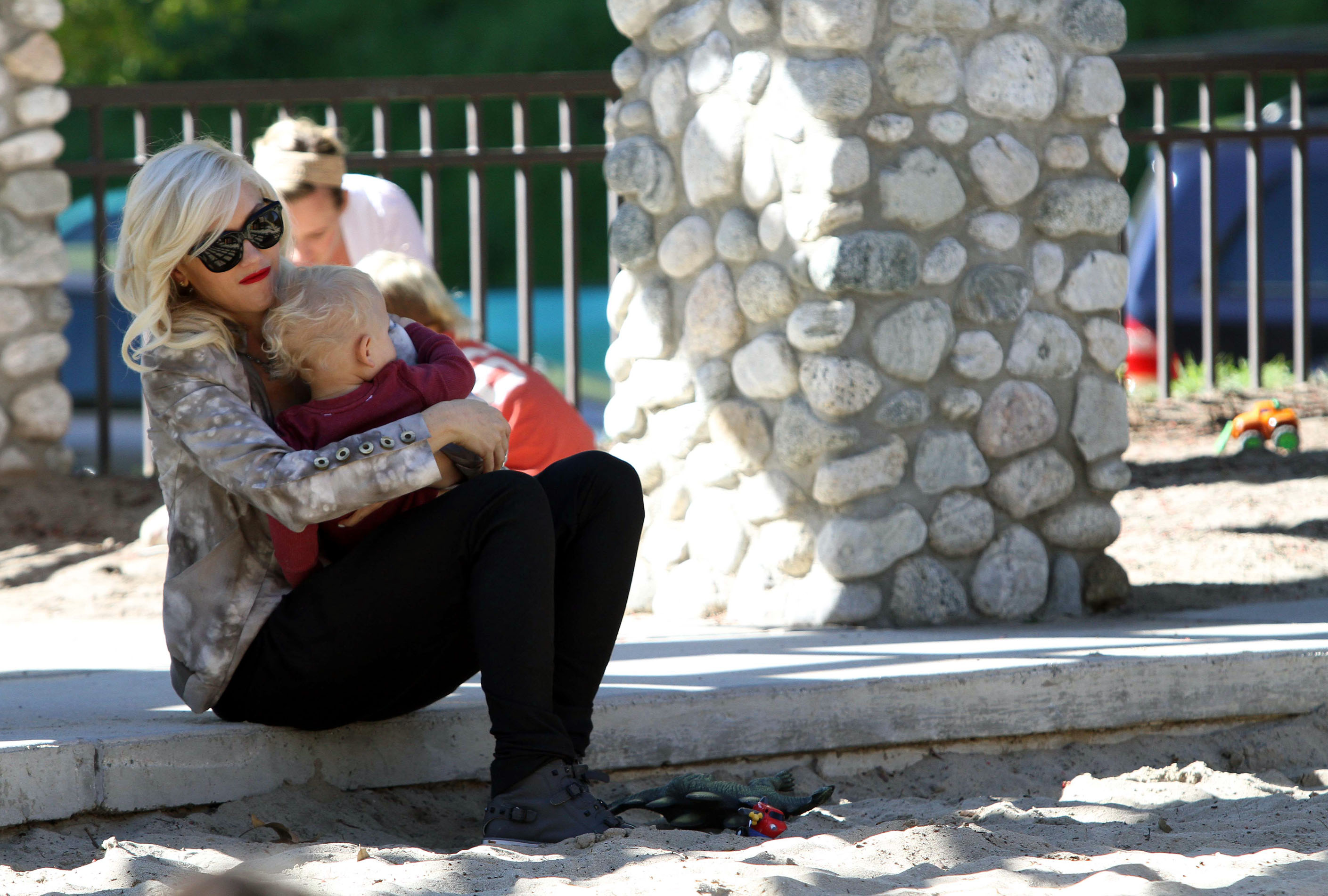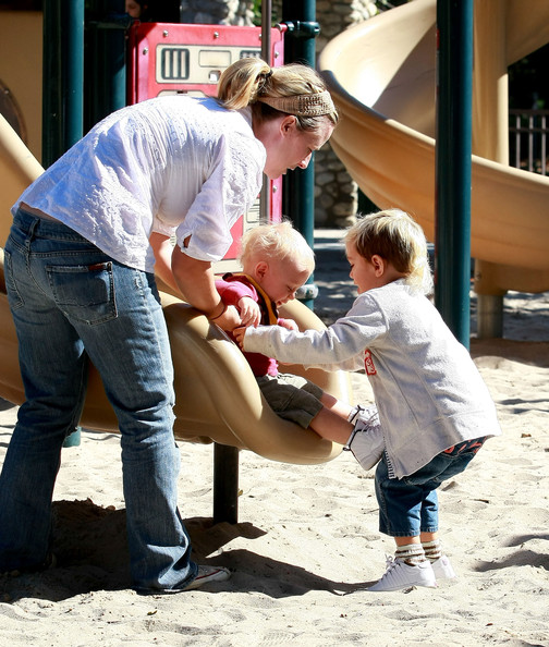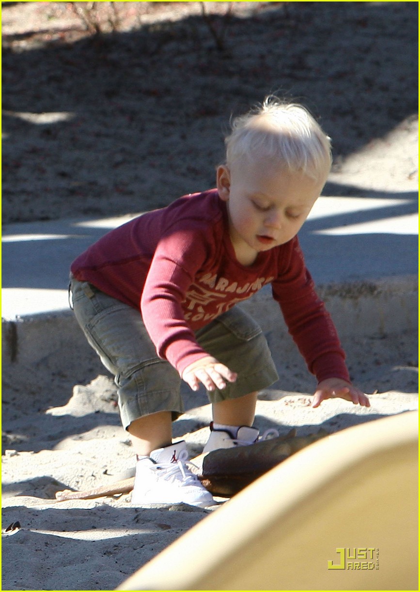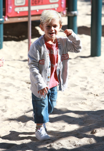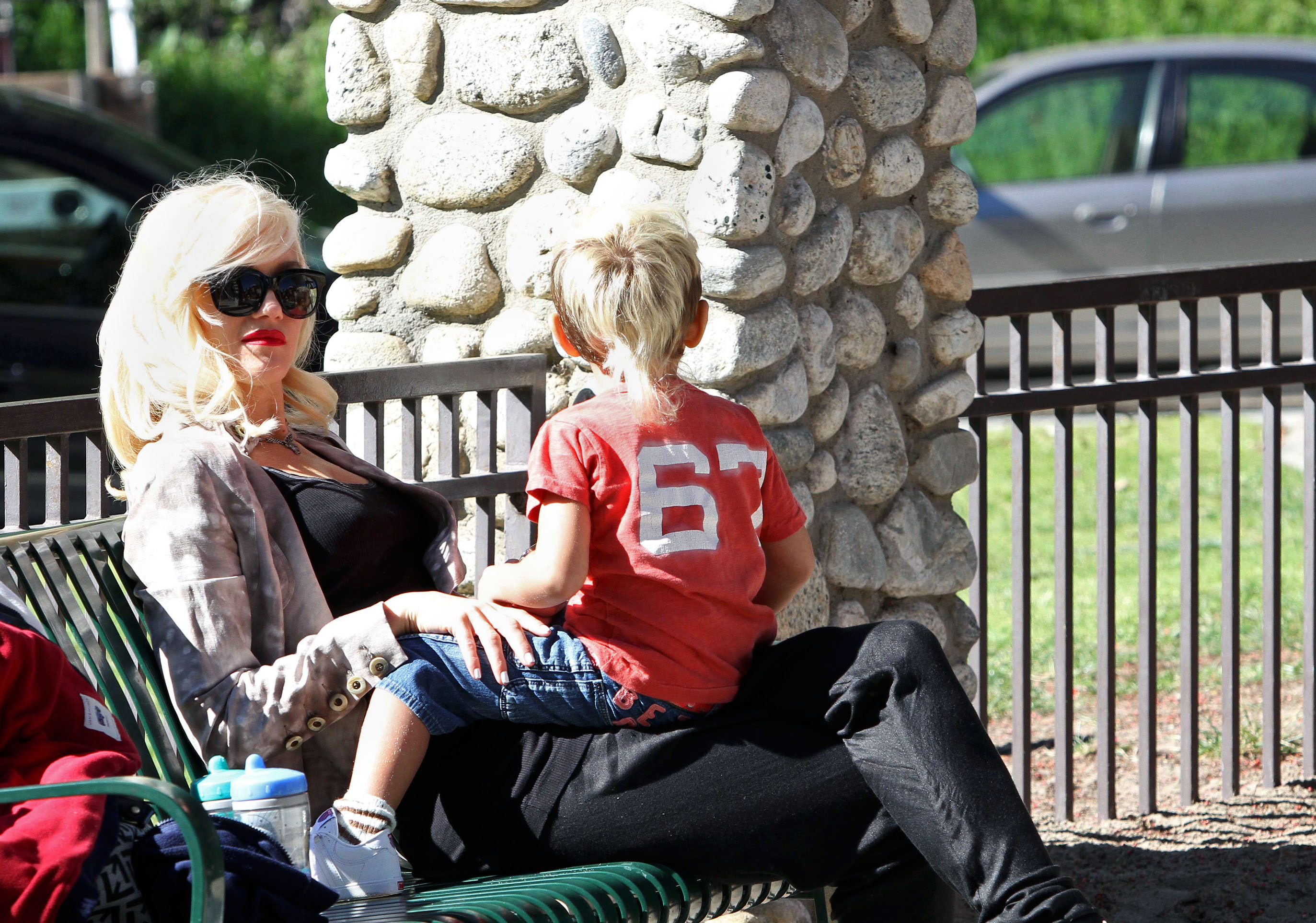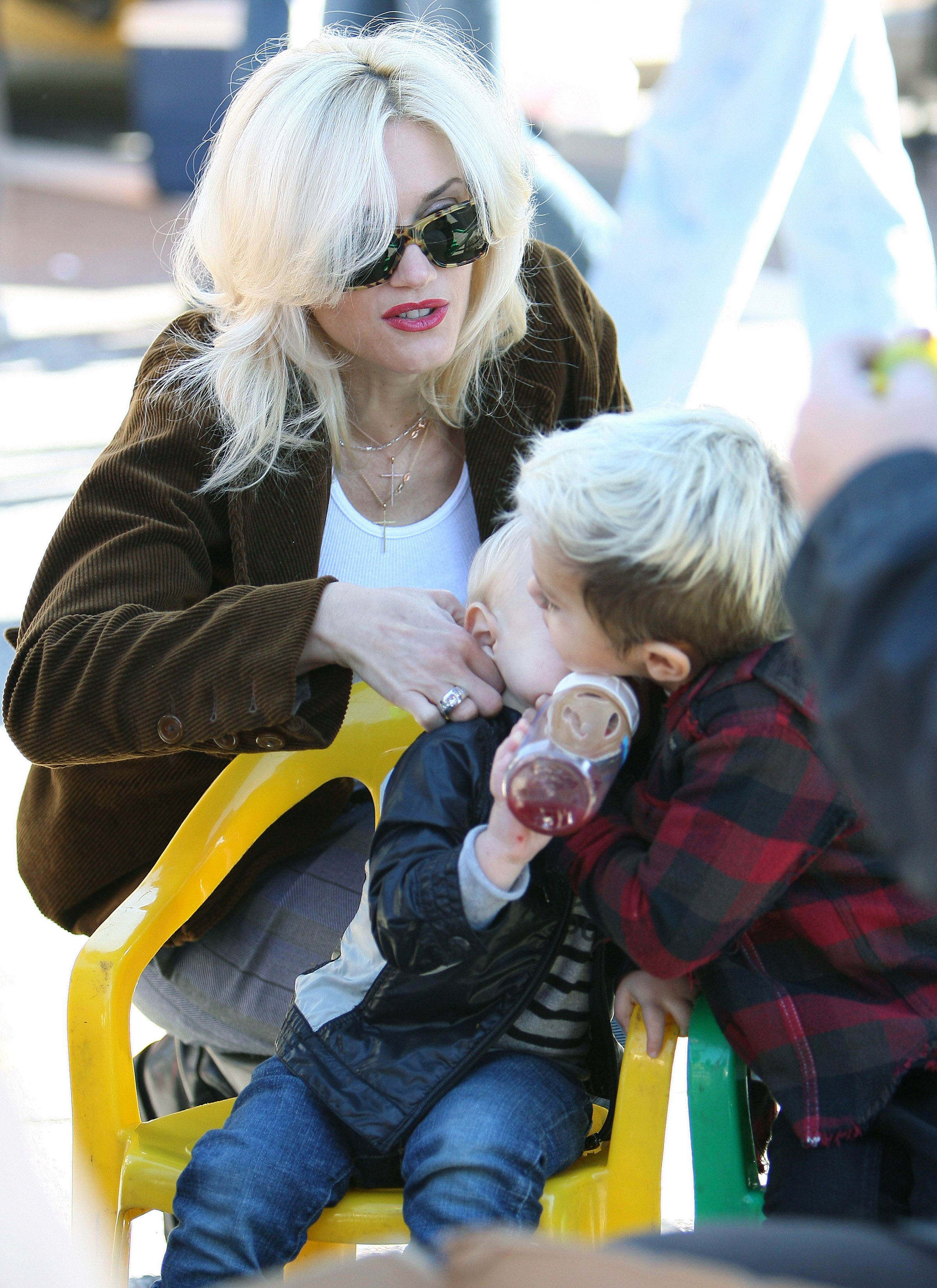 Gwen Stefani gets a kiss from her 3 3/4-year-old son Kingston while watching 17-month-old Zuma play at Coldwater Park on Thursday in Beverly Hills, Calif.