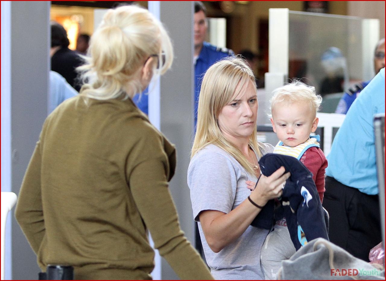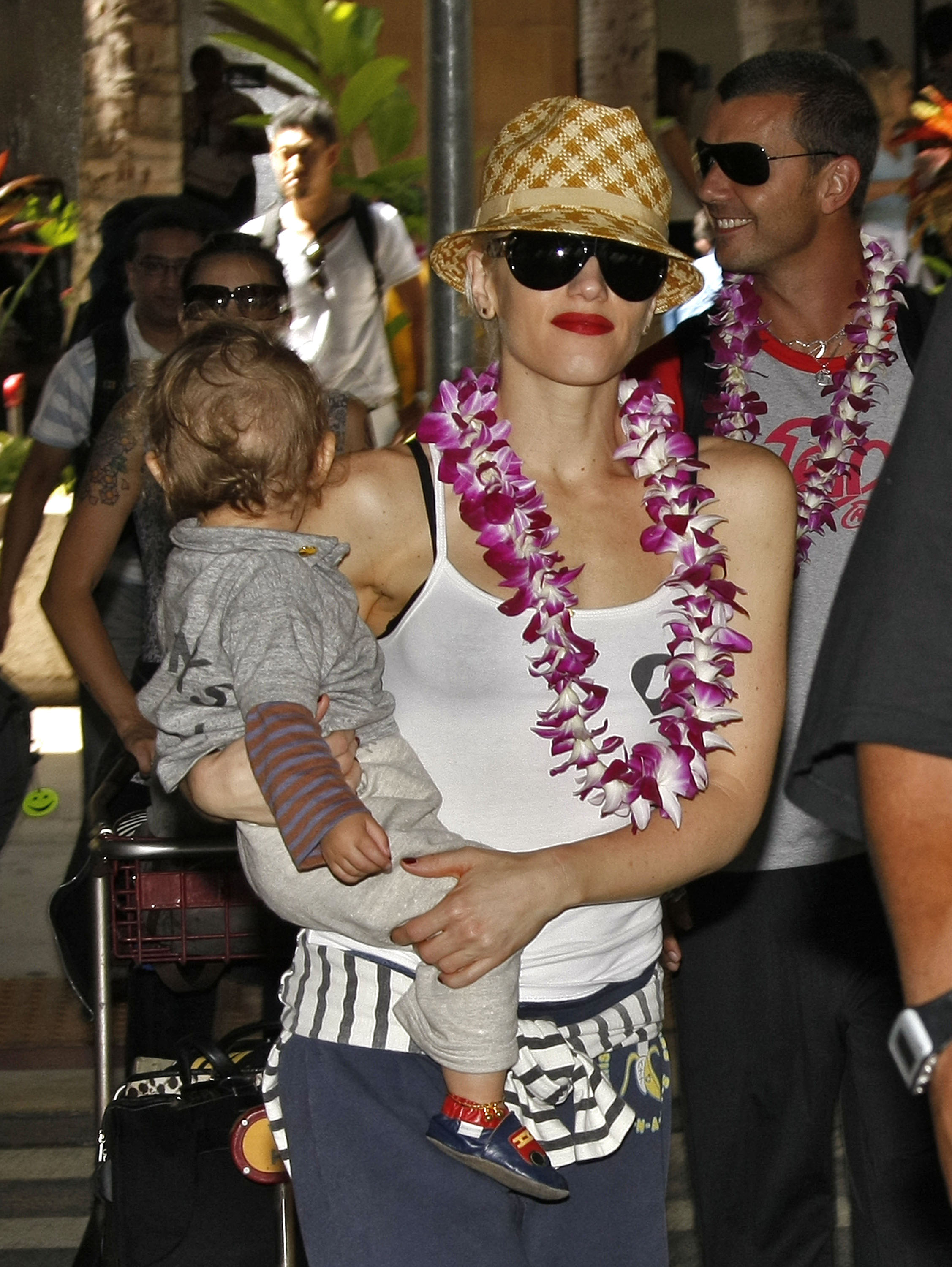 Security workers look displeased by her actions but let her proceed so that she could comfort her little son Zuma Rossdale.