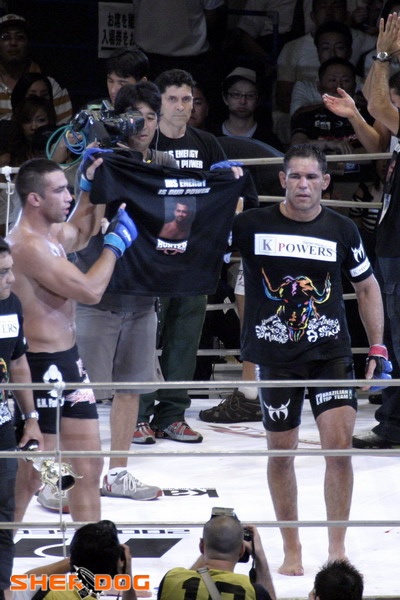 He then represented Pride at a co-promotion with K-1, Pride Shockwave, against the super heavyweight former American footballer Bob Sapp. Sapp manhandled the much smaller Nogueira, spiking him onto the ring canvas and dominating the fight, until tiring and falling to an armbar submission. His battle with Sapp (who outweighed him by over 150 lb) made him a fan favorite for his seemingly inhuman ability to take punishment before recovering to win.