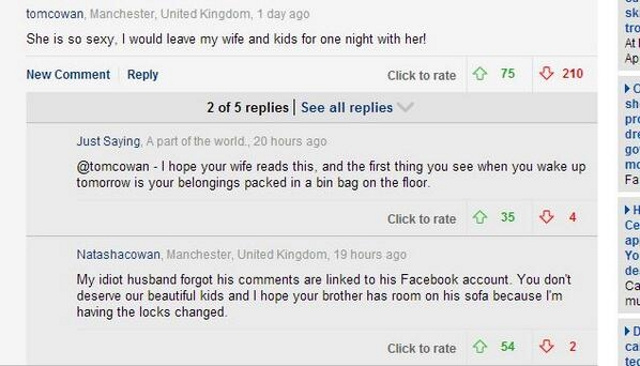 If you're going to leave a lascivious comment underneath a gallery of glamour model lingerie pics informing the world that you're willing to leave your loving family for just "one night" with the gallery's subject, make sure your comments aren't linked to your Facebook account. One Manchester man had to learn that the hard way after he declared to readers of The Daily Mail that model Kelly Brook was "so sexy" he would gladly "leave my wife and kids for one night with her."