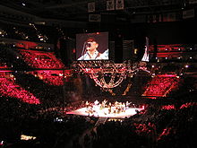 George Strait performing at the MCI Center in 2003His next album, Honkytonkville was described as "a fiery set of hard country", and was praised "for its mixture of the old Strait with his modern, superstar self." It didn't produce any #1's for Strait but included the hits "Cowboys Like Us" and a cover of Bruce Robison's "Desperately." His 2004 performance at Reliant Stadium set a new Rodeo attendance record, with 68,679 spectators. That year he issued a Greatest Hits package billed as 50 Number Ones, chronicalling the #1 hits of his career from all charts, starting with "Fool Hearted Memory" and ending with "She'll Leave You With a Smile." The next year, Somewhere Down in Texas arrived, which produced the hit "You'll Be There," marking Strait's first appearance on the Adult Contemporary chart. The next year, he embarked on a tour that included only 18 performances but grossed over $15 million. He attributed this success to the fact that he and his band are "musically very tight," have a large pool of songs to draw from, and perform those songs very similarly to how they sound on their albums.