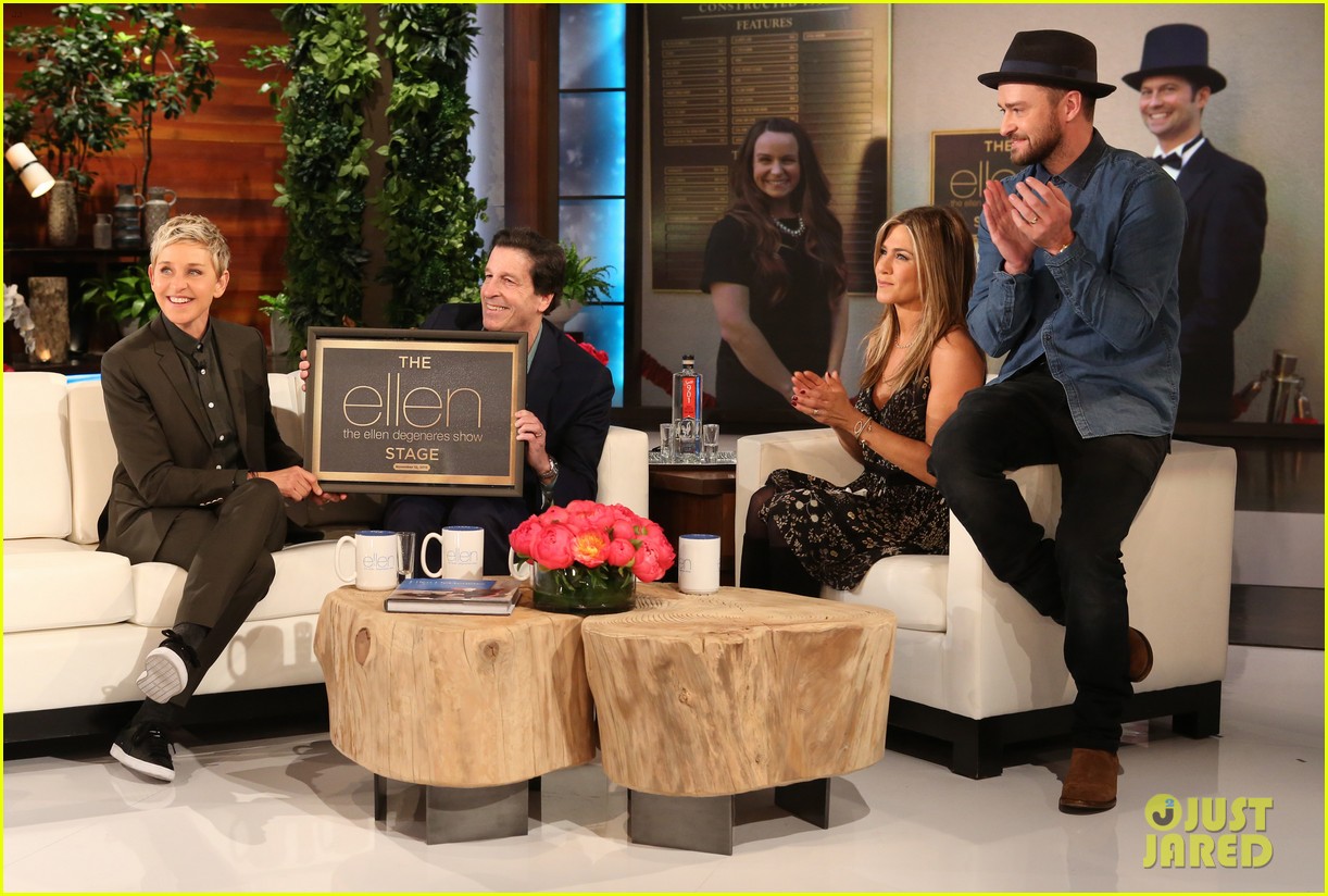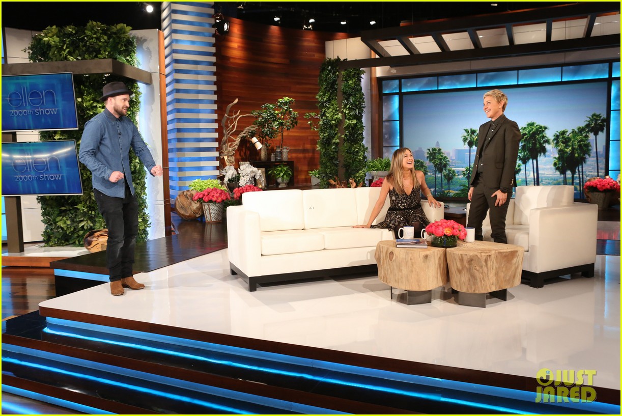 Jnnifer Aniston and Justin Timberlake toast a shot to Ellen DeGeneres during a surprise visit to The Ellen DeGeneres Show airing on Thursday (November 12) from Los Angeles. The A-list duo stopped by to celebrate her 2000th episode!