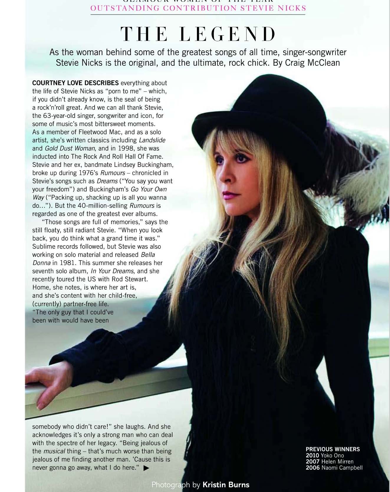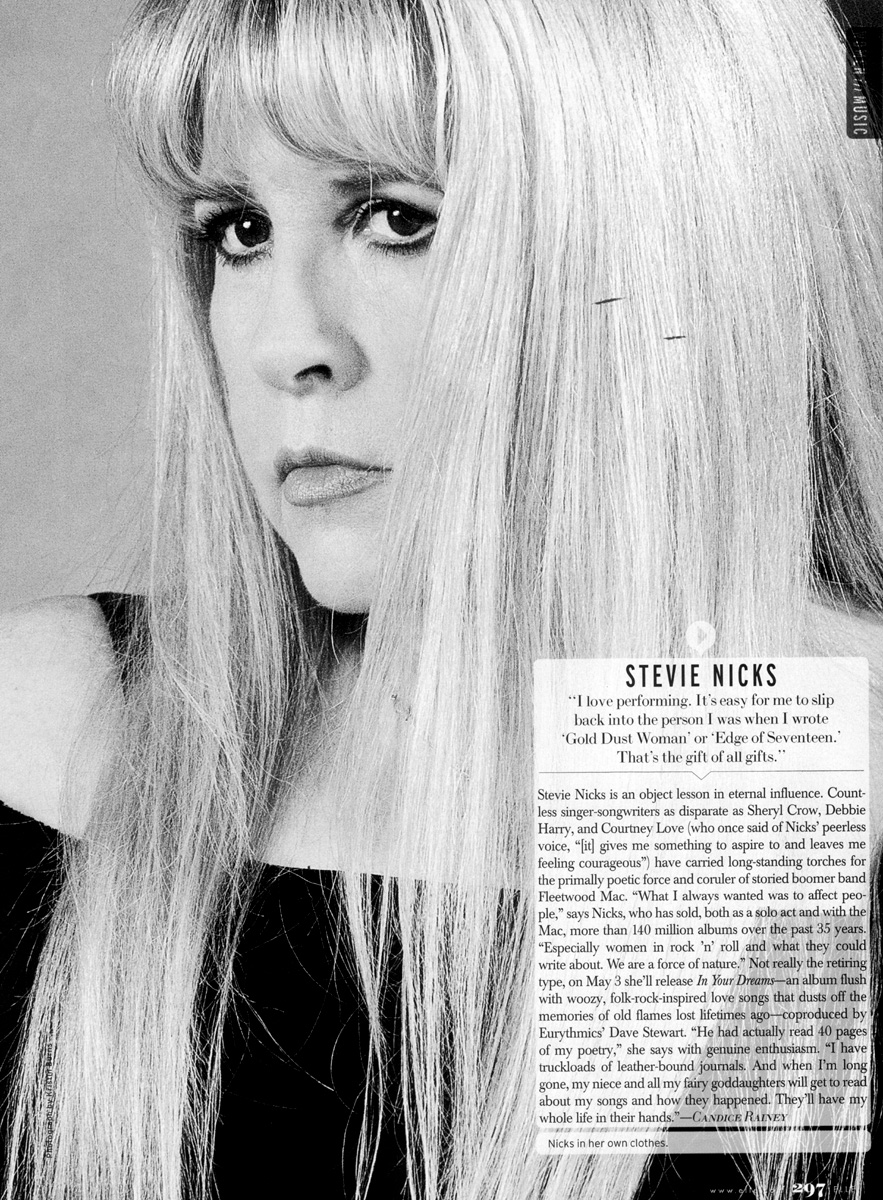 Of her lifestyle today, Nicks stated "I am a very different girl from the one who was so wrapped up in rock and roll and the drugs and everything else. I'll never take it all for granted again, ever. Because I also now really realize how quickly that it can go, and that you can be the darling one year, and be nobody the next year. So you have to learn to accept and deal with that."