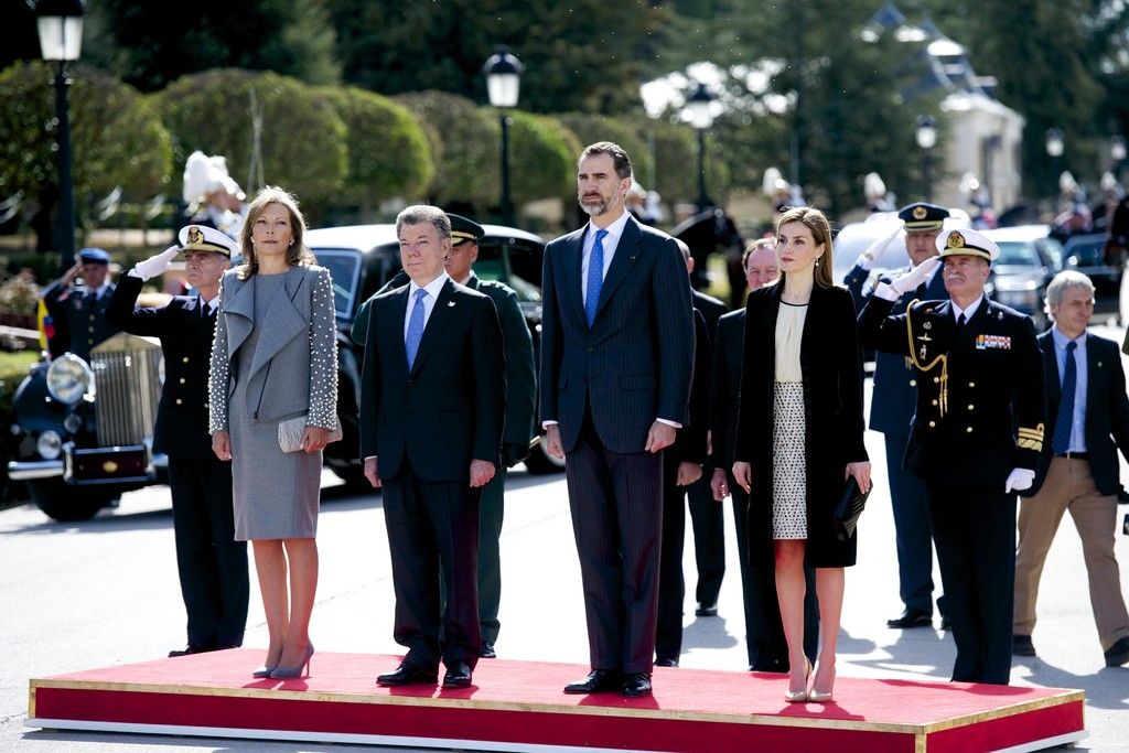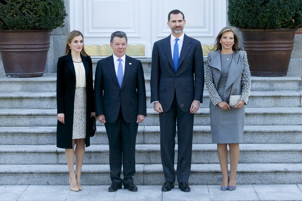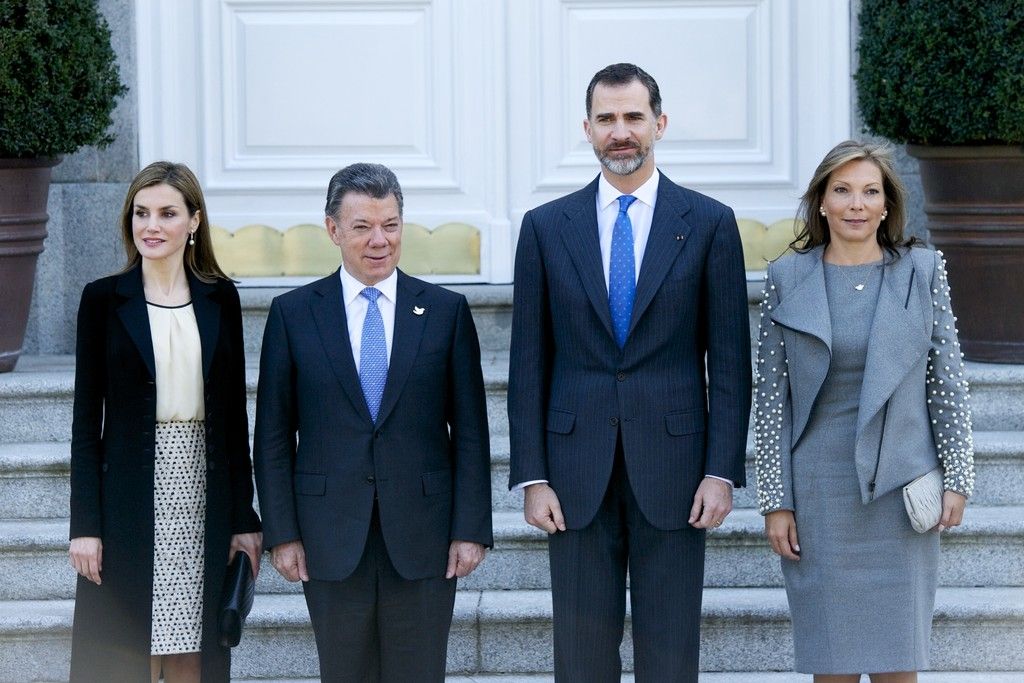 King Felipe VI of Spain and Queen Letizia of Spain receives the President of Colombia Juan Manuel Santos and Maria Clemencia Rodriguez de Santos at Zarzuela Palace on March 1, 2015 in Madrid, Spain.