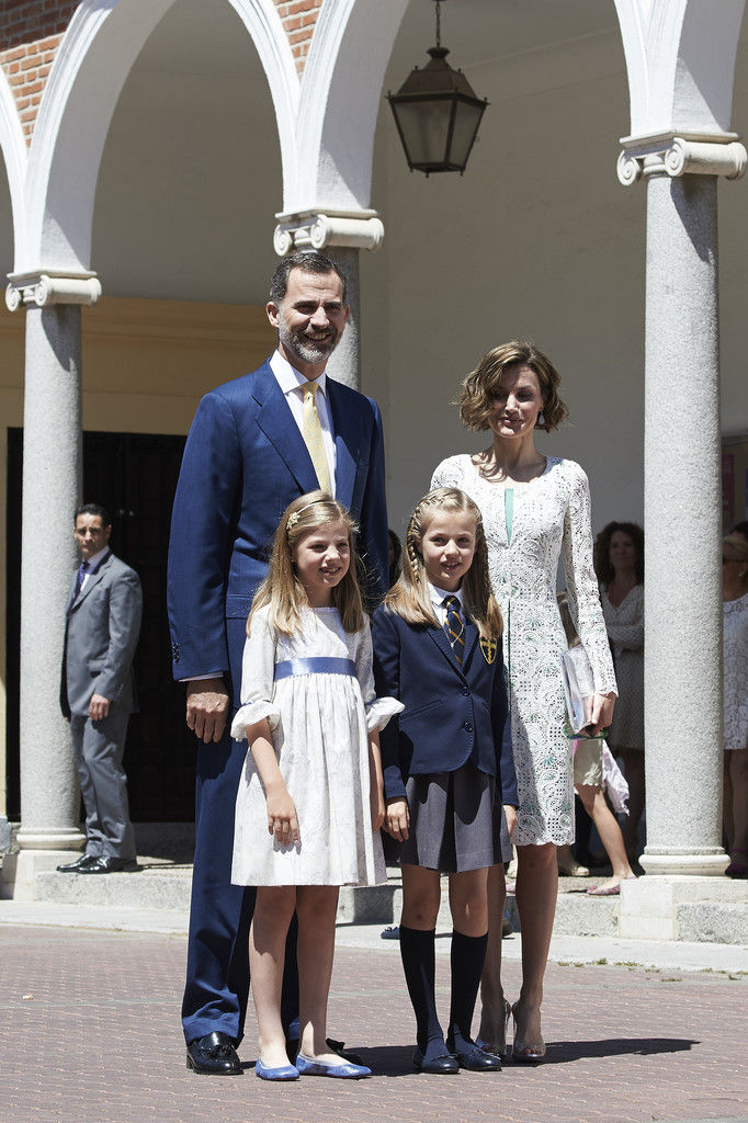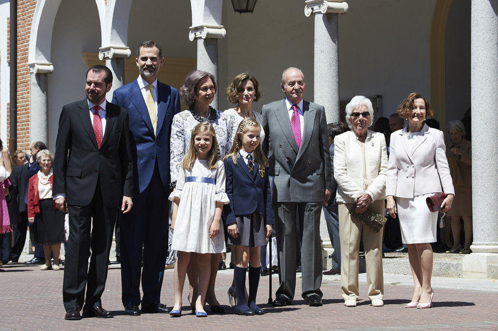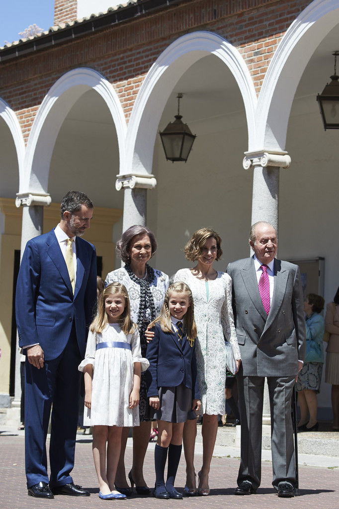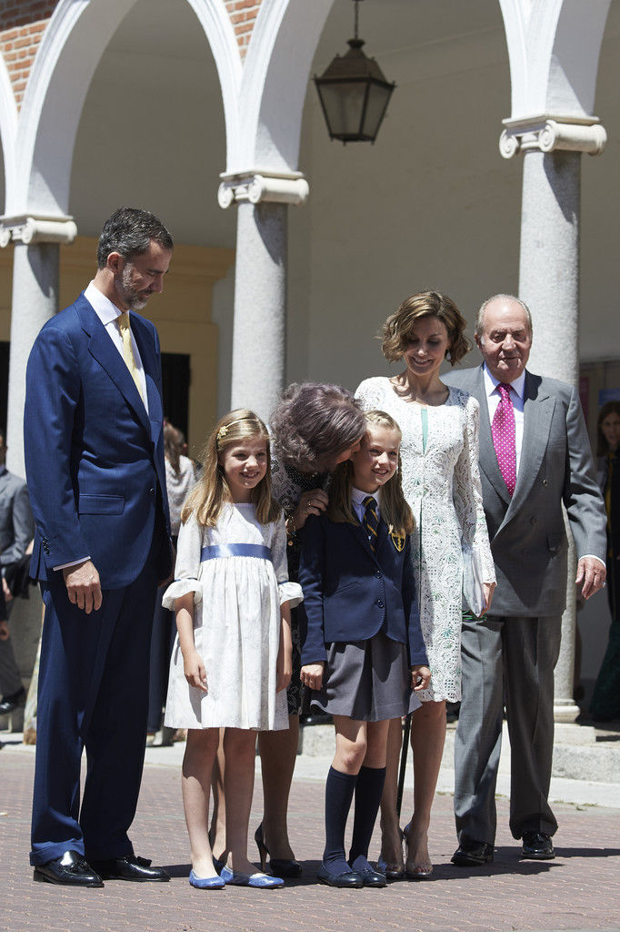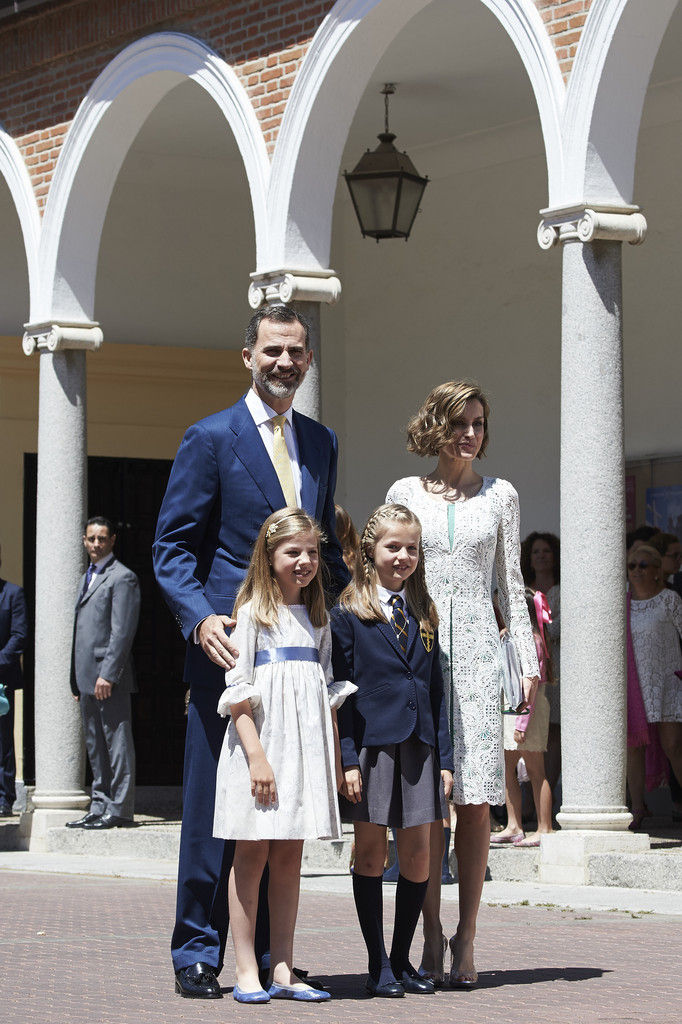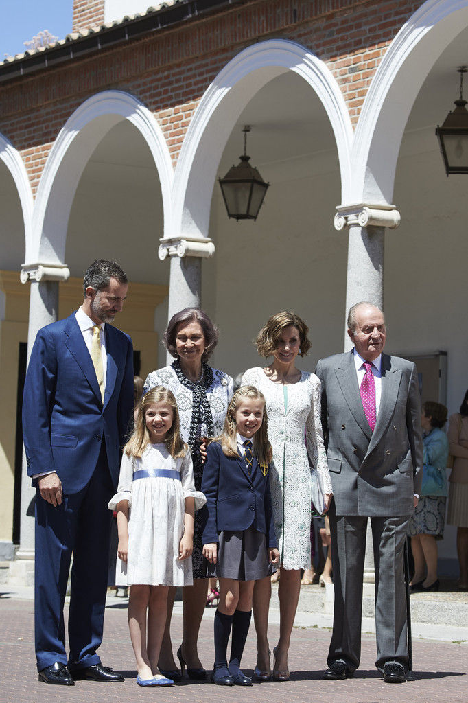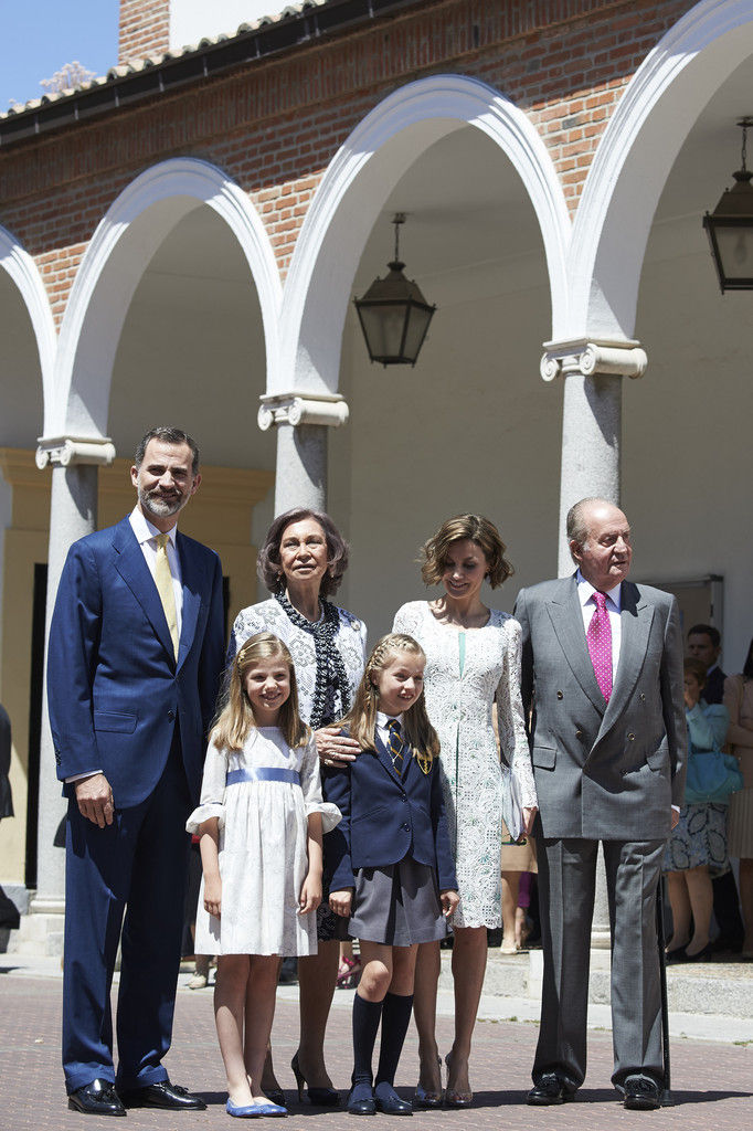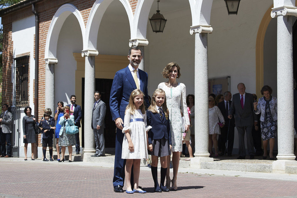 King Felipe VI of Spain, Princess Sofia of Spain, Princess Leonor of Spain and Queen Letizia of Spain pose for the photographers after the First Communion of Princess Leonor of Spain at the Asuncion de Nuestra Senora Church on May 20, 2015 in Madrid, Spain.