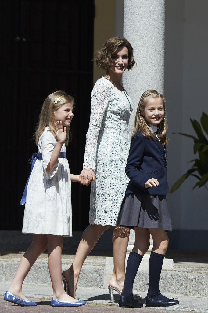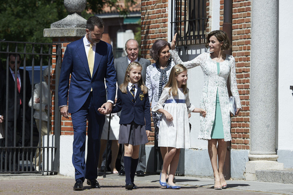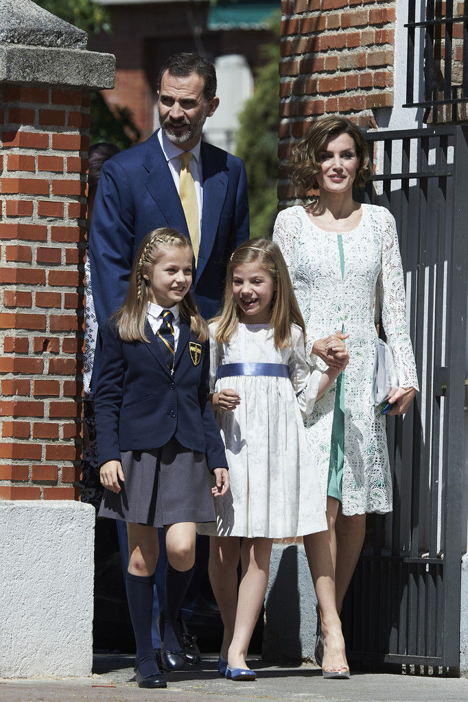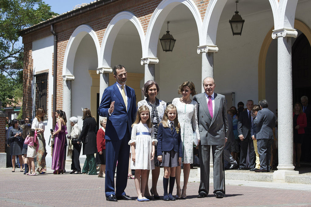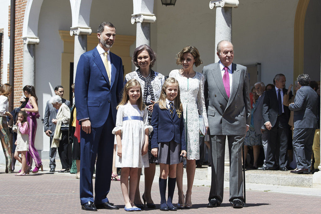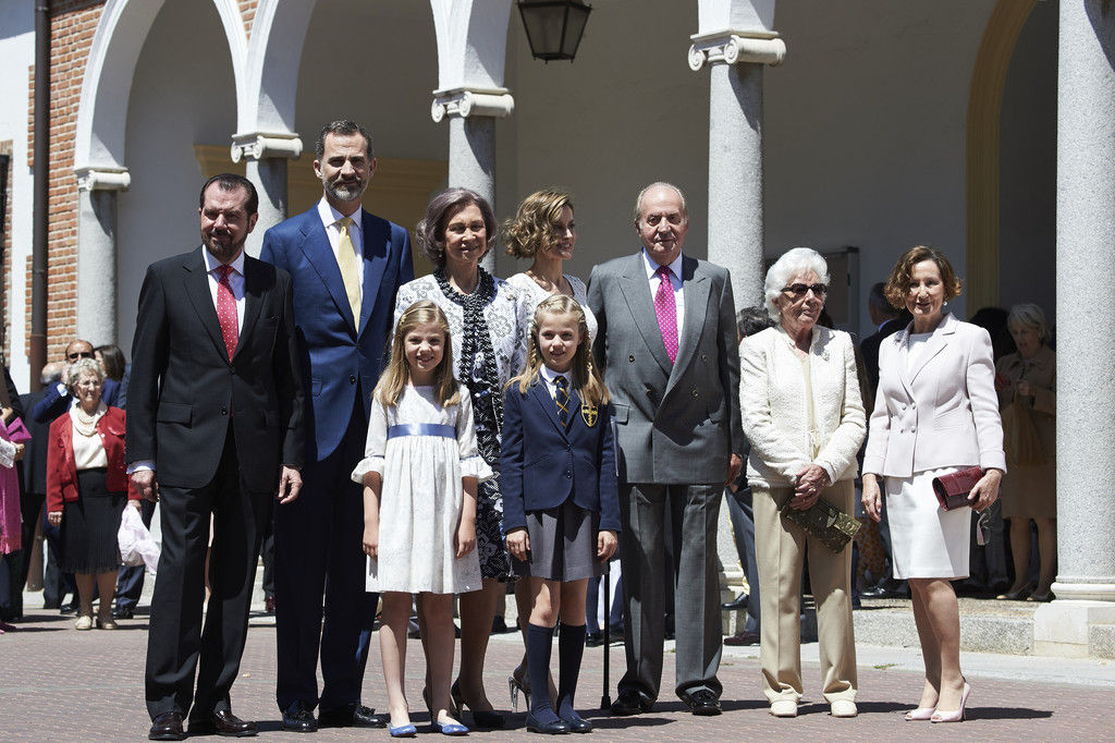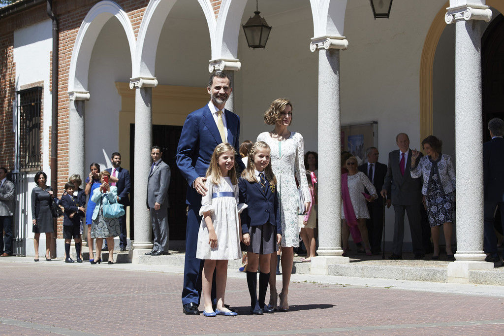 King Felipe VI of Spain, Princess Sofia of Spain, Princess Leonor of Spain and Queen Letizia of Spain pose for the photographers after the First Communion of Princess Leonor of Spain at the Asuncion de Nuestra Senora Church on May 20, 2015 in Madrid, Spain.