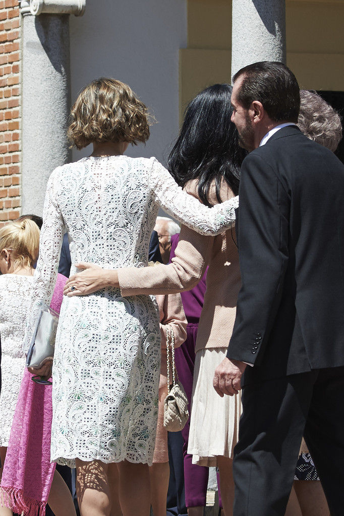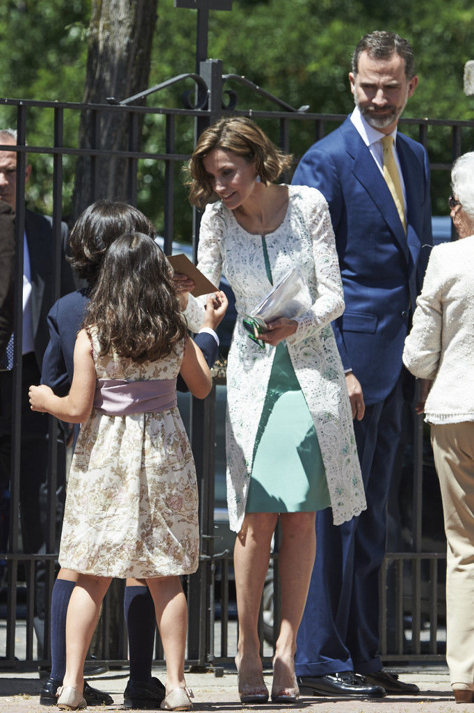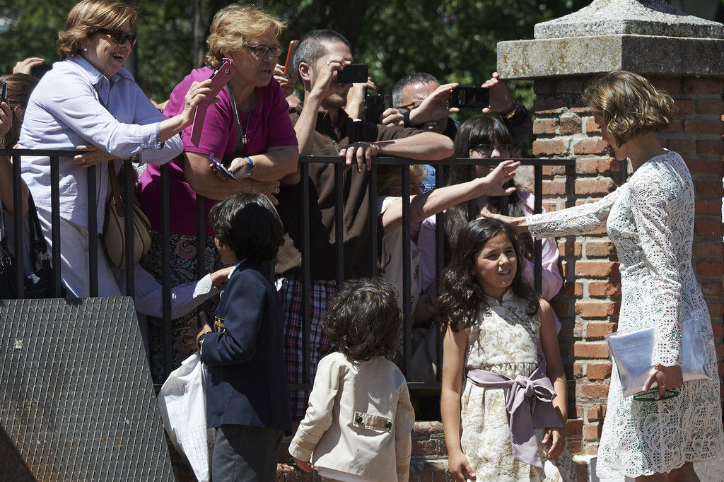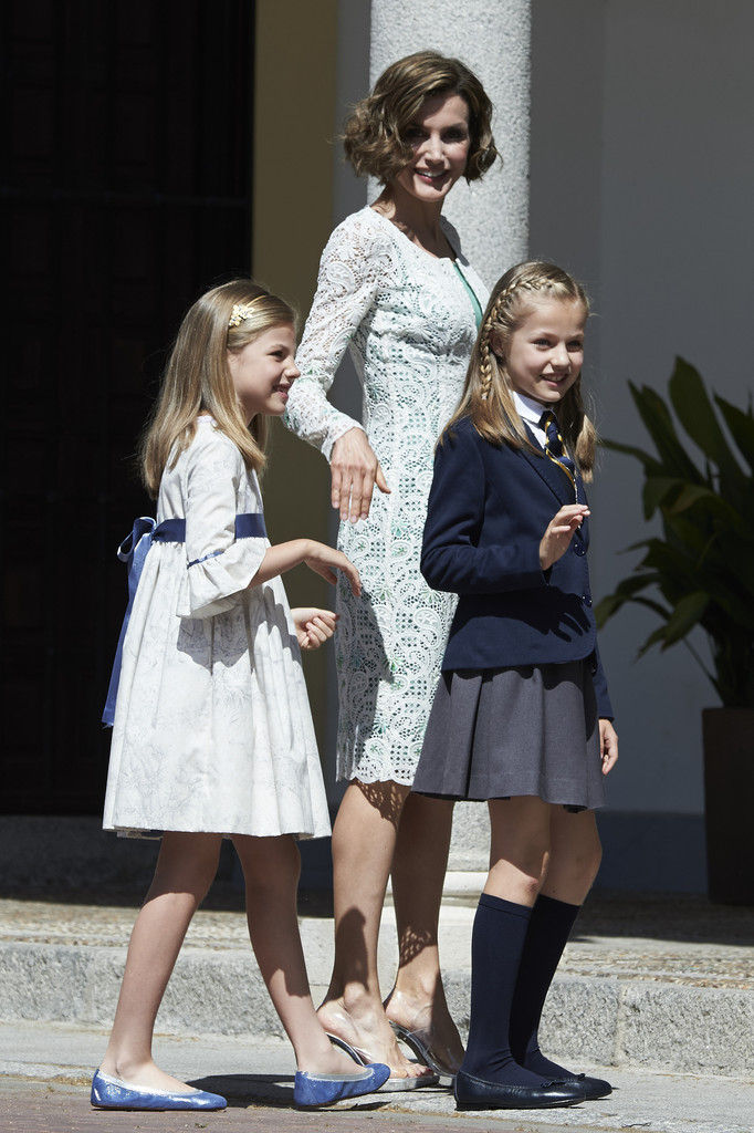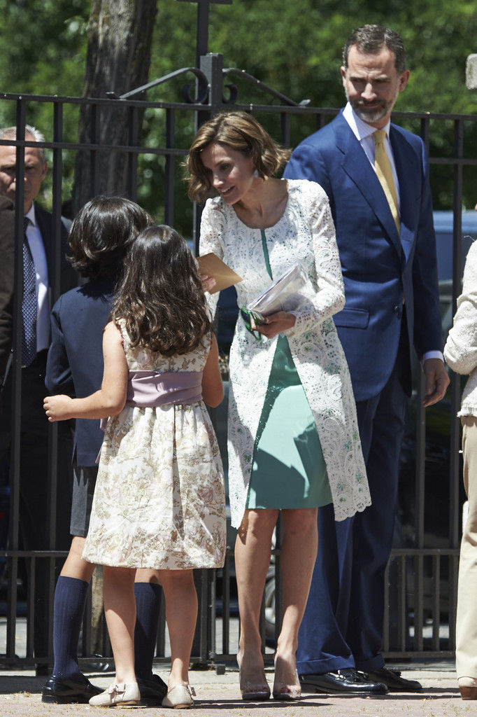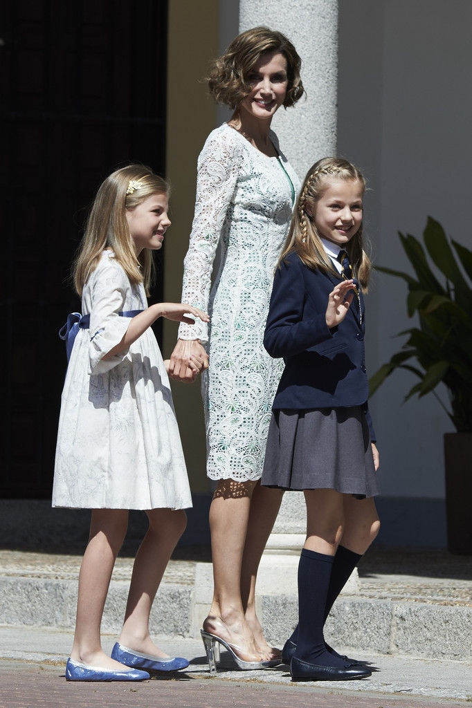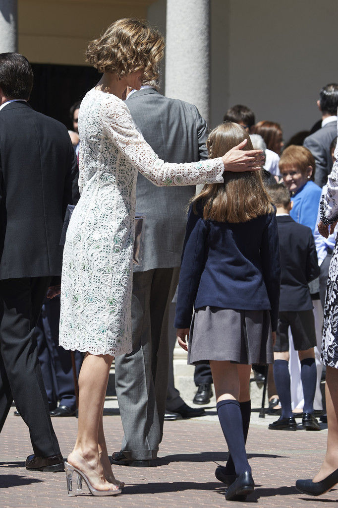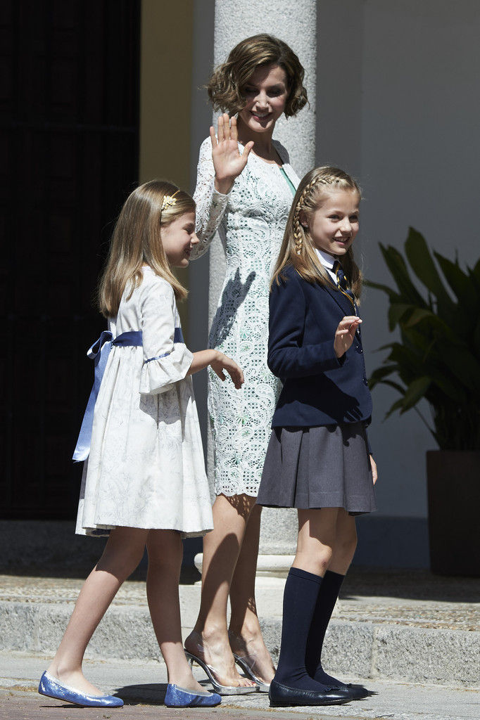 King Felipe VI of Spain, Princess Sofia of Spain, Princess Leonor of Spain and Queen Letizia of Spain pose for the photographers after the First Communion of Princess Leonor of Spain at the Asuncion de Nuestra Senora Church on May 20, 2015 in Madrid, Spain.
