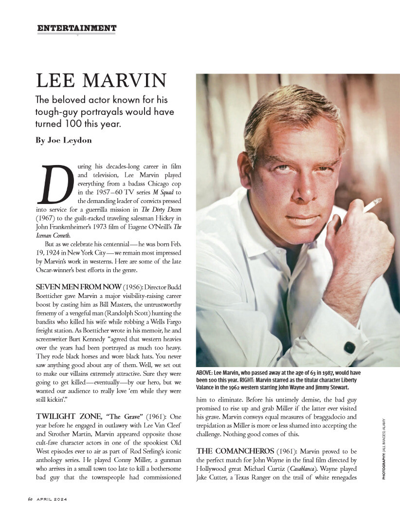 In the 1960s, Marvin was given prominent co-starring roles in such films as The Comancheros (1961), The Man Who Shot Liberty Valance (1962) (as the title villain), and Donovan's Reef (1963), all with John Wayne. Marvin also guest-starred in Combat! and The Twilight Zone.