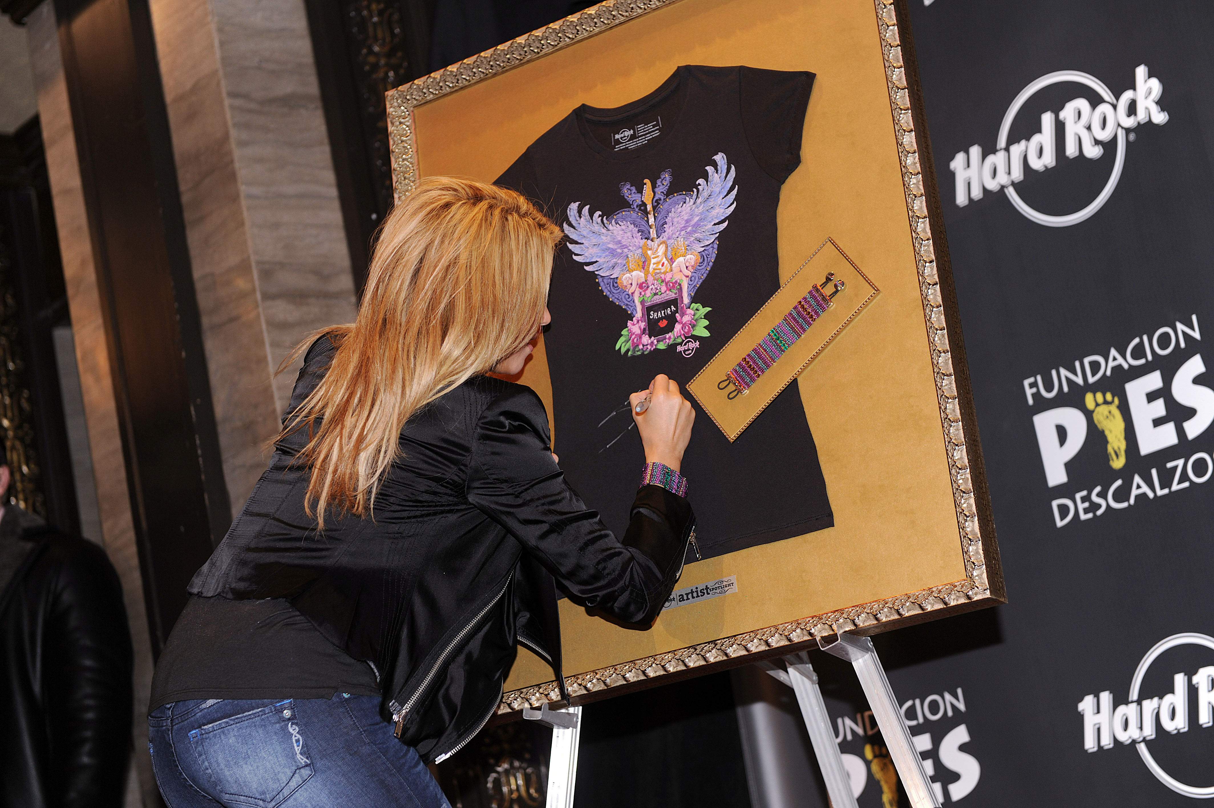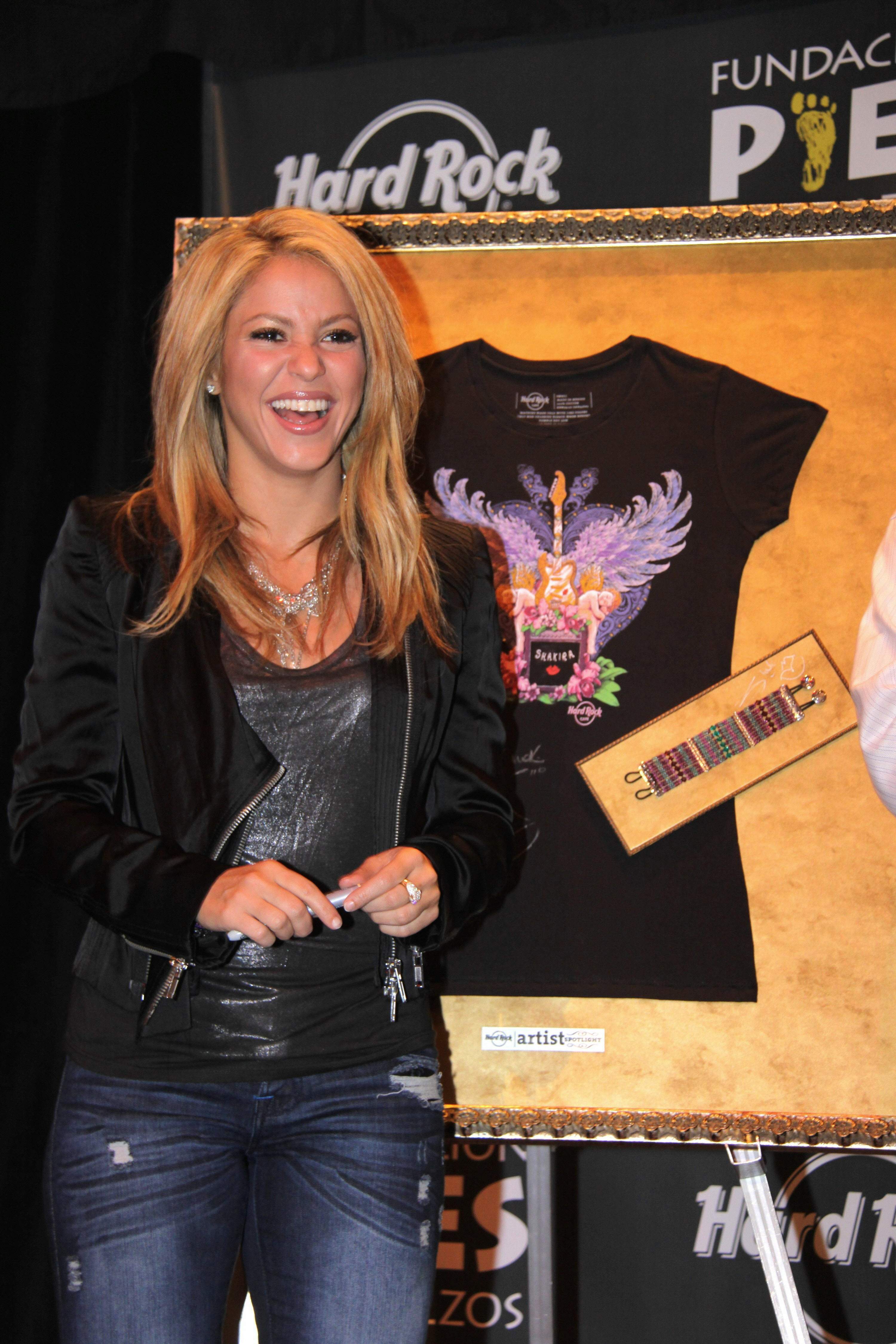 Shakira unveils her "She Wolf" T-shirt at the Hard Rock Cafe in Washington, DC, February 22