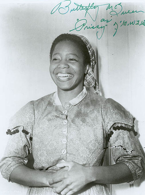 McQueen's first role would become her most identifiable —as Prissy, the young maid in Gone with the Wind, uttering the famous words: "I don't know nothin' 'bout birthin' babies!" She also played an uncredited bit part as a sales assistant in The Women, filmed after Gone with the Wind but released before it. She also played Butterfly, Mary Livingstone's maid in the Jack Benny radio program, for a time during World War II. She appeared in an uncredited role in Mildred Pierce (1945) and played a supporting role in Duel in the Sun (1946). By 1947 she had grown tired of the ethnic stereotypes she was required to play and ended her film career.
