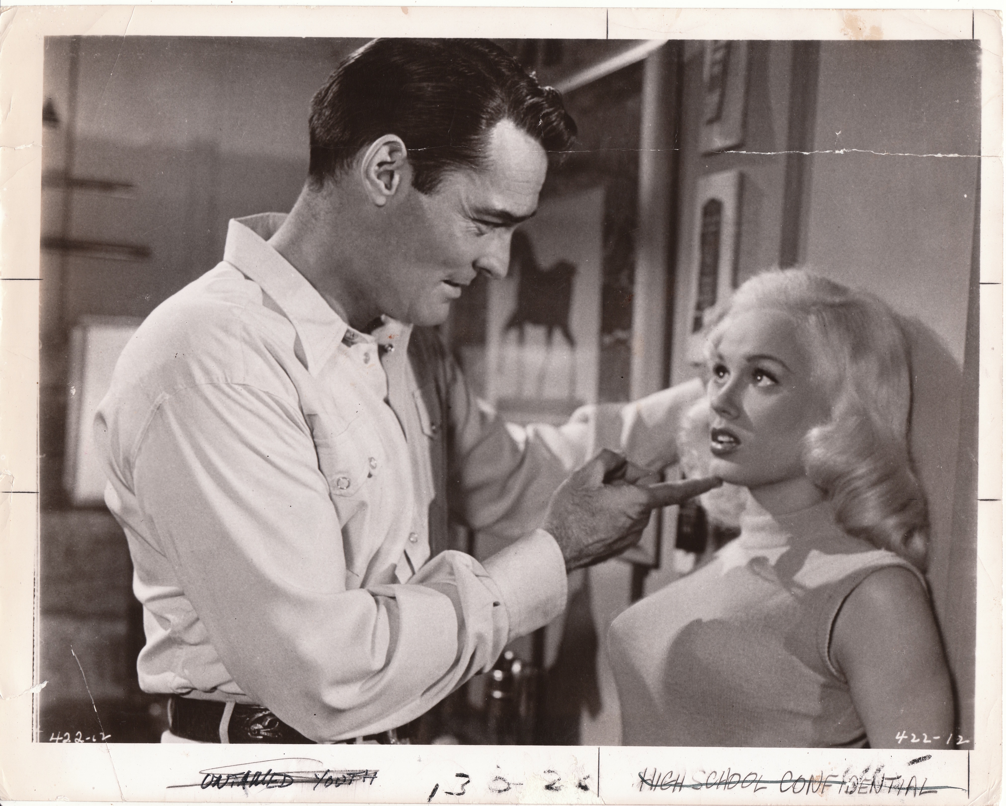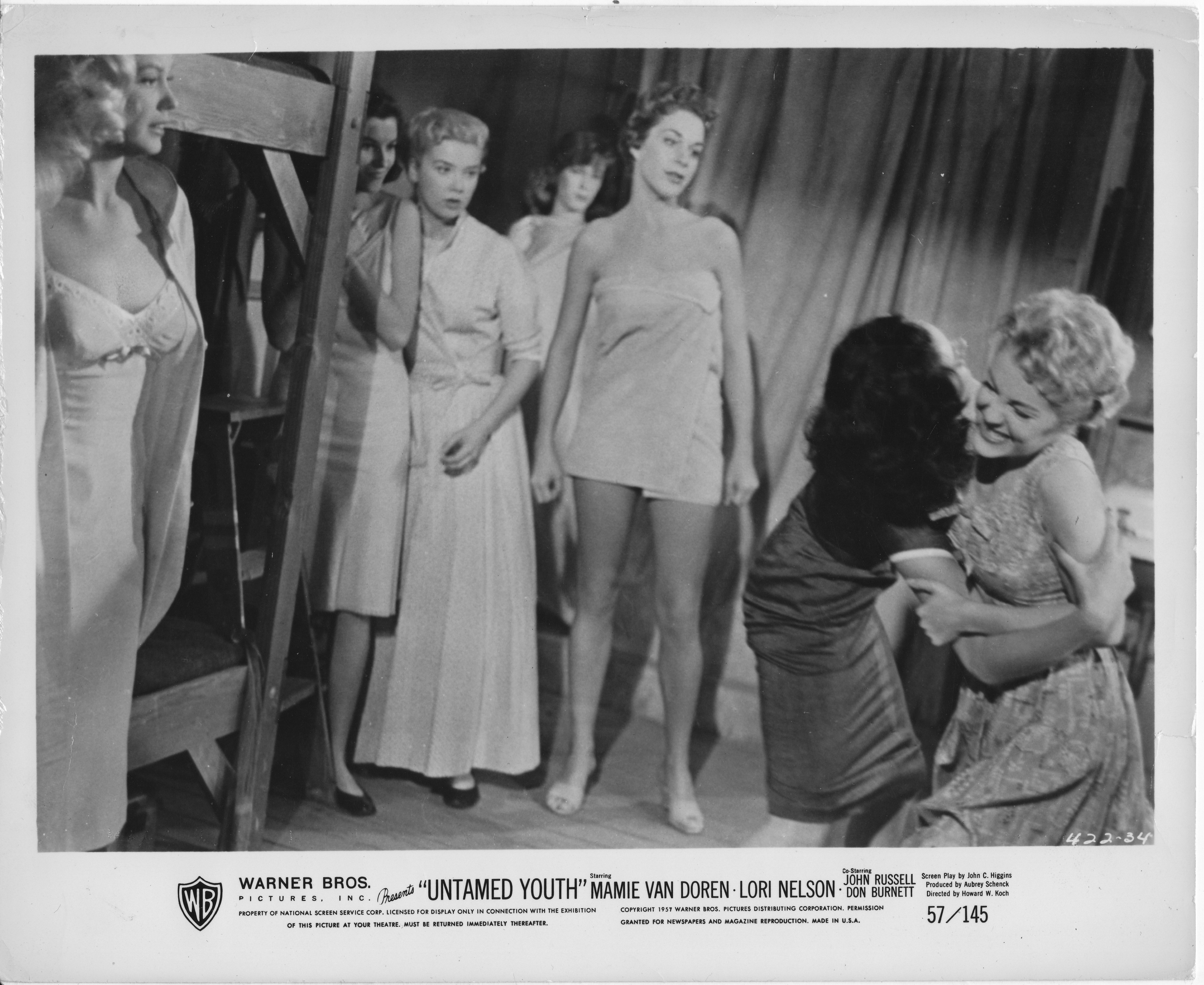 Some of Van Doren's more noteworthy movies include Teacher's Pet (1958) at Paramount, Born Reckless (1958) at Warner Bros., High School Confidential (1958), and The Beat Generation (1959), the latter two at MGM. But Van Doren was just as well known for her provocative roles. She was in prison for Girls Town (1959), which provoked censors with a shower scene where audiences could see Van Doren's naked back. As Eve in The Private Lives of Adam and Eve (1960) she wore only fig leaves, and in other films, like The Beautiful Legs of Sabrina (1959), Sex Kittens Go to College (1960) and Vice Raid (1960) audiences were clued in as to the nature of the films from the titles.