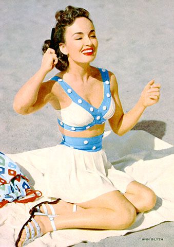 Having injured her back after Mildred Pierce, Blyth was not able to capitalize on its success completely, although she was still able to make a few films. She played the part of Regina Hubbard in Another Part of the Forest (a 1948 prequel to The Little Foxes), and achieved success playing a mermaid in Mr. Peabody and the Mermaid. Her other films include : Our Very Own (with Farley Granger), The Great Caruso (with Mario Lanza), One Minute to Zero (with Robert Mitchum), The World in His Arms (with Gregory Peck), Rose Marie, The Student Prince, Kismet, The Buster Keaton Story, and The Helen Morgan Story (with Paul Newman). Even though her voice was more like the original Helen Morgan, her vocals were dubbed by Gogi Grant, a popular singer at the time. That soundtrack was much more successful than the film itself.