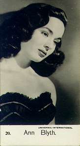 Blyth was born in Mount Kisco, New York, to parents who divorced shortly after her birth. She was raised a devout Roman Catholic by her mother. Blyth began her acting career initially as "Anne Blyth," changing the spelling of her name back to the original (Ann) at the beginning of her film career. Her first acting role was on Broadway in Watch on the Rhine (from 1941 until 1942). She was signed to a contract with Universal Studios, and made her film debut in Chip Off the Old Block in 1944. In musical films such as Babes on Swing Street, and Bowery to Broadway (both 1944), she played the part of the sweet and demure teenager.