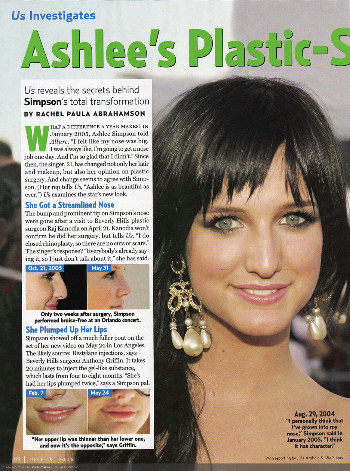 Early on April 21, a source says, Ashlee, 21, arrived at the office of famed Beverly Hills plastic surgeon Dr. Raj Kanodia with her parents, Joe and Tina, for a nose job. "Afterward, her parents helped her into a waiting SUV," says the source. And as pictures taken just a week later show, the change is dramatic. "Her nose is thinner and more feminine," says NYC-based plastic surgeon and rhinoplasty specialist Dr. Geoffrey Tobias, who hasn't treated Ashlee. In other words, more like Jess'.