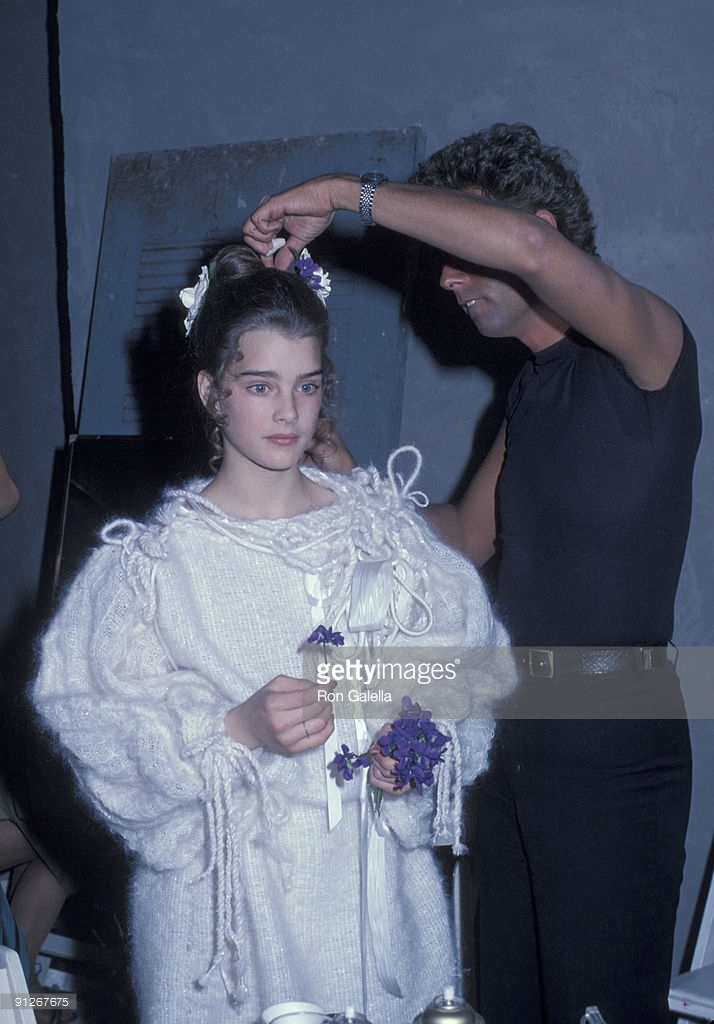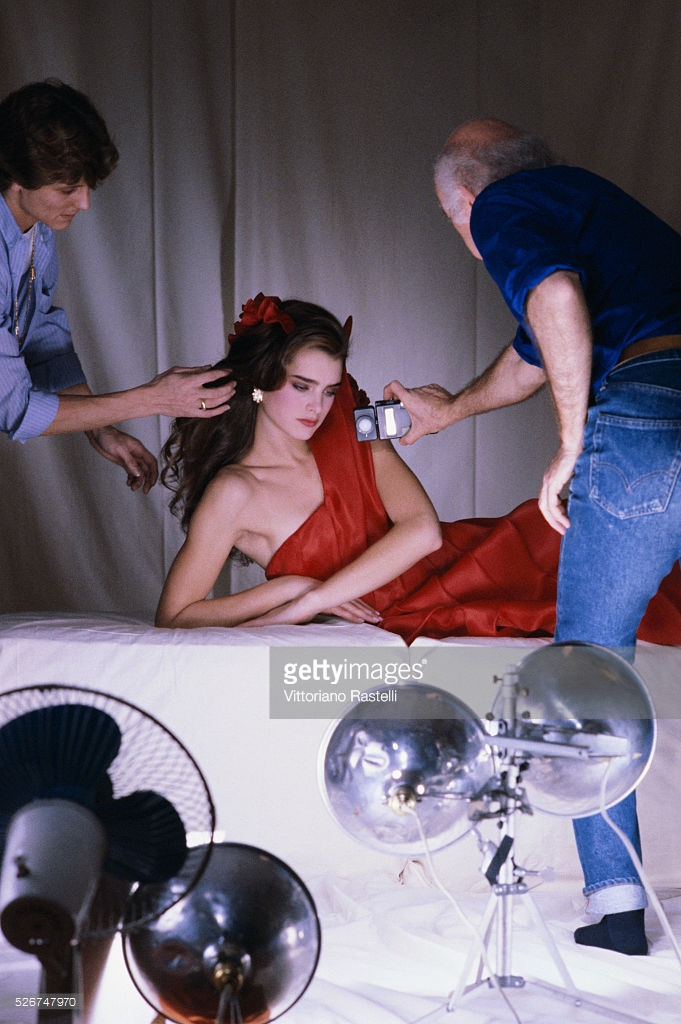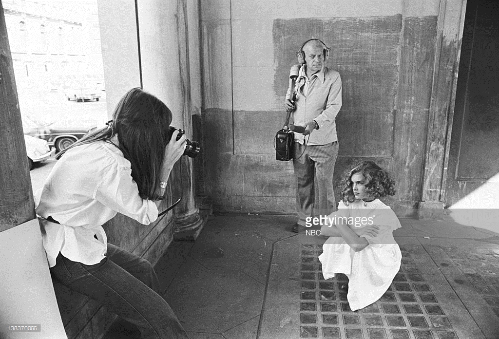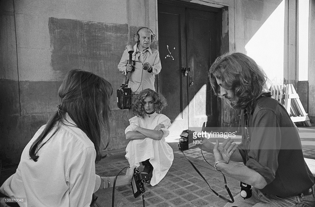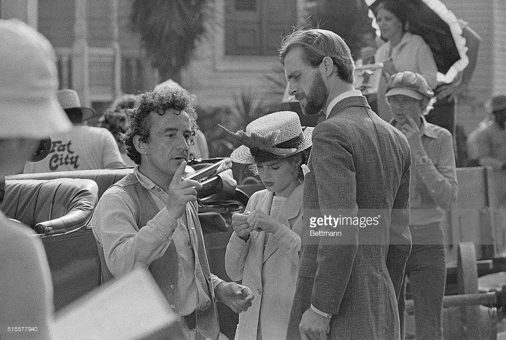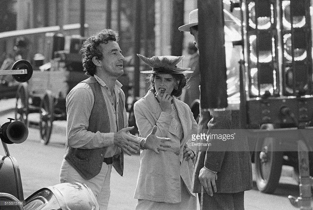 Louis Malle directs Brooke Shields and Keith Carradine in Pretty Baby. Shields made her movie debut at age 11 in this story of a child prostitute, Malle's first film made in America. New Orleans, 1977.
