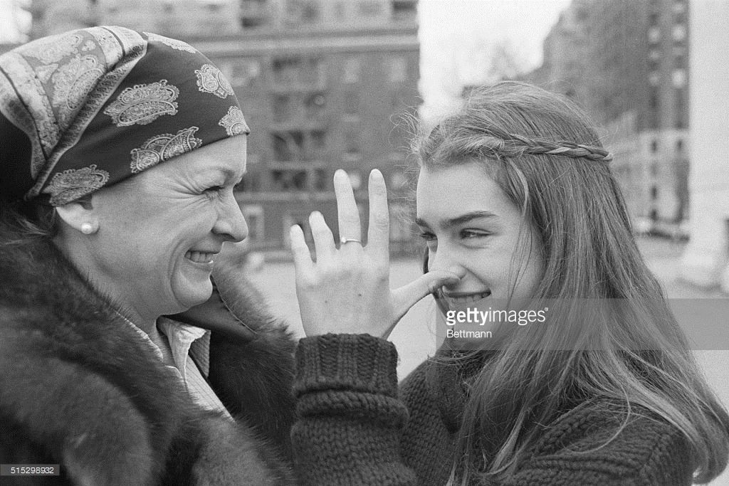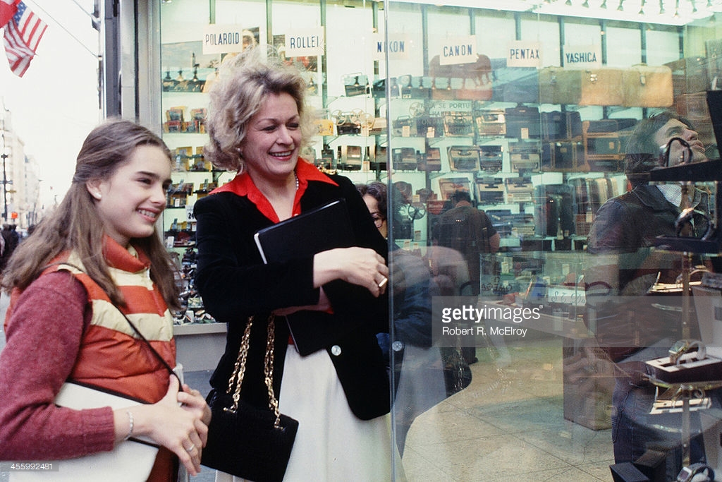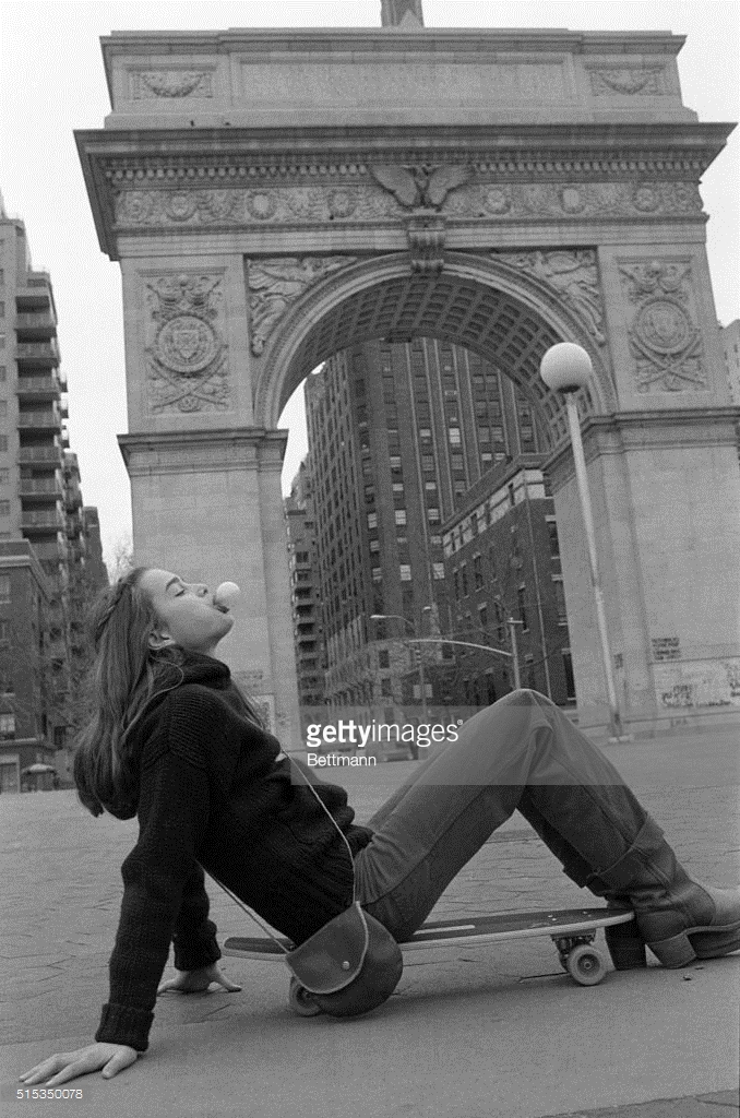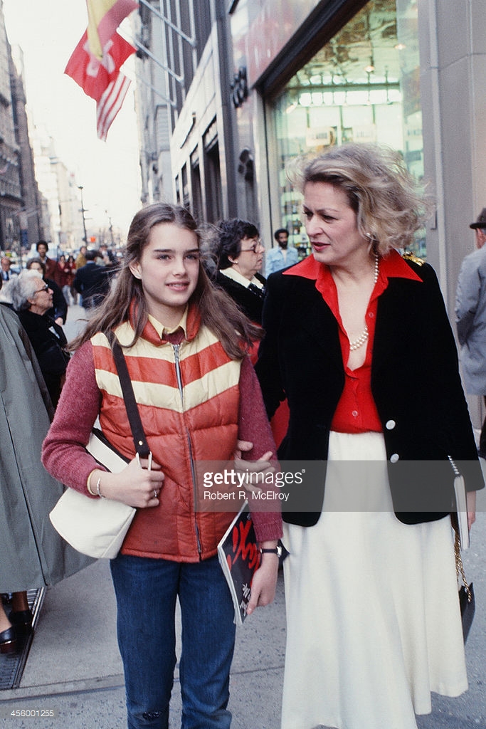 (Original Caption) New York: 12 Year old actress model, Brooke Shields, who in her short two year career in films has managed to play roles of a pinball addict in soon to be released film, Tilt, a prostitute with nude scenes with Keith Carridine in recently released, Pretty Baby, and now a gypsy bride in currently made picture in New York City entitled, King of the Gypsies, starring opposite Sterling Hayden and Shelly Winters. Brooke is pictured in Mme. Campanella Bridal Aisle Shop, in New York City, trying on a traditional wedding gown, which retails for $350. (She is assisted by Ms. Mary Lee). Brooke, playing on a skateboard which she uses during film in hospital sequence. Brooke and mother, Teri, clowning and keeping warm in New York City's Washington Square Park.