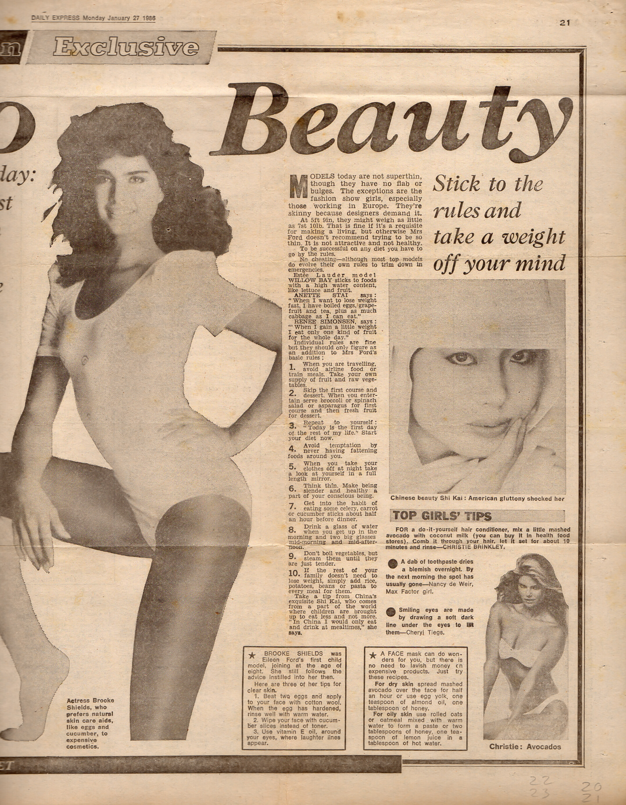 "THE Fast Lane to Beauty" - Daily Express U.K. 27. January 1986 - also showing Renée Simonsen, Christina Ferrare, Anette Stai, Shi Kai, Christie Brinkley
