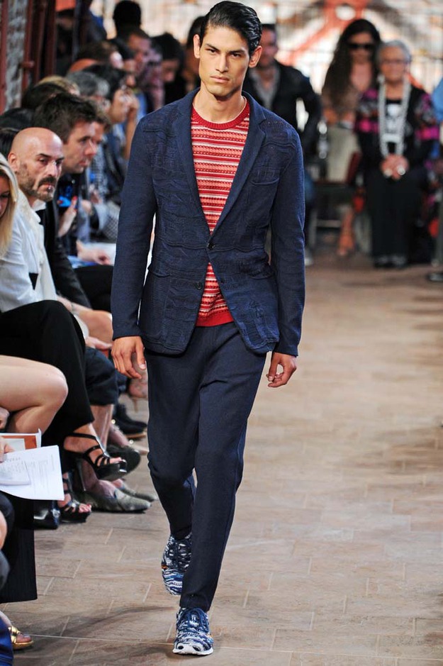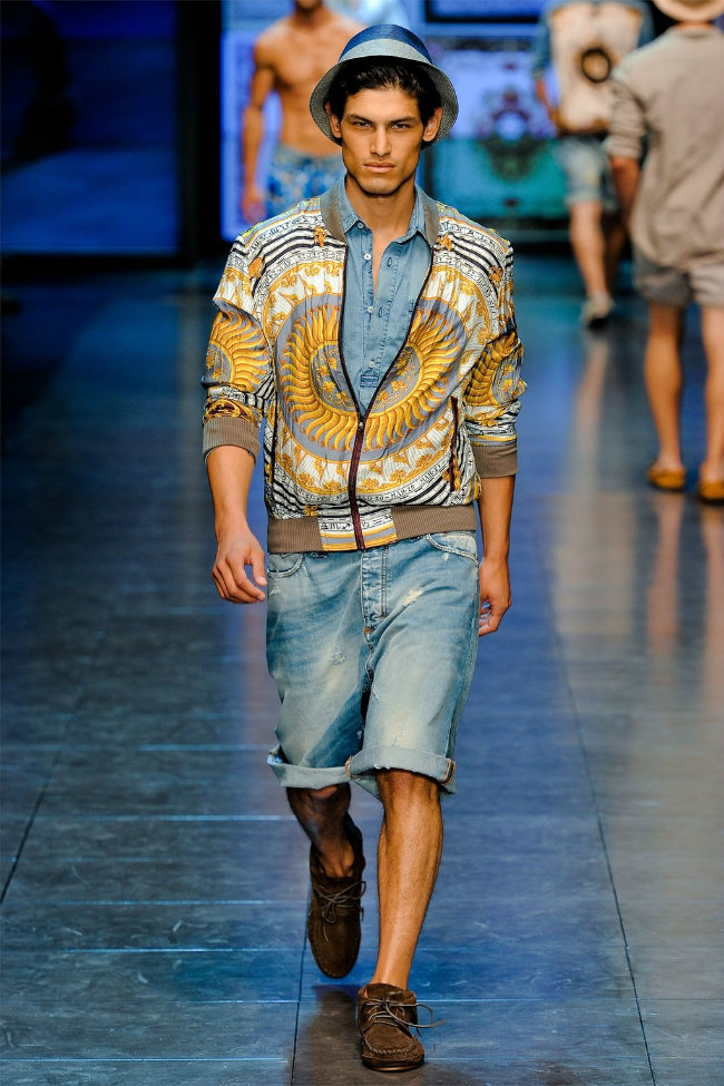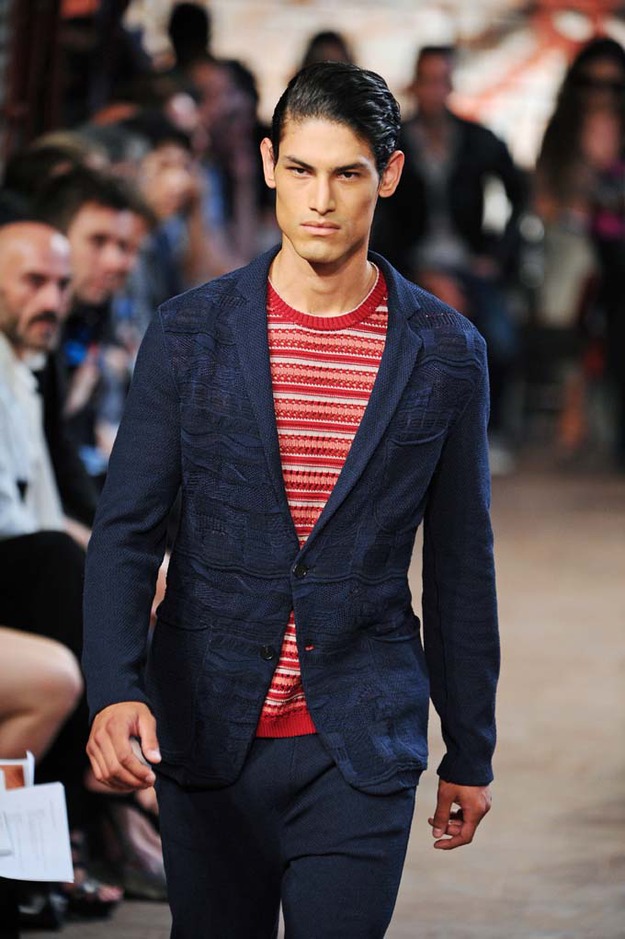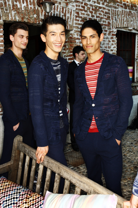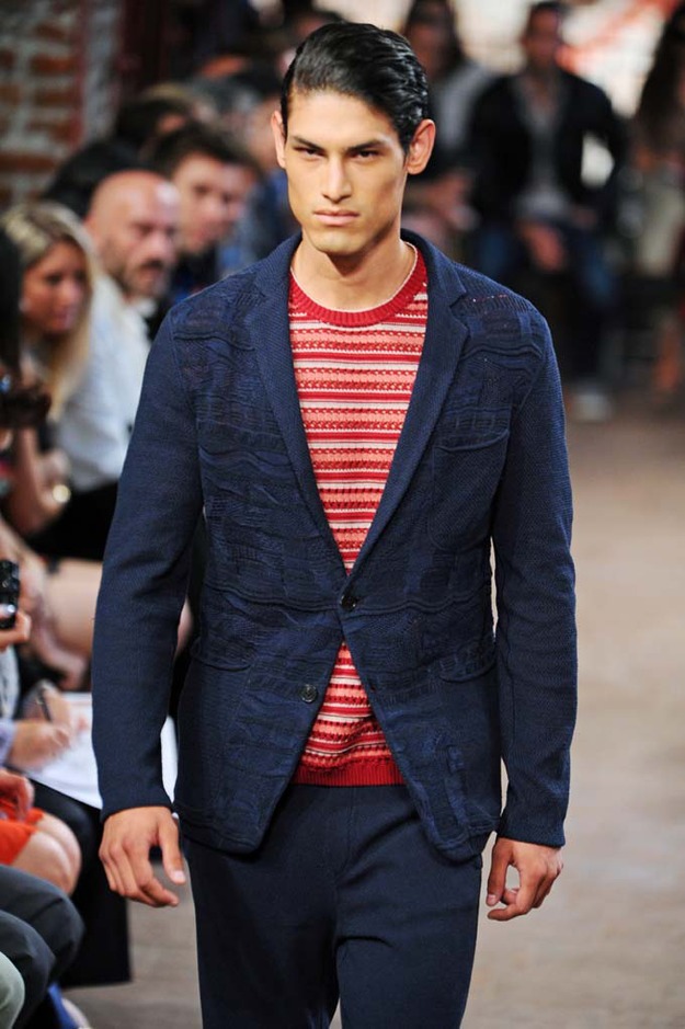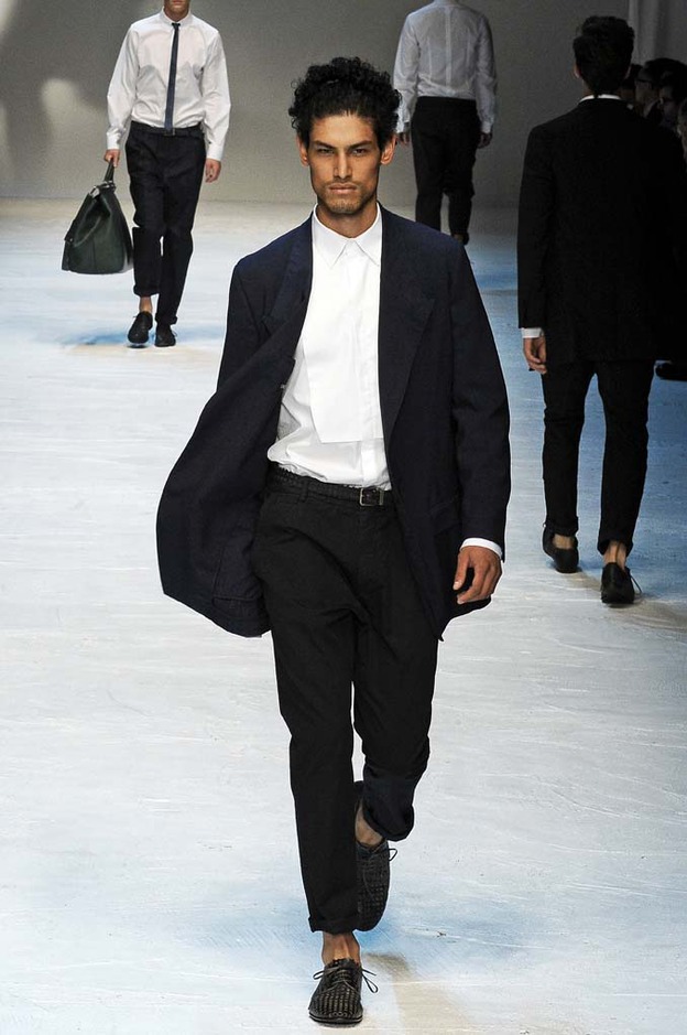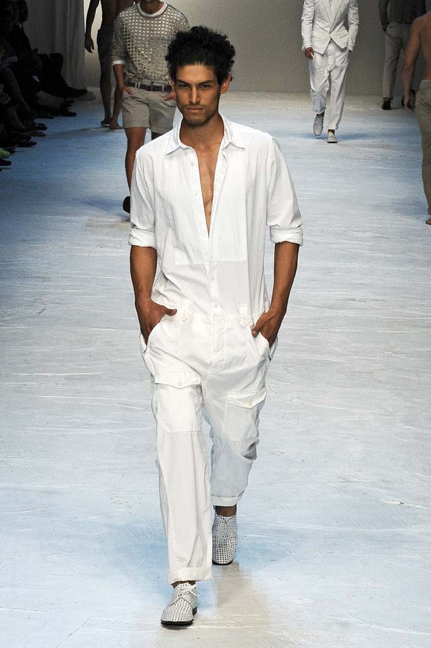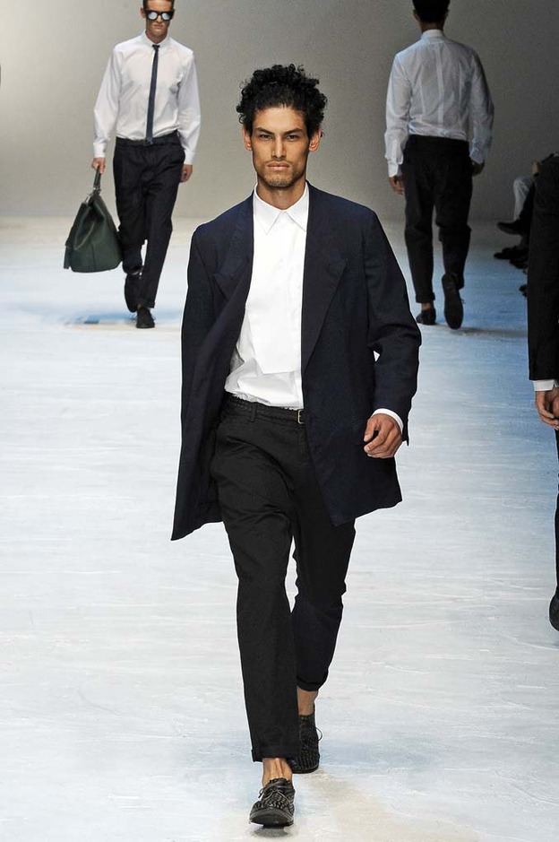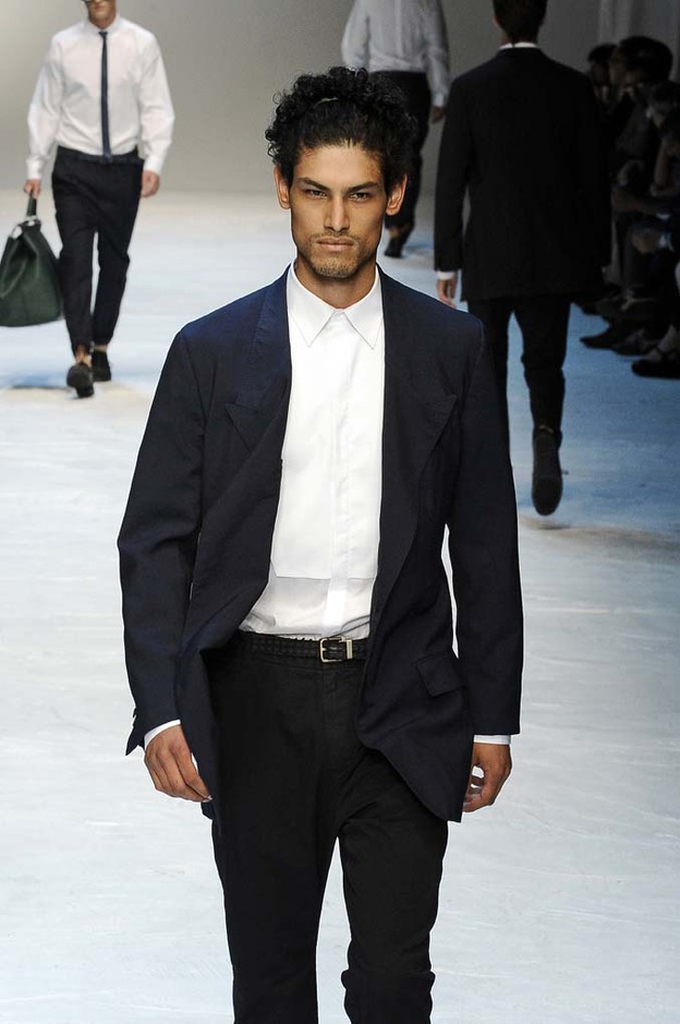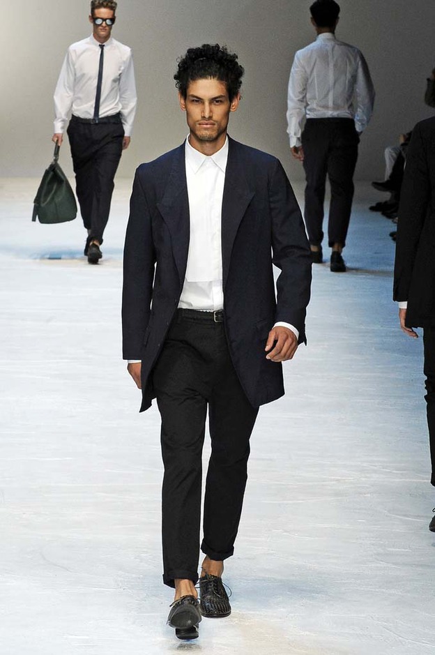 The spirit of James Dean watched over Michael Bastian’s showing of his Spring 2012 collection—literally. With a faint outline of one of Dean’s most iconic images as the backdrop, Bastian opened with a model who served as the gone-too-soon actor’s doppelganger: his hair tousled, he slouched down the runway, darting his bespectacled eyes from side to side with a wounded look, in a red canvas windbreaker that mimicked Dean’s famous look from “Rebel Without a Cause.” The rest of the collection followed similar lines, without quite as much literalness; the Michael Bastian customer expects the grown-up glen plaid suits and sharp tuxedo jackets with an edge that were shown along with the repurposed and modernized preppy sportswear that seemed more in keeping with the youthful attitude of the star of “East of Eden.” This was an assured and coherent outing from a designer who is known for his mining of mid-century Americana, with clean pieces in bright colors that were luxurious to the touch if unsurprising visually. It takes a certain kind of man to wear Michael Bastian, one who is confident in his own style and knows what works and has the courage to stick with it.