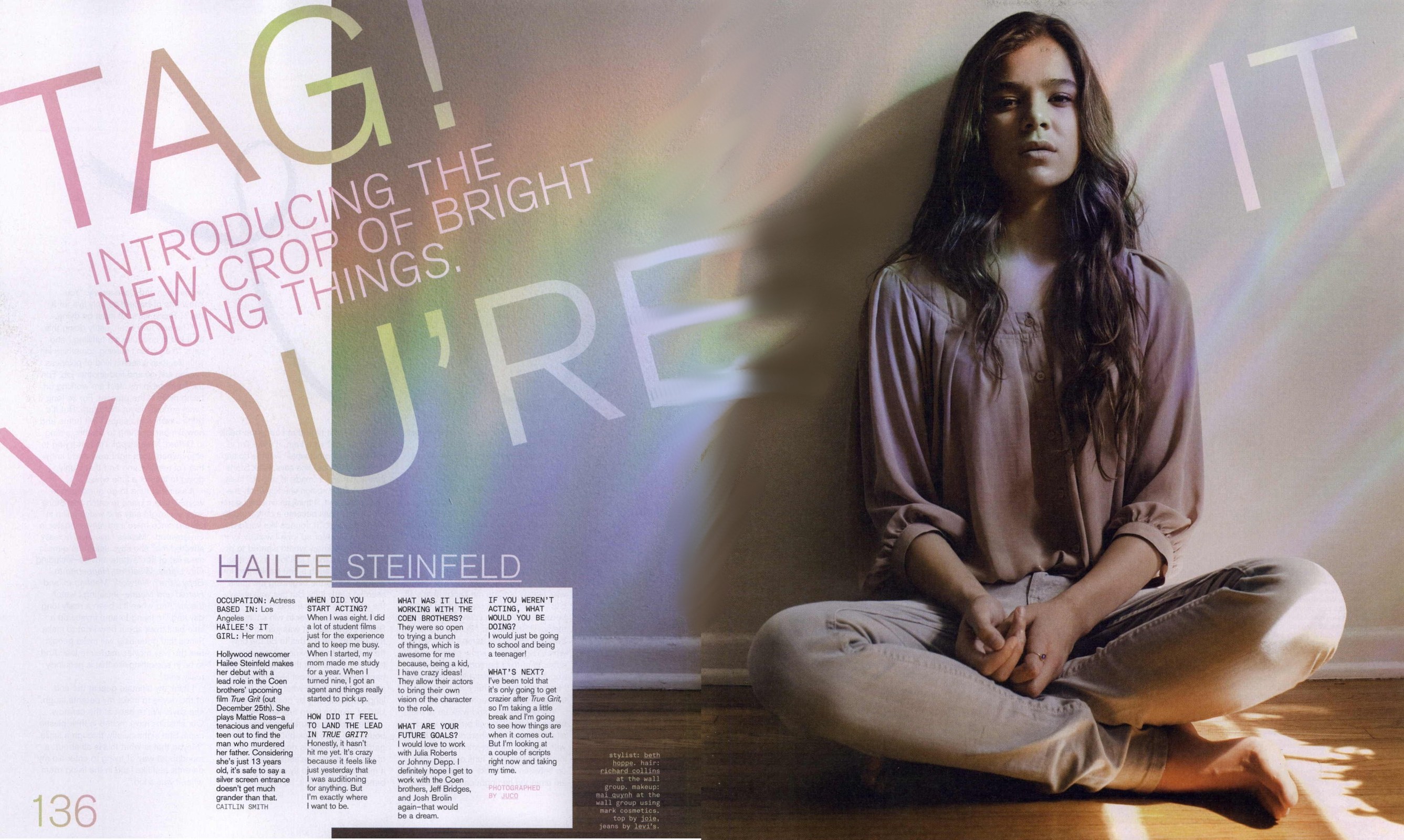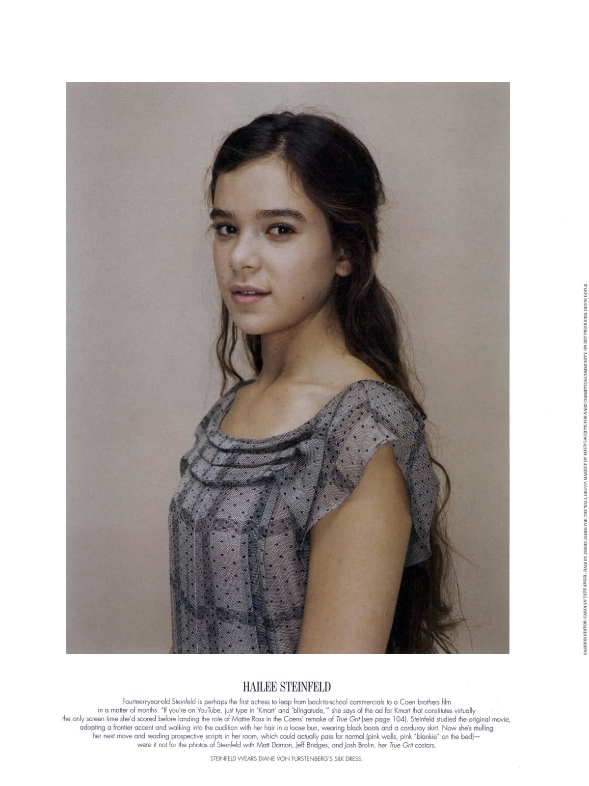 Waiting on a Paramount lot dressed in Salvation Army clothes and a skirt her mother had made, Los Angeles native Hailee Steinfeld was in full character as Mattie Ross, the determined young heroine of the classic 1969 Western True Grit, which is getting a re-do from Joel and Ethan Coen (Fargo, No Country for Old Men). Steinfeld, a child model, beat out nearly 15,000 girls for her first major role, opposite Jeff Bridges as the reluctant hero Rooster Cogburn (the part that won John Wayne his only Oscar), Matt Damon as his rival, and Josh Brolin as the heavy. “Just watching them taught me a lot,” says Steinfeld, who turns 14 this month. “I learned more from their actions than from their words.” Her on-set education was not entirely age-appropriate, however—she learned not only how to fire a gun but also how to hand-roll a cigarette. “Jeff gave me this little tip on how to make it easier, and I would go home and just constantly roll cigarettes all night.” How did being in a major movie affect the routines of teenage life for Steinfeld? For one thing, it meant no texting. “We were in a very remote location and I never got service,” she says. “It was kind of a bummer, but it made me focus more on school.” What is it like seeing herself on-screen? “I ask other actors that question, and they always say, ‘I'm not watching myself; I'm watching someone else.’ So I try to watch myself like that, but it's weird. I think it's something I have to get used to.”