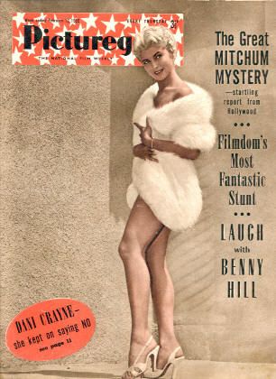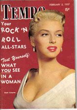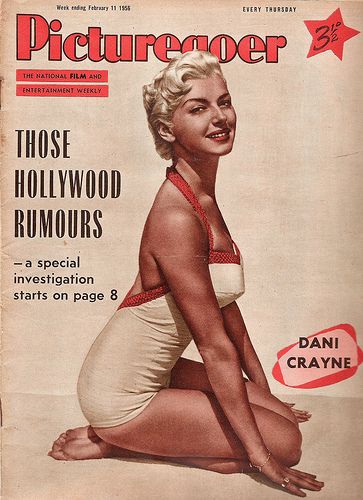 January 1957 is pictured wearing a swimsuit of nude cotton overlaid with white fishnet, complete with matching fringed poncho, designed by Nettie Rosenstein