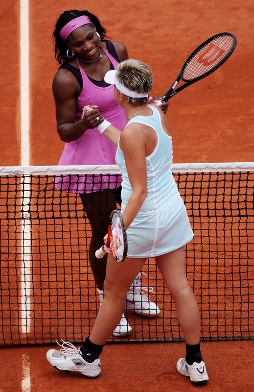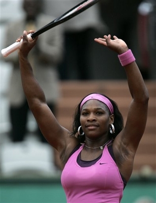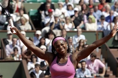 United States's Serena Williams serves the ball to Russia's Dinara Safina during their fourth round match of the French Open tennis tournament at the Roland Garros stadium in Paris, Sunday June 3 , 2007. (AP Photo/Francois Mori)