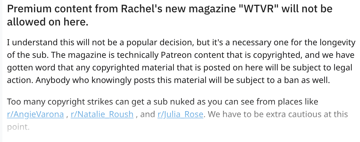Yeah we got contacted by one of the photographers Rachel works with and he pointed out that posting Patreon (WTVR) content will lead to trouble with Rachel's legal team.