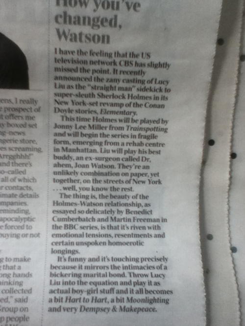 If they’re very clever, they’ll make Joan Watson the main character of the show rather than Holmes - that’ll put a kick in the expectations, while remaining true to ACD, won’t it just? But I highly doubt it. And that’s sad.