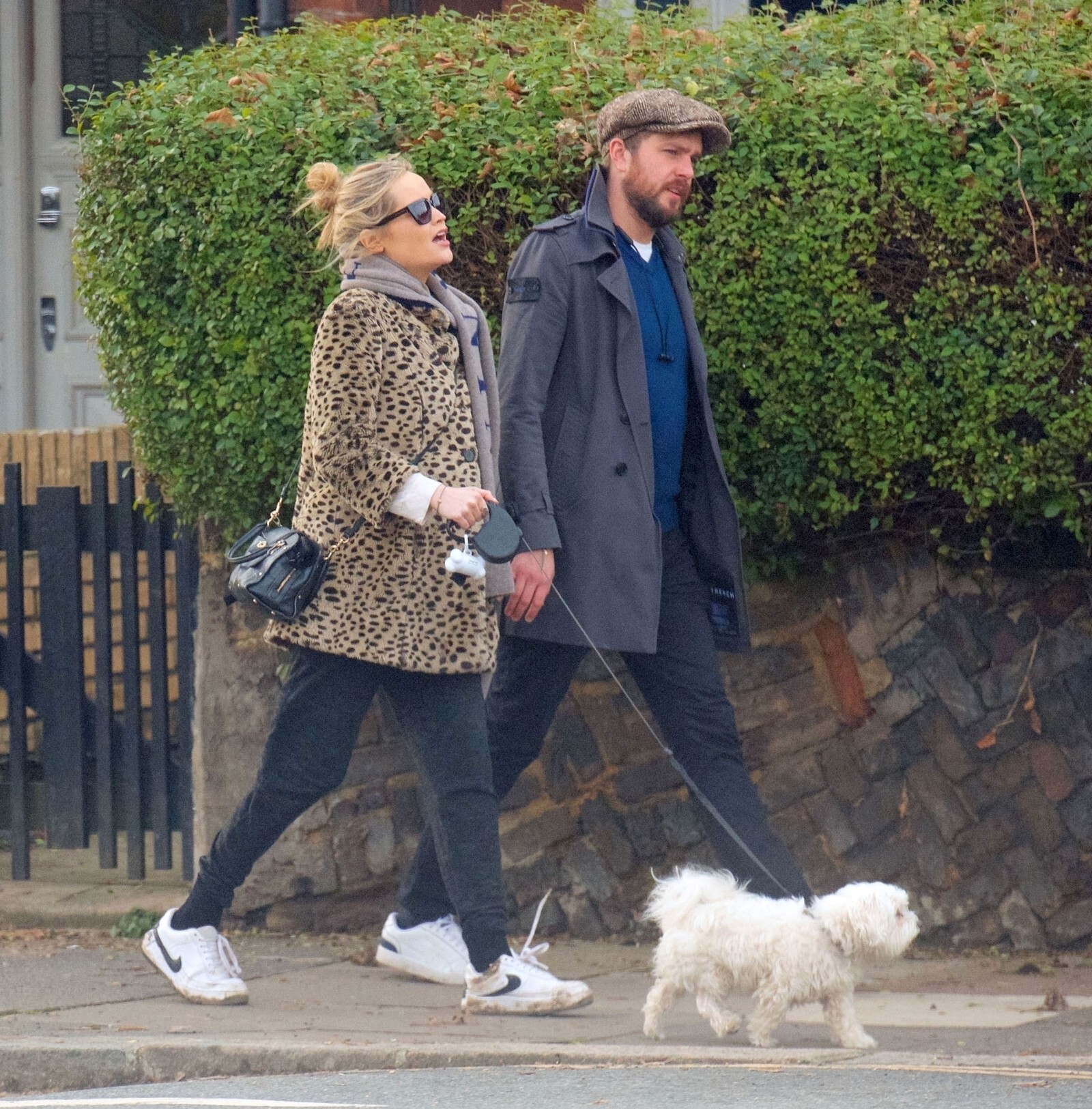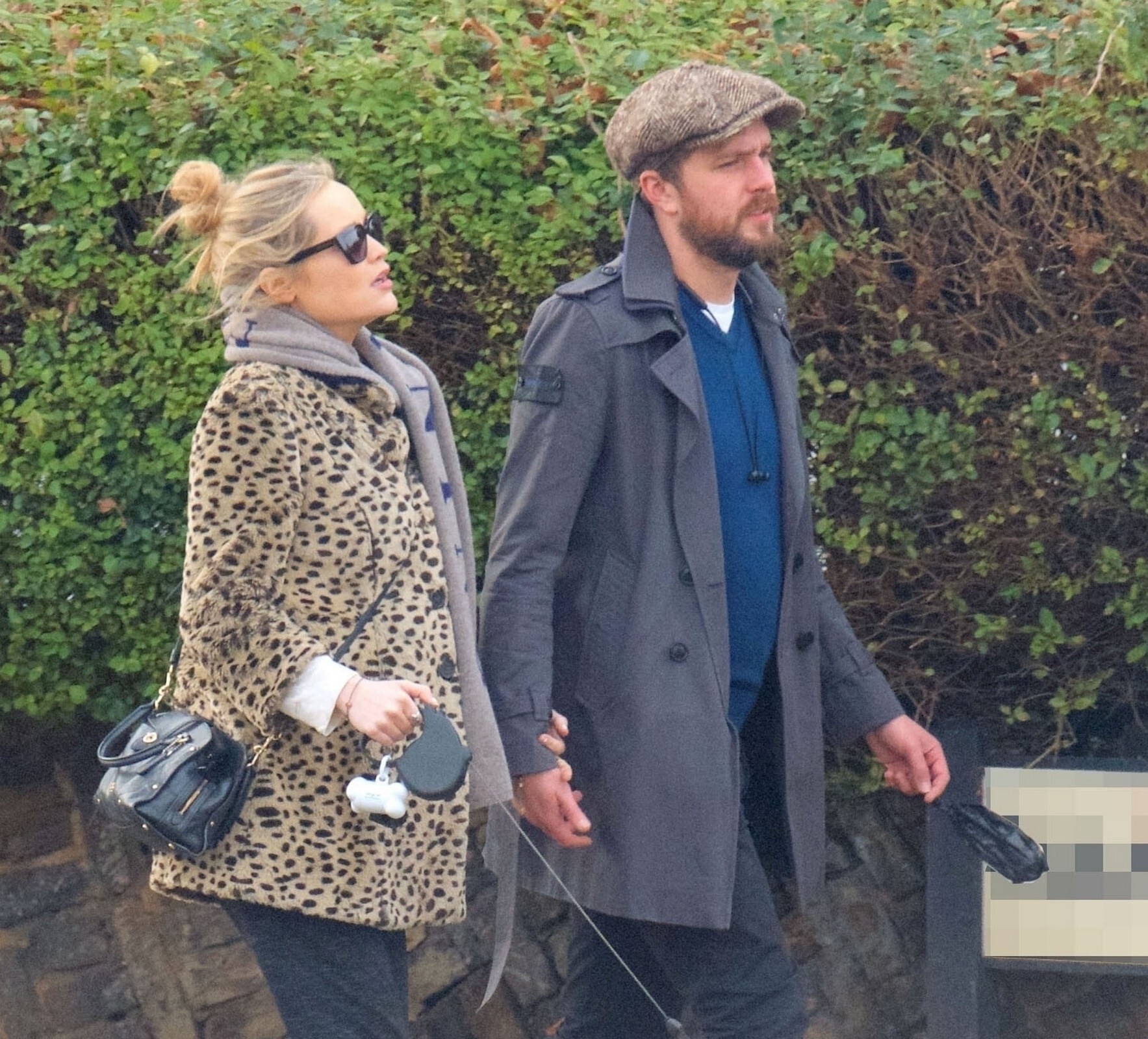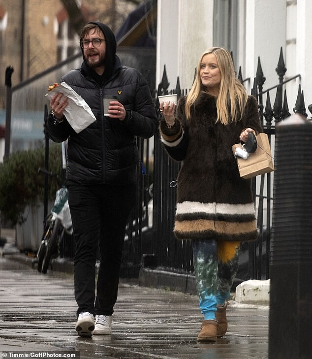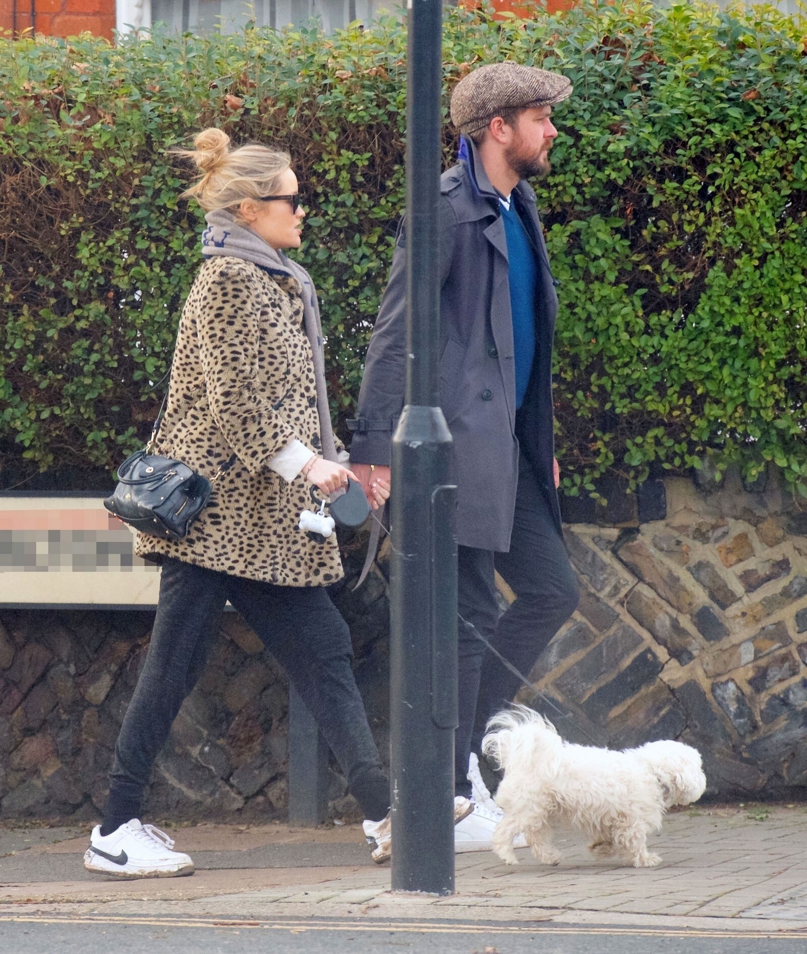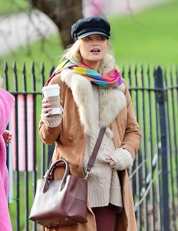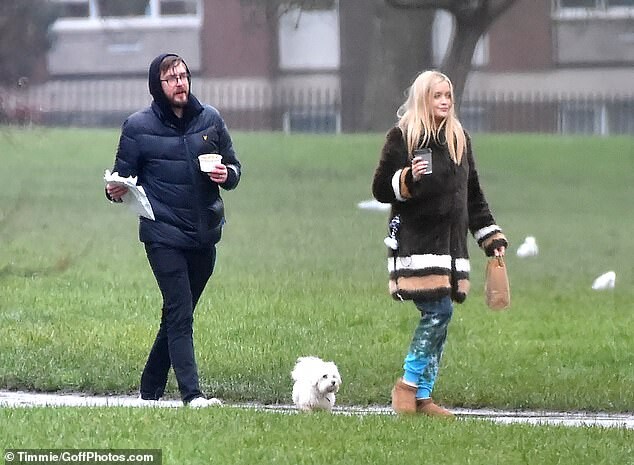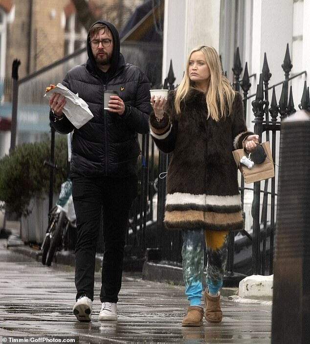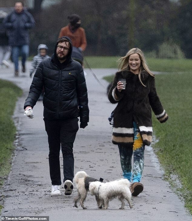 Pregnant Laura Whitmore bundles up in a fluffy brown jacket as she joins husband Iain Stirling on a dog walk