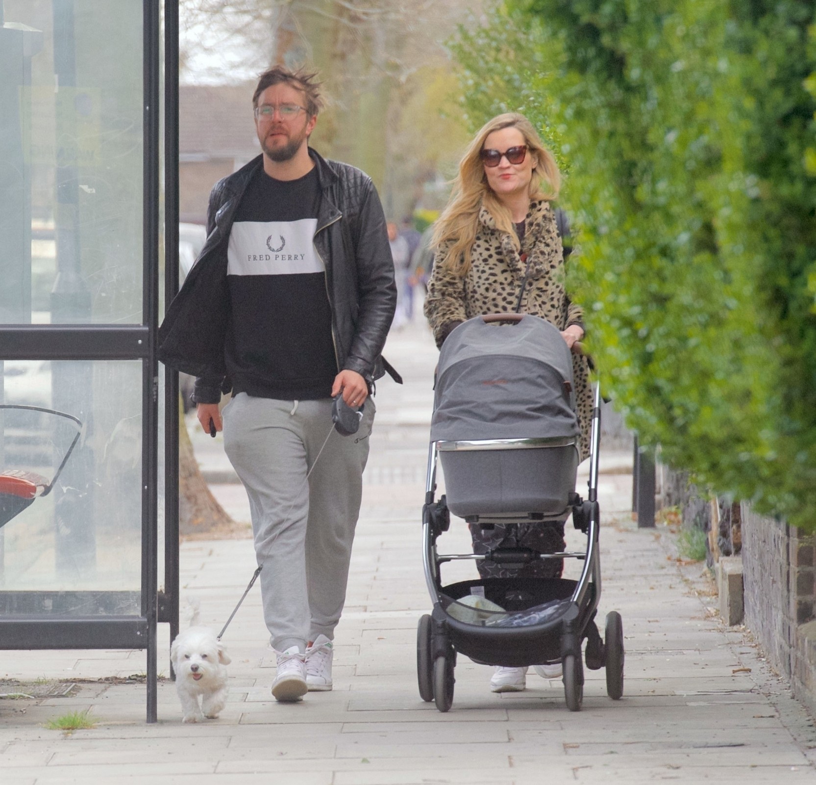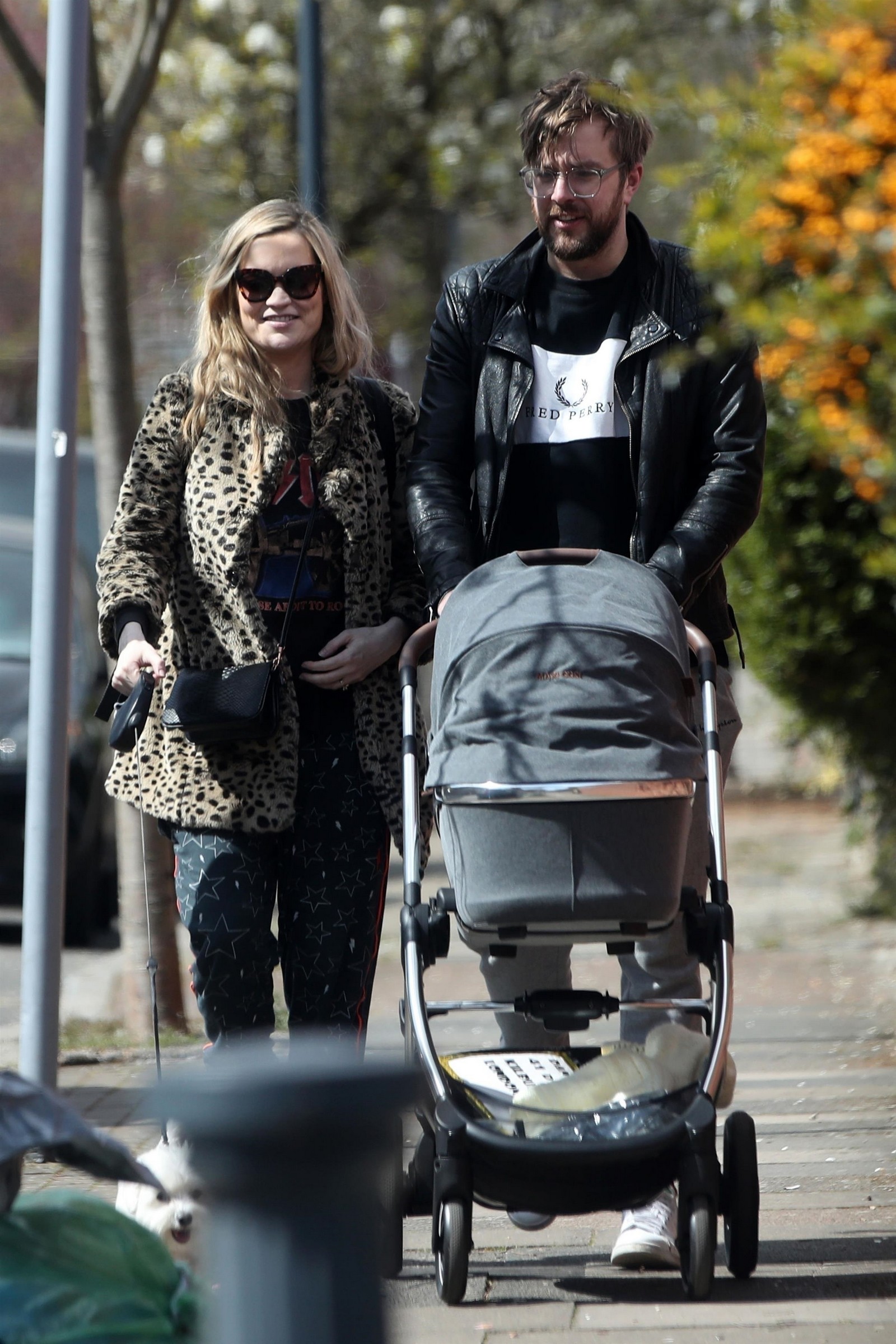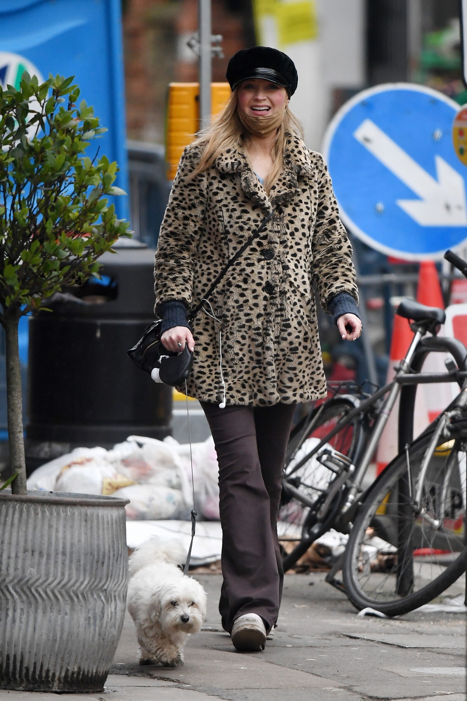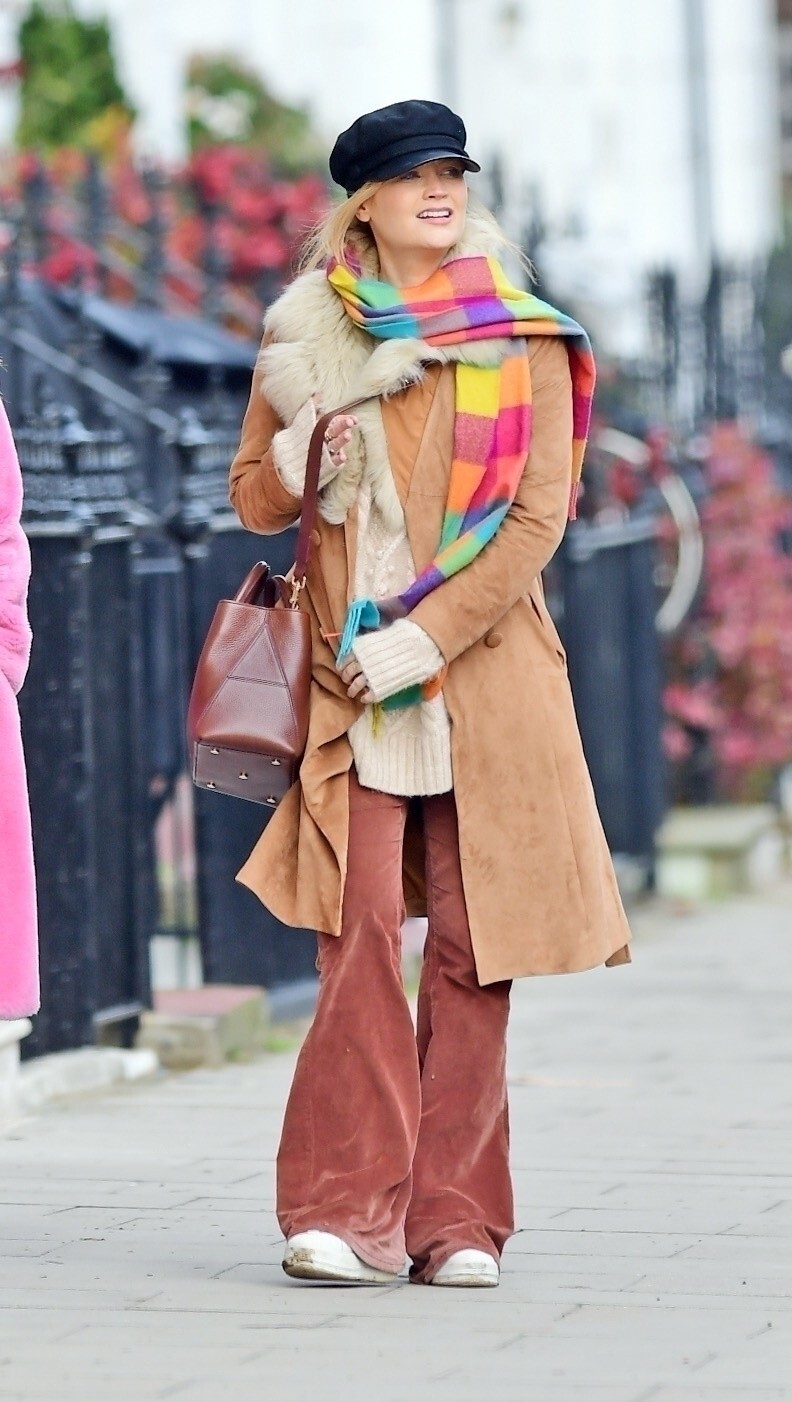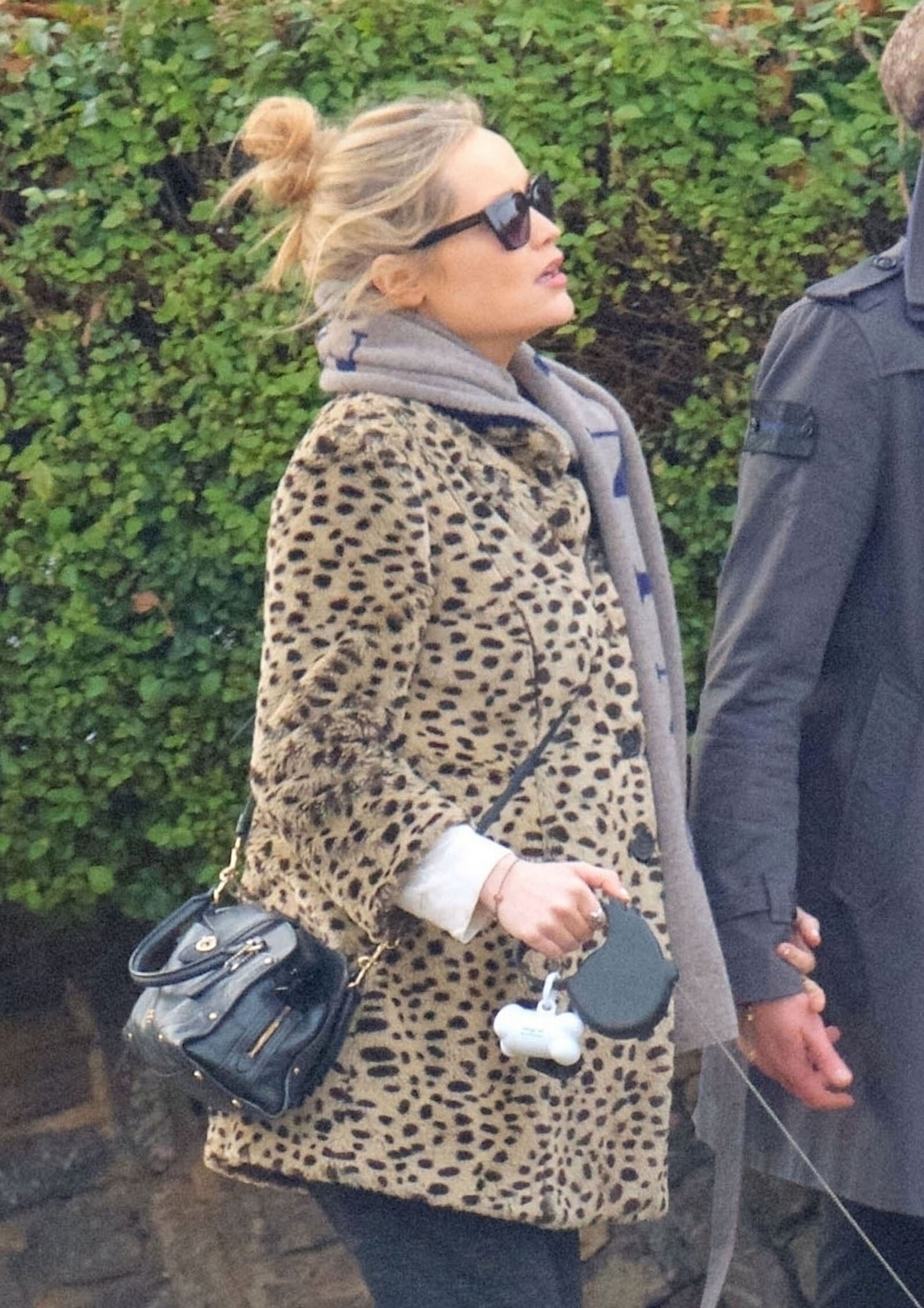 Pregnant Laura Whitmore bundles up in a fluffy brown jacket as she joins husband Iain Stirling on a dog walk