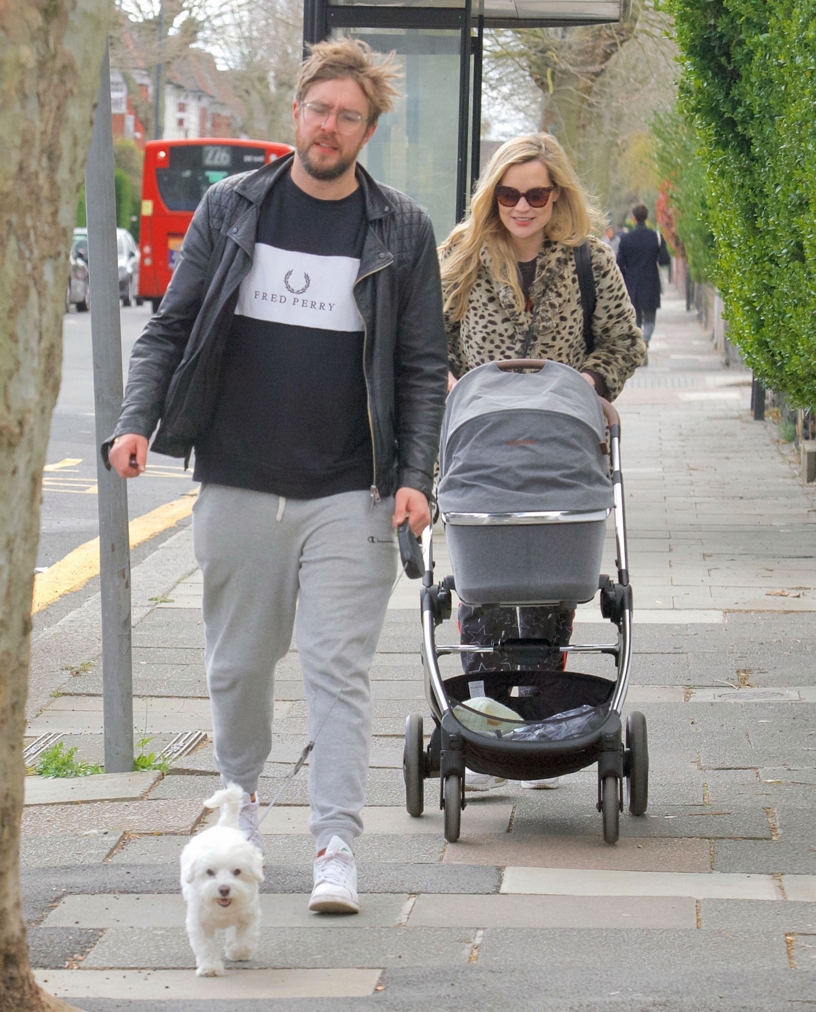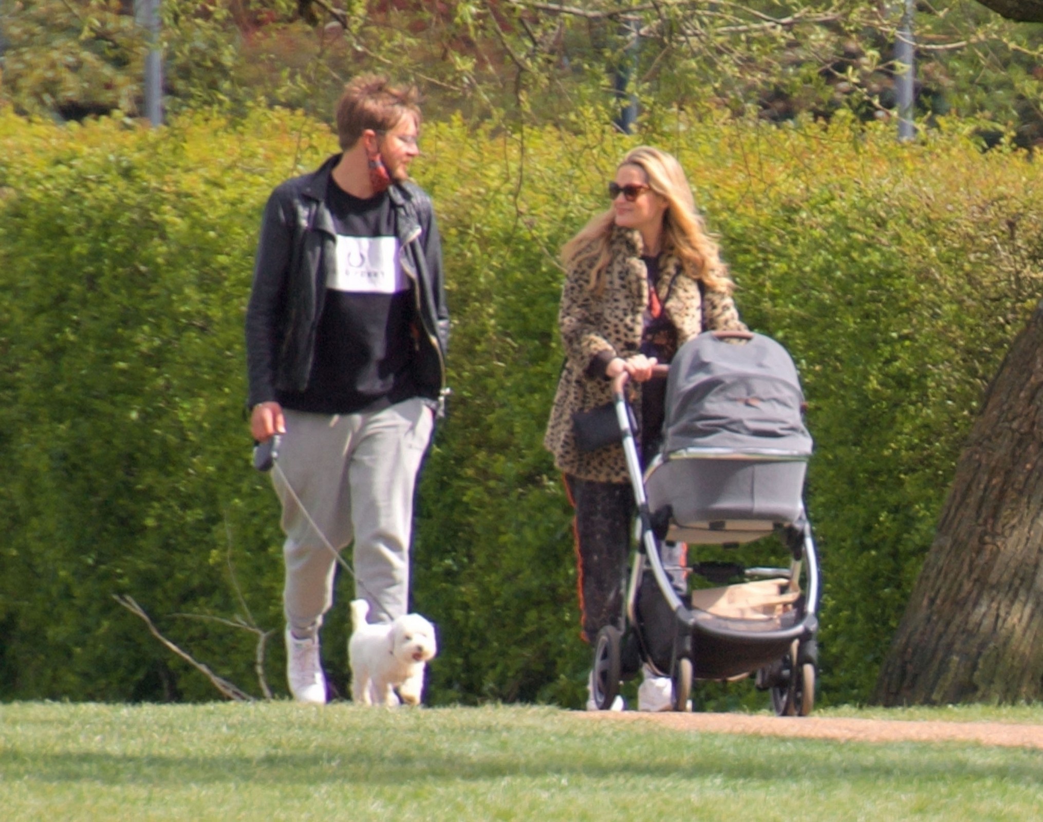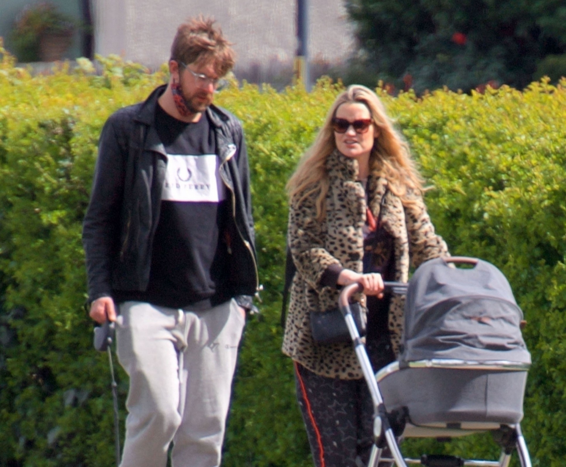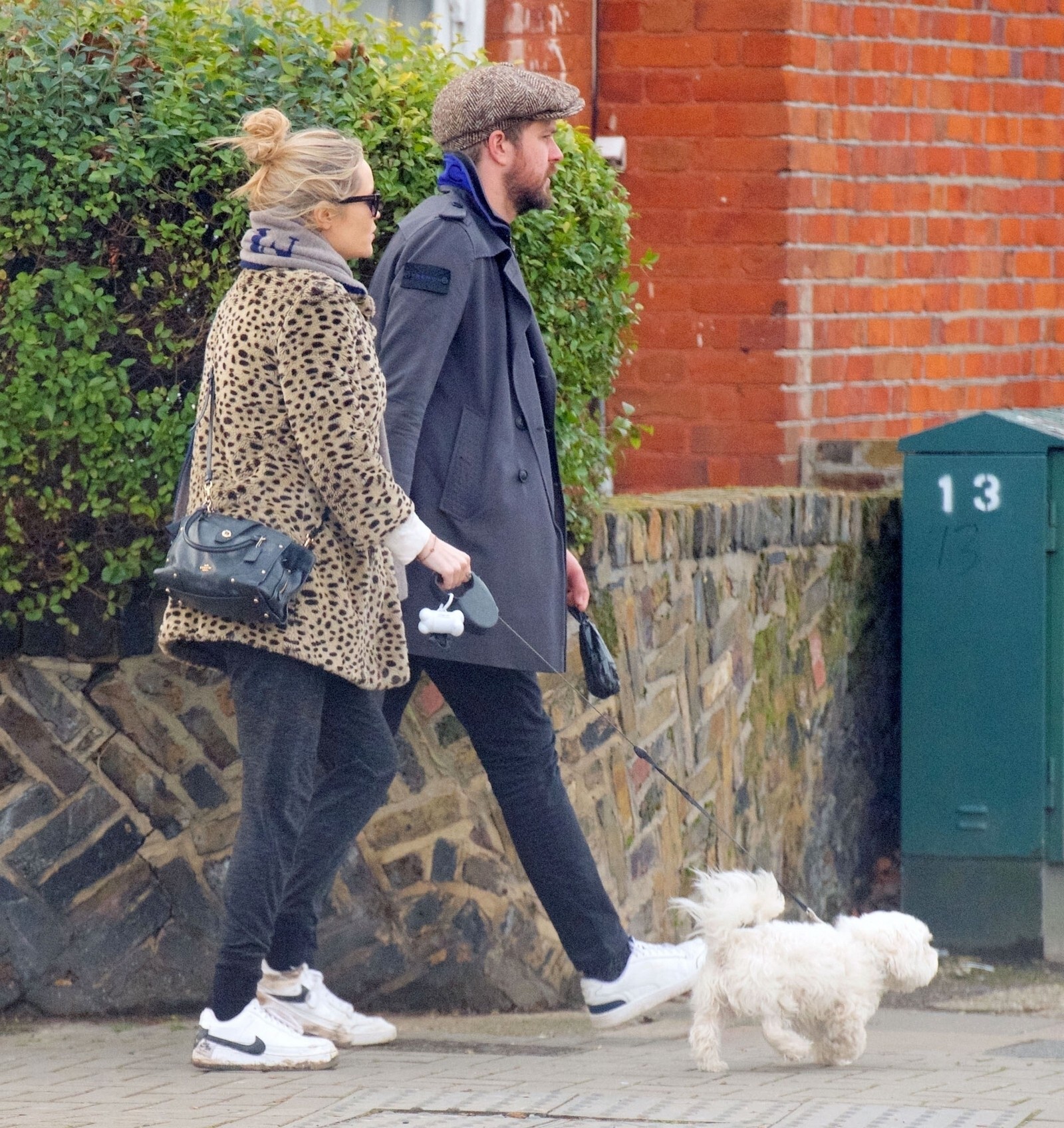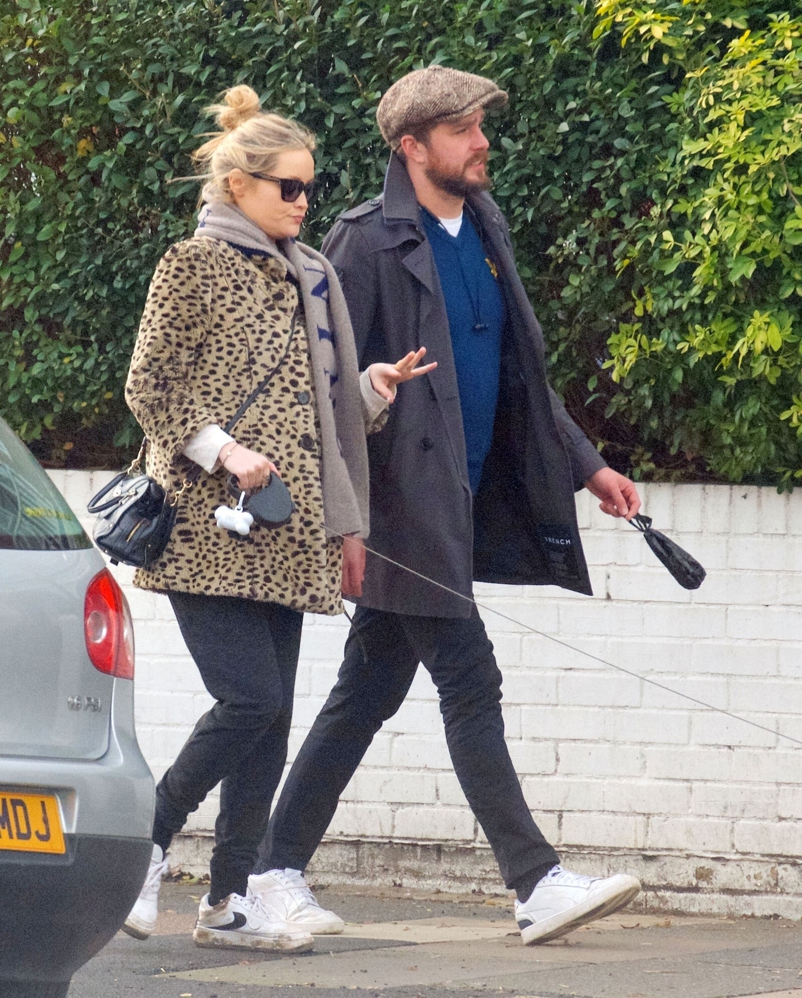 Pregnant Laura Whitmore bundles up in a fluffy brown jacket as she joins husband Iain Stirling on a dog walk