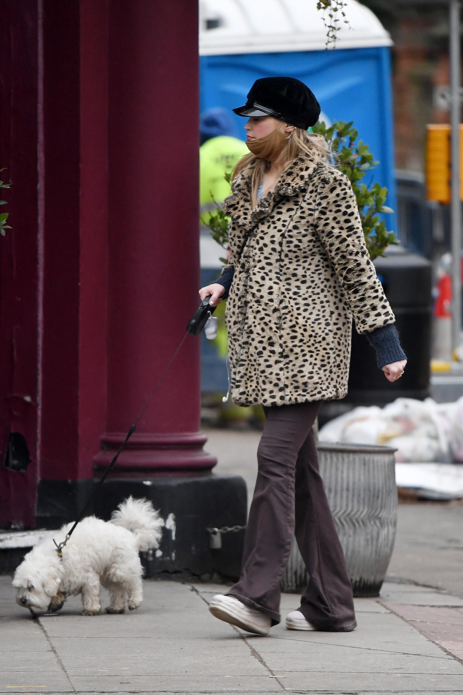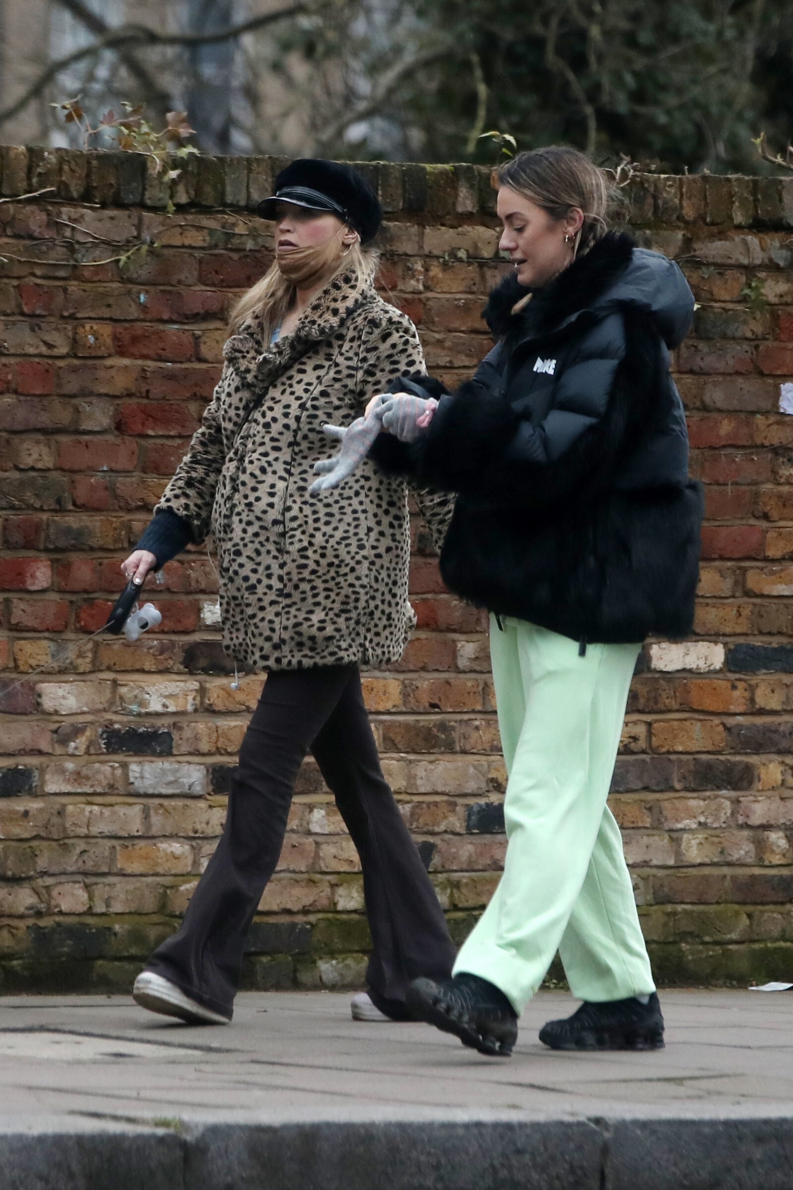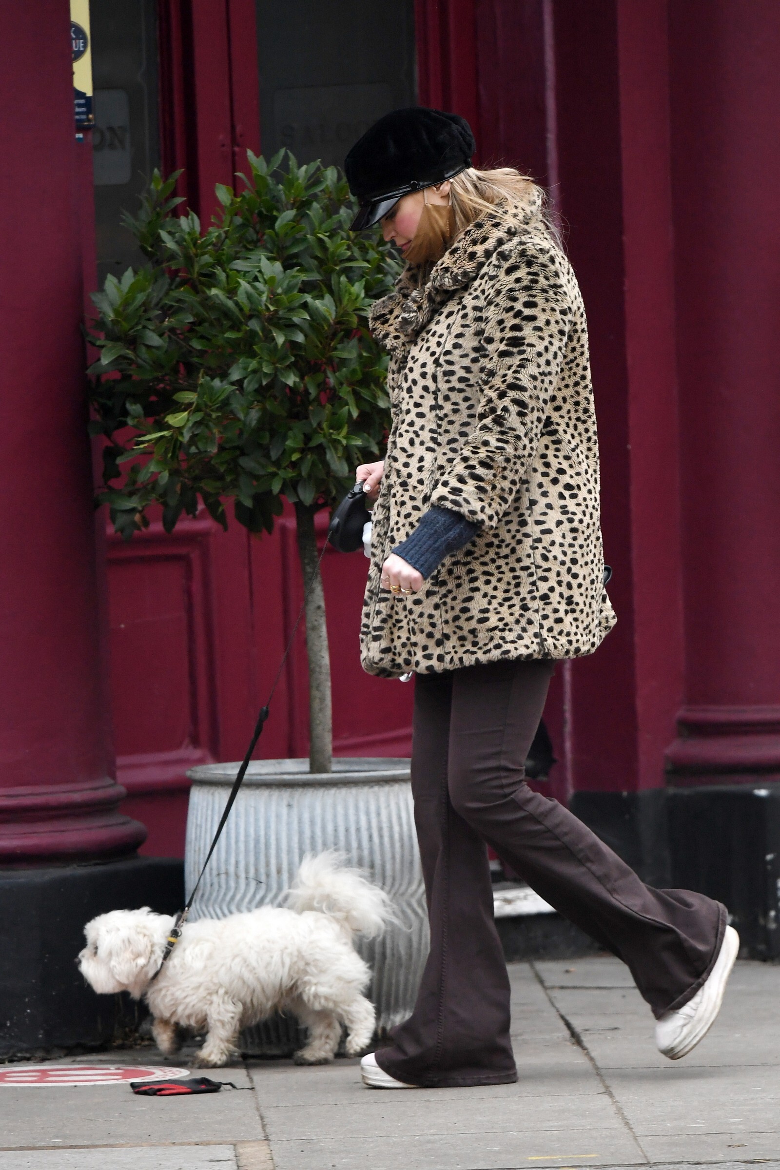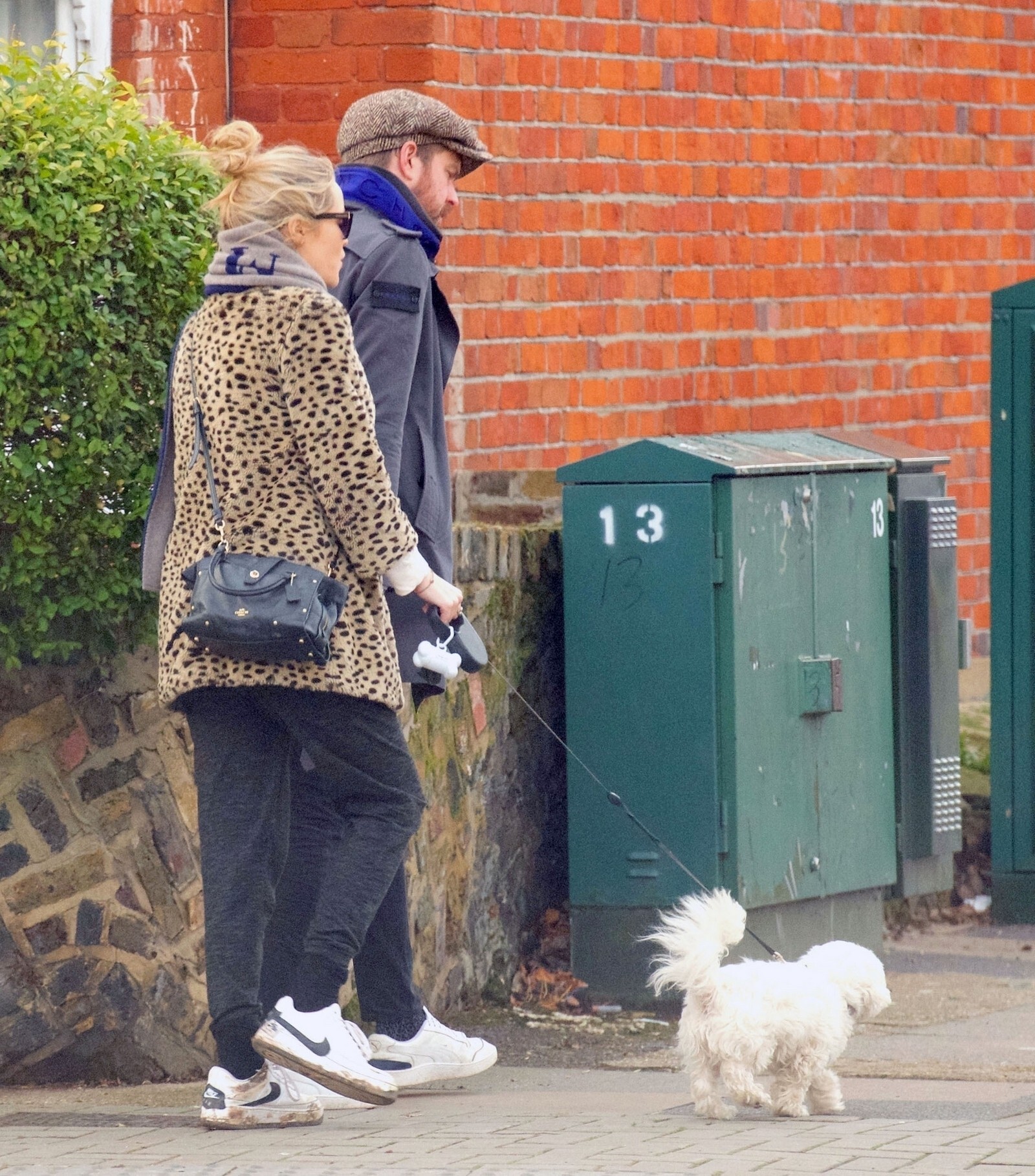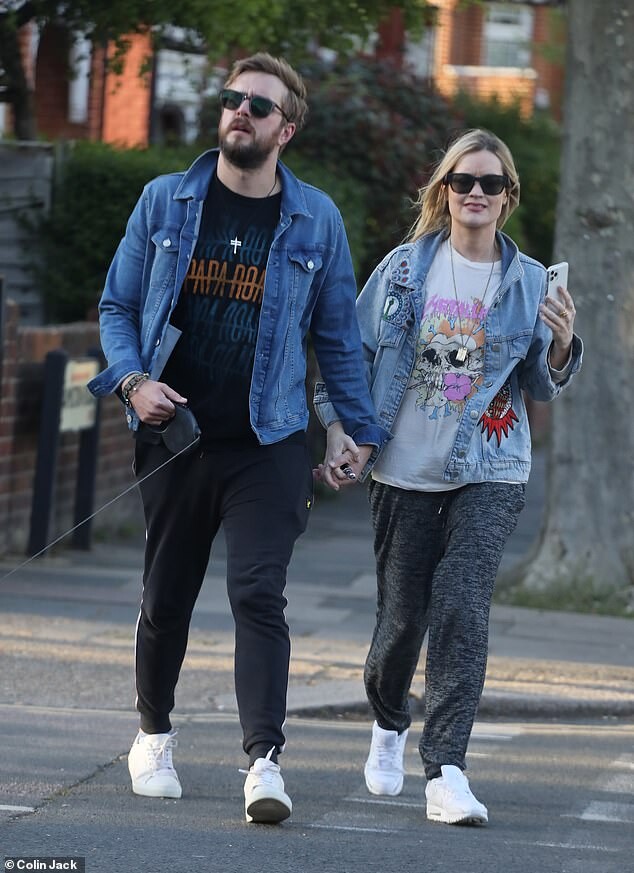 Pregnant Laura Whitmore bundles up in a fluffy brown jacket as she joins husband Iain Stirling on a dog walk