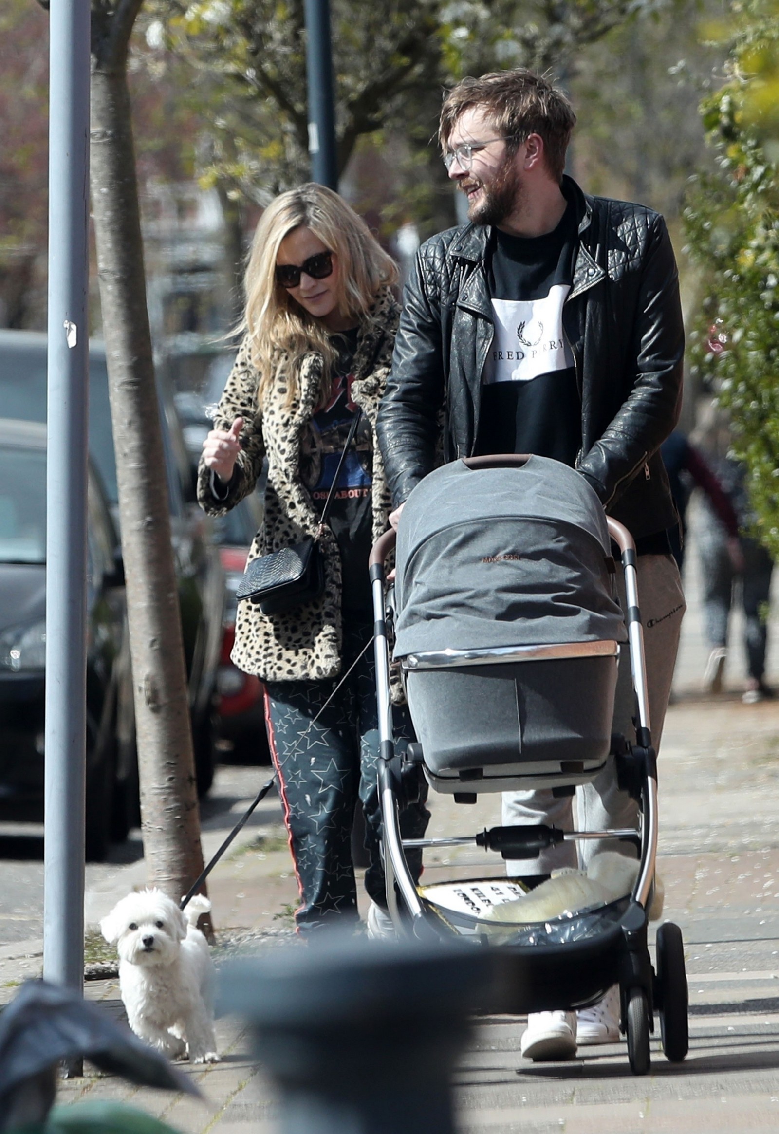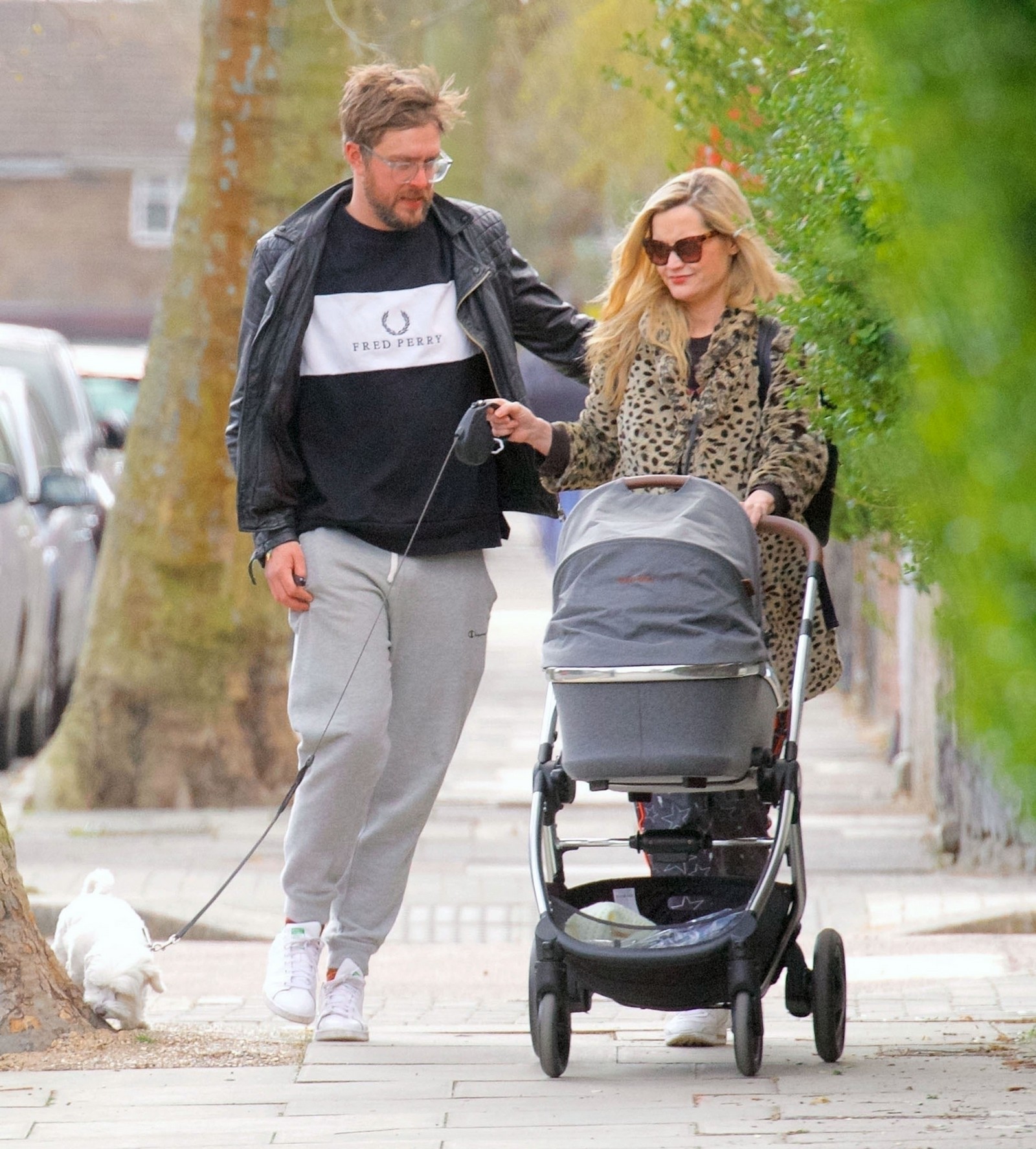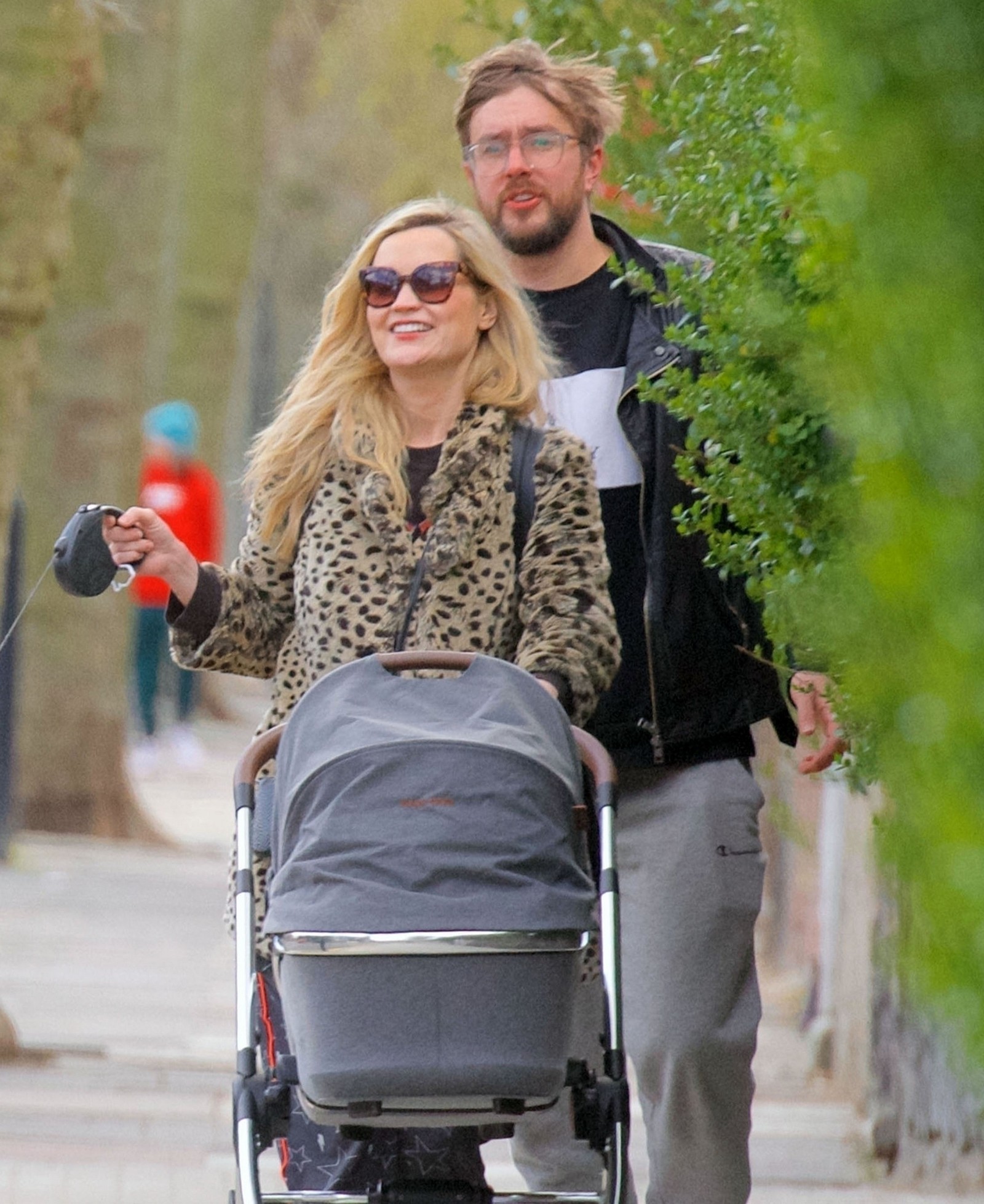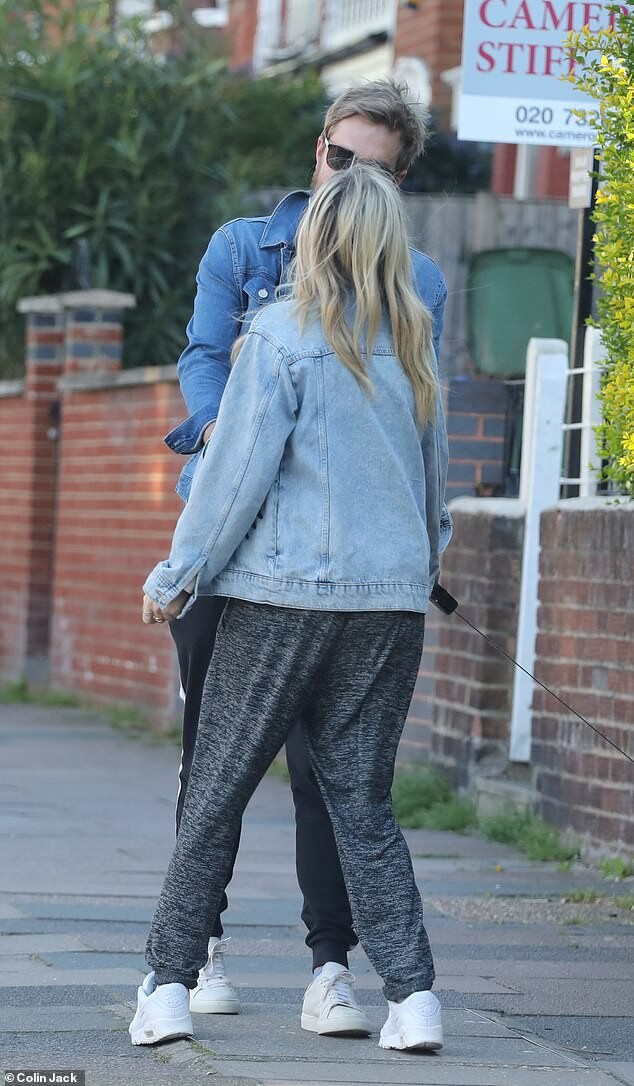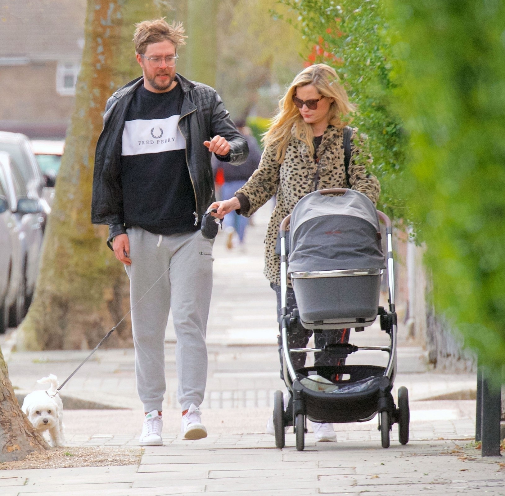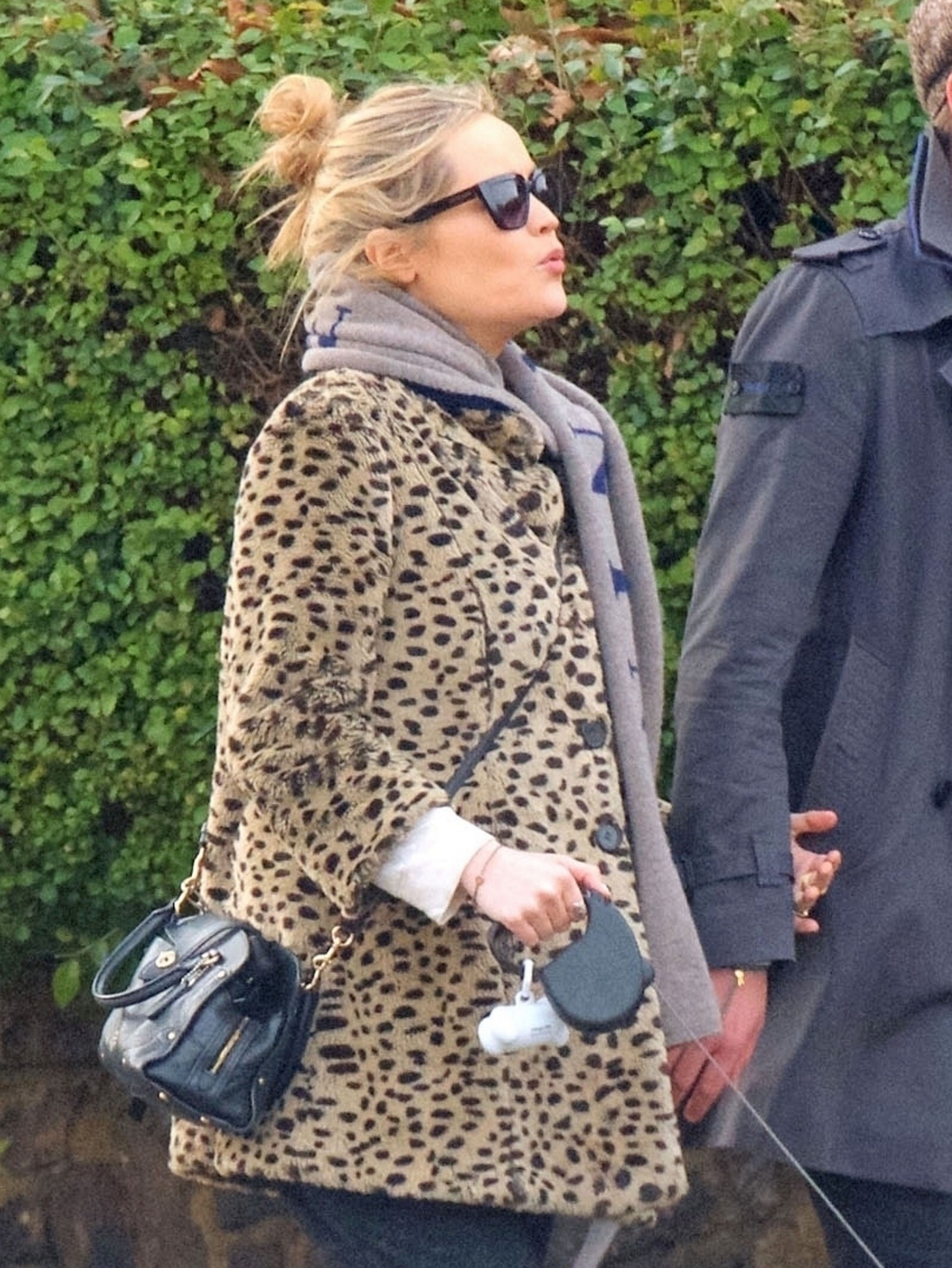 Pregnant Laura Whitmore bundles up in a fluffy brown jacket as she joins husband Iain Stirling on a dog walk