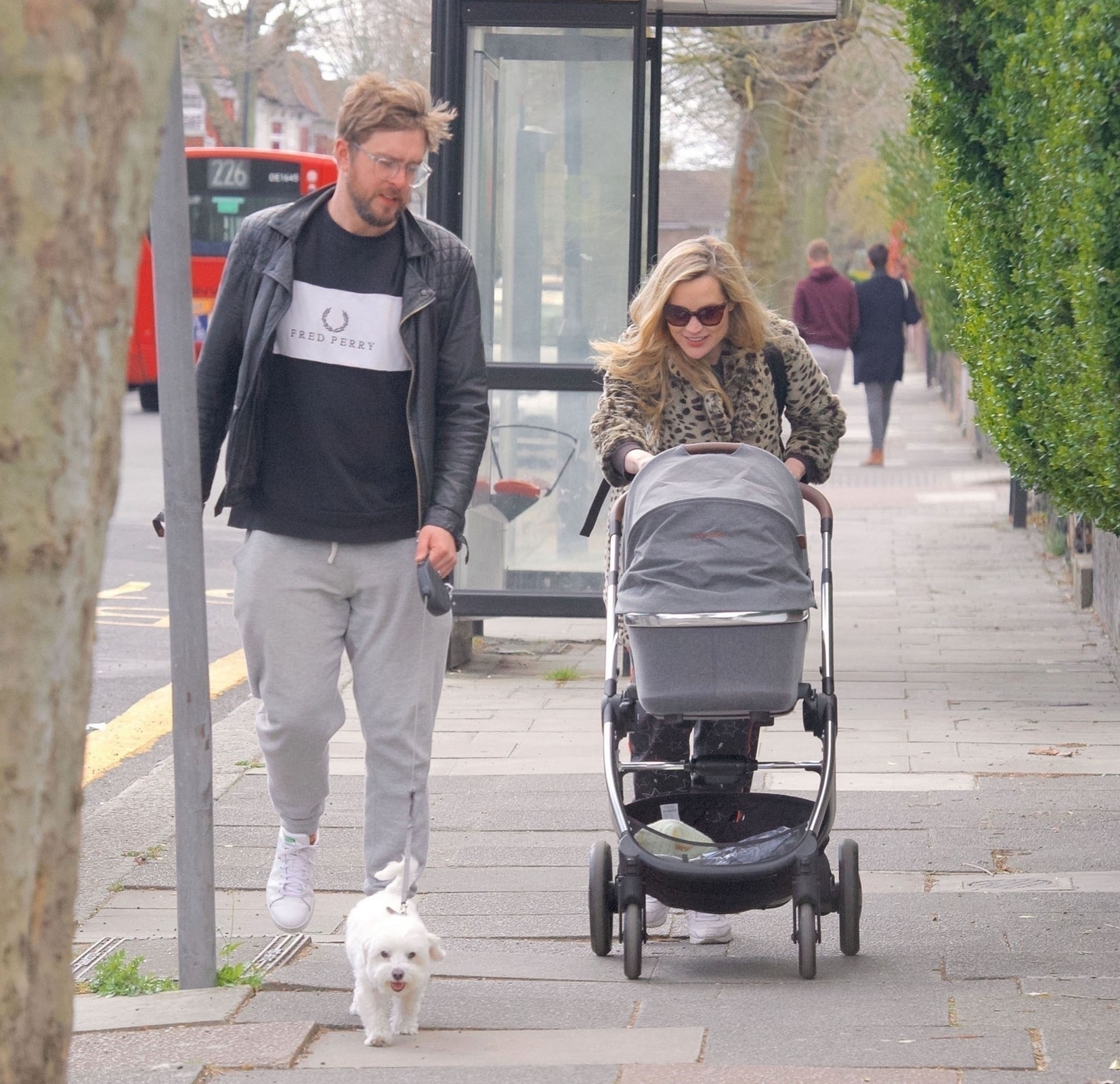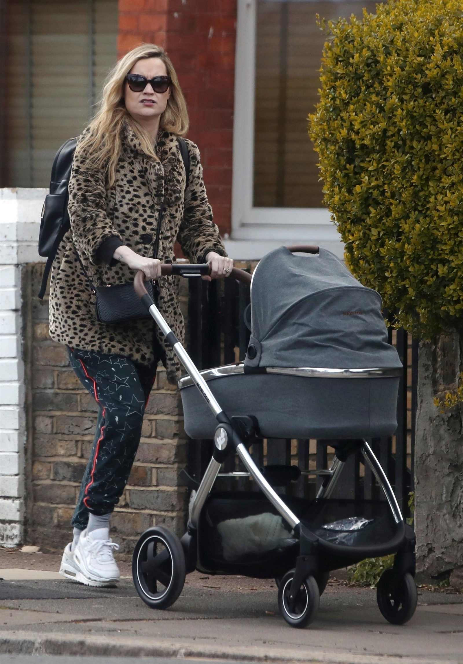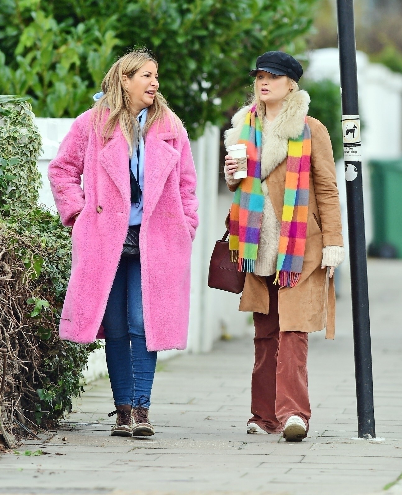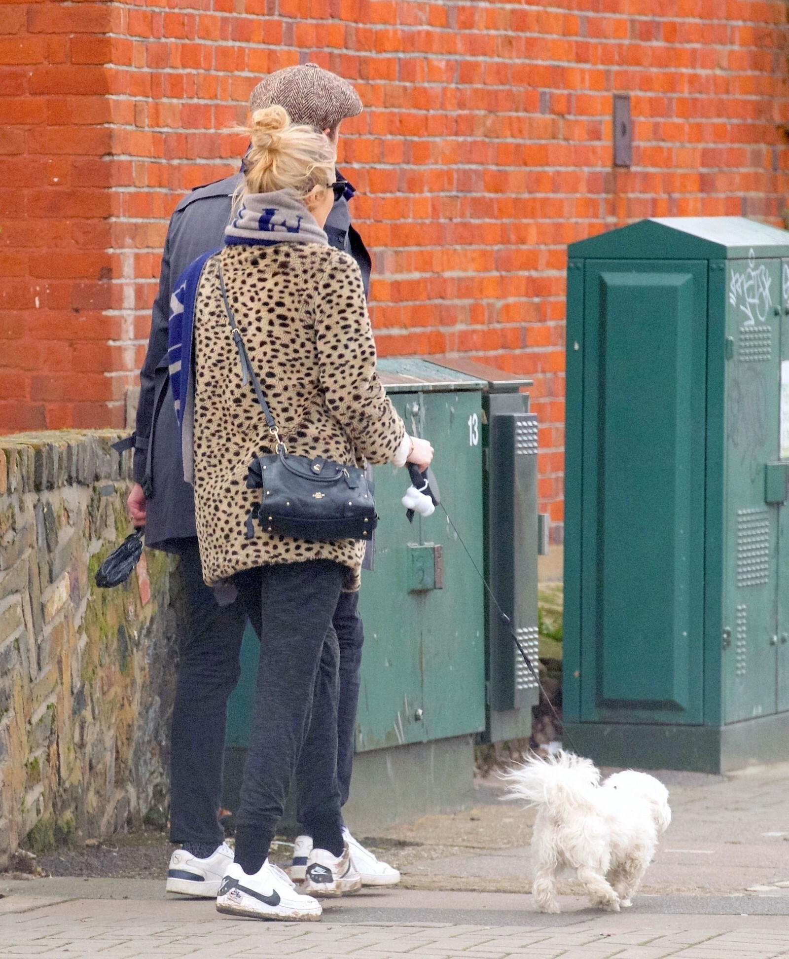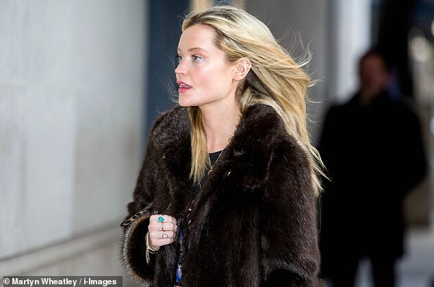 Pregnant Laura Whitmore bundles up in a fluffy brown jacket as she joins husband Iain Stirling on a dog walk