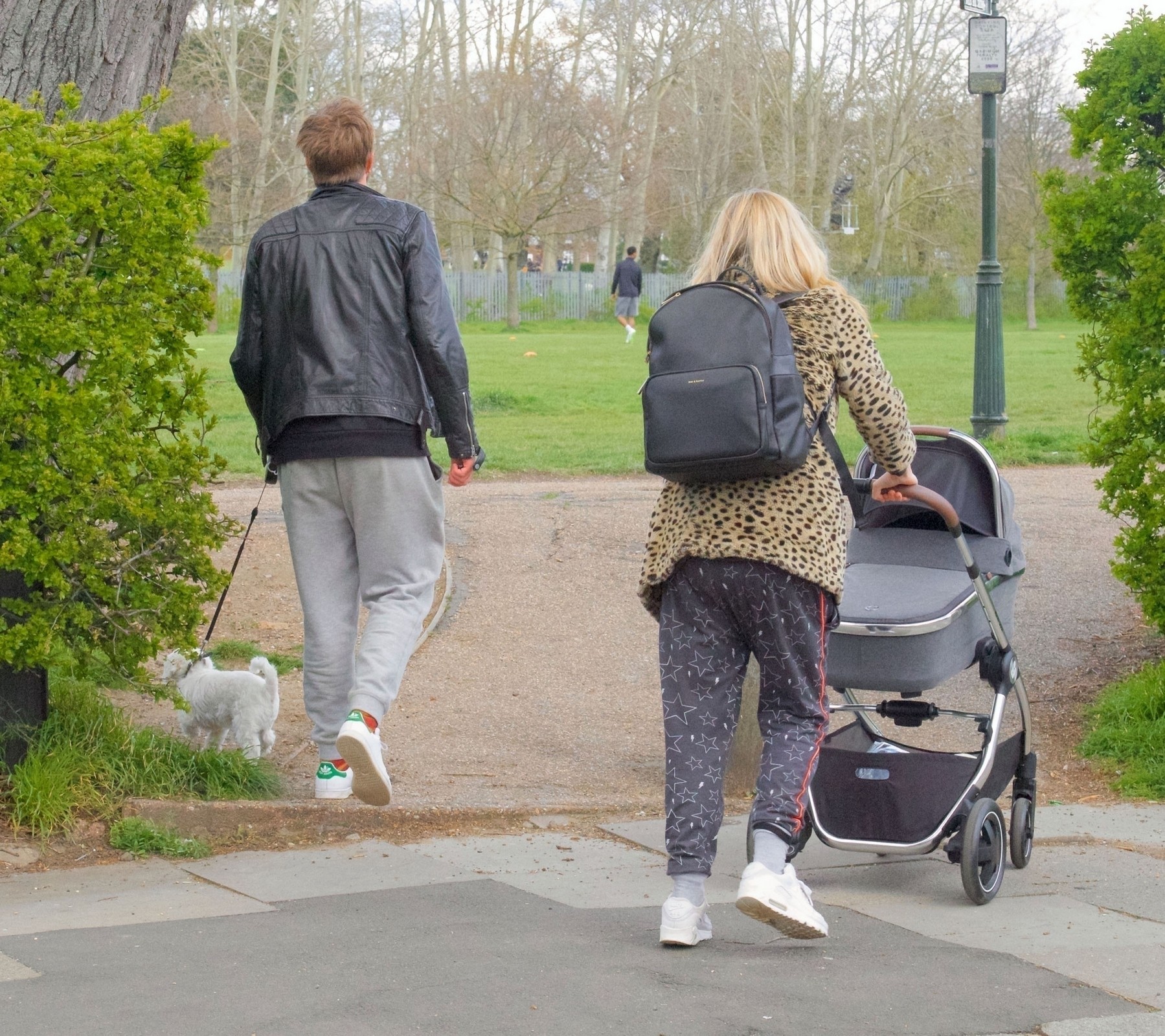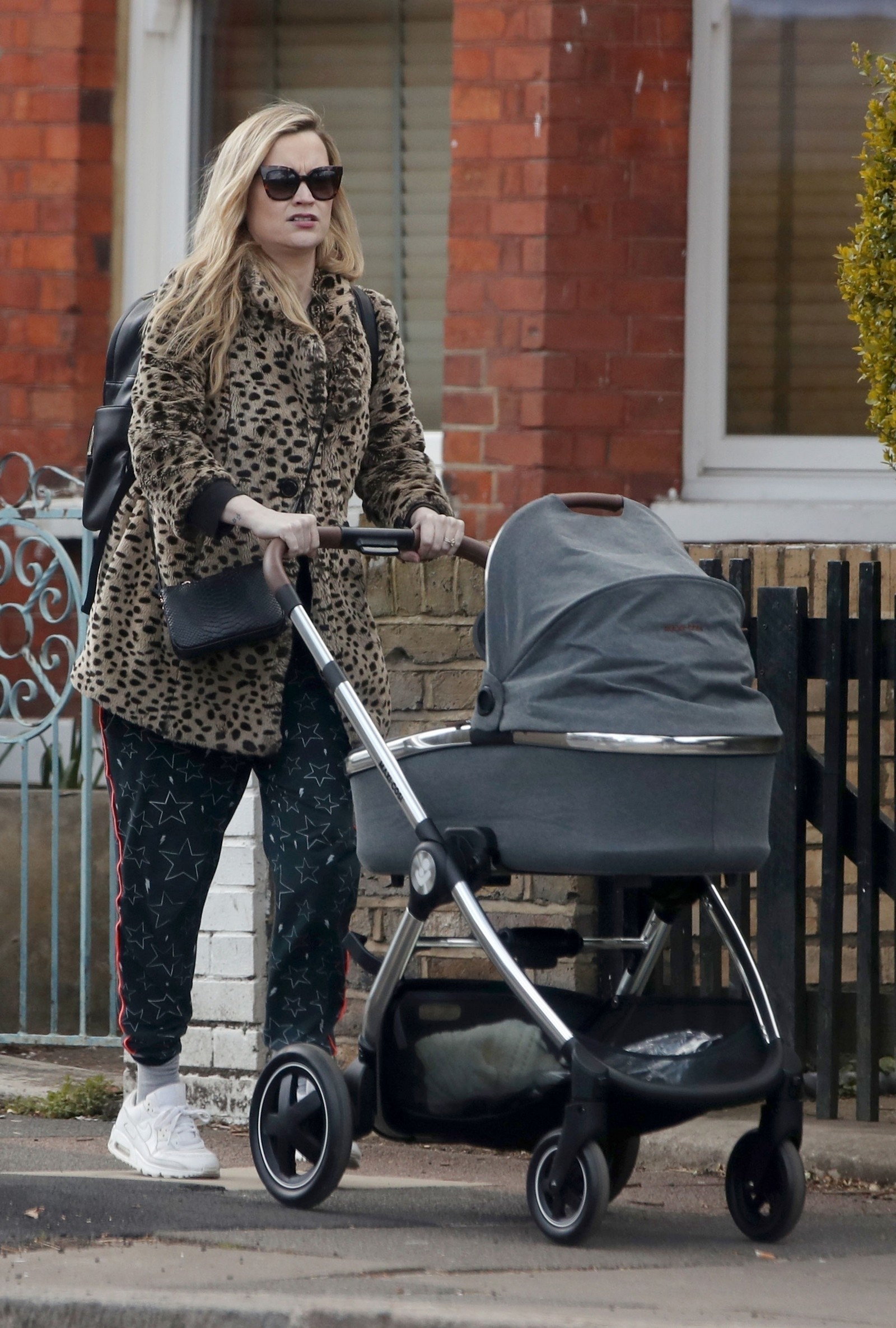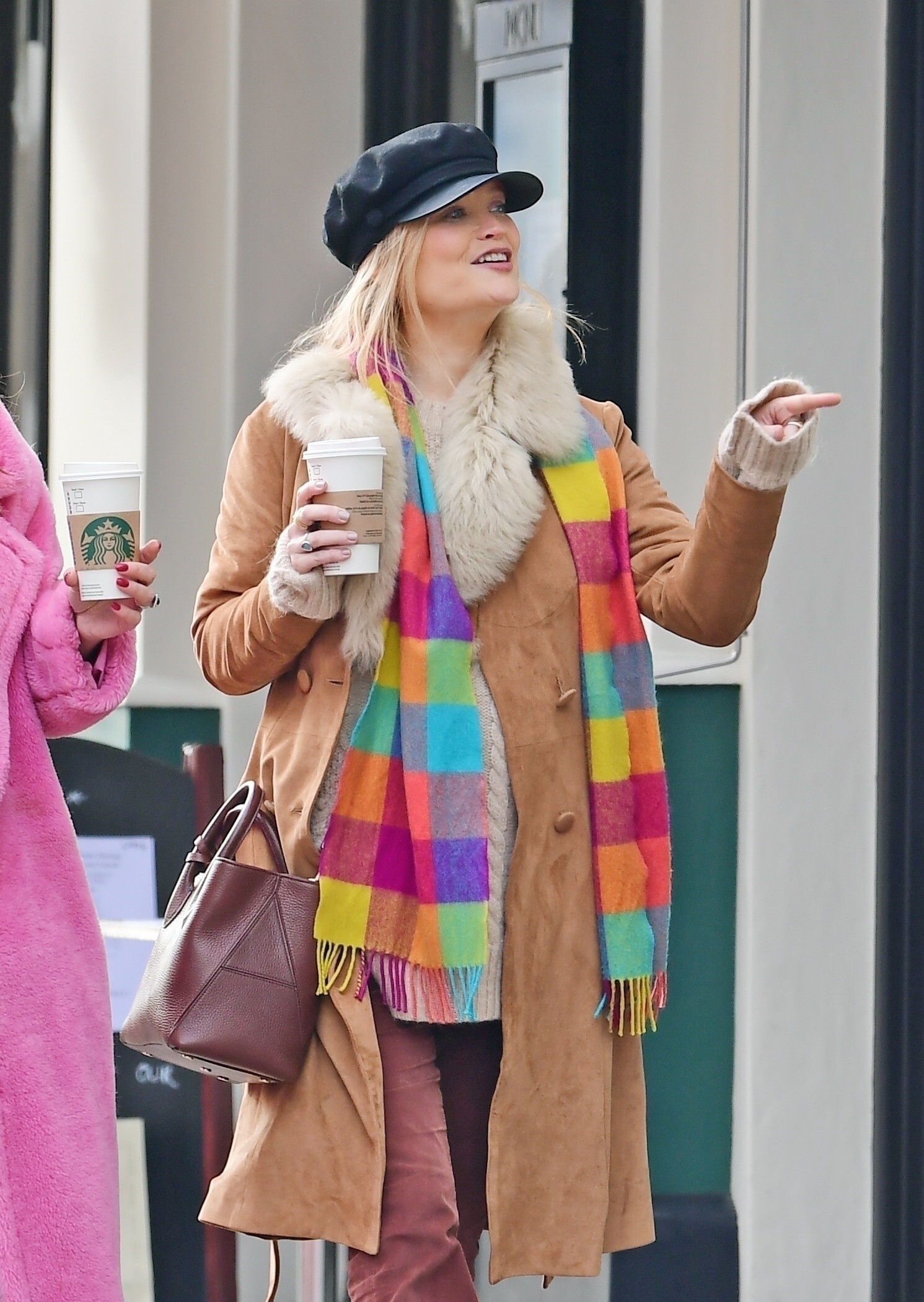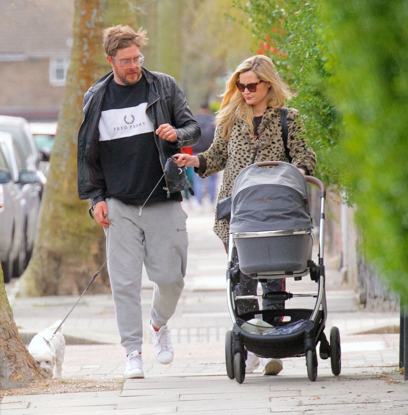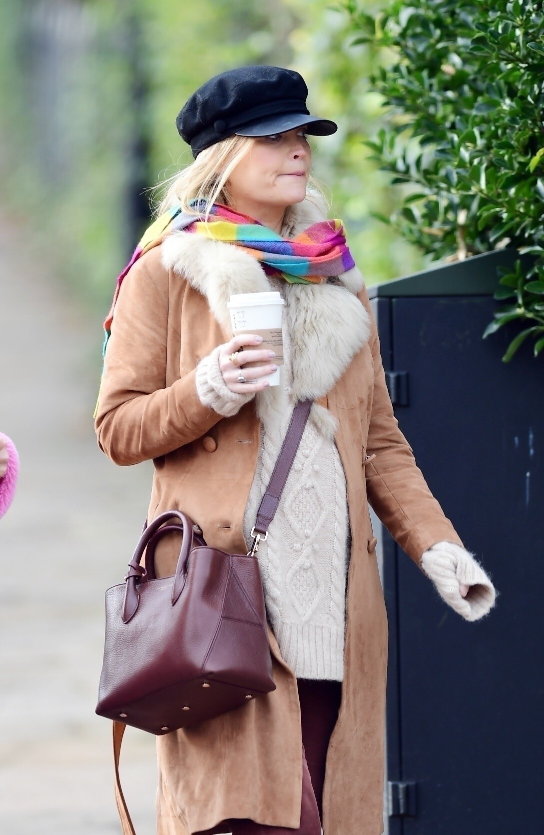 Pregnant Laura Whitmore bundles up in a fluffy brown jacket as she joins husband Iain Stirling on a dog walk