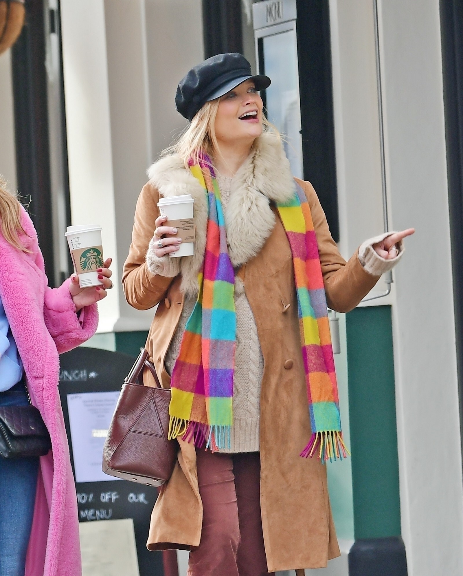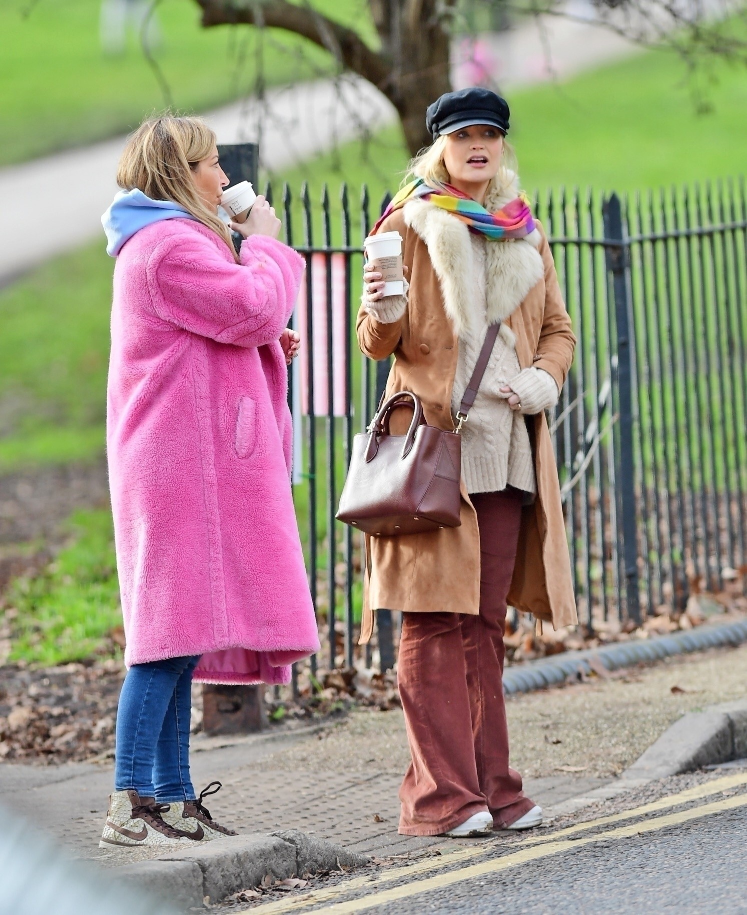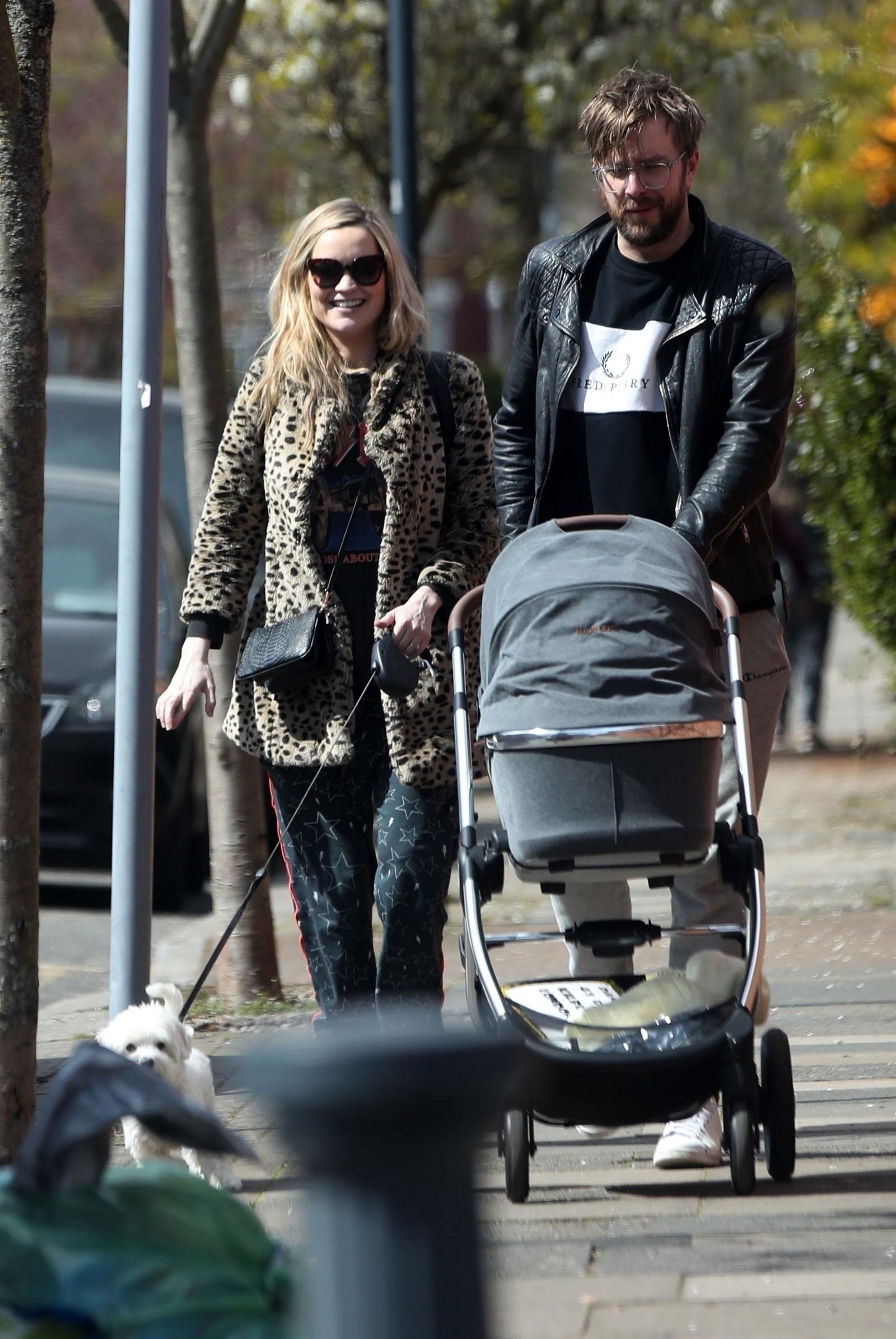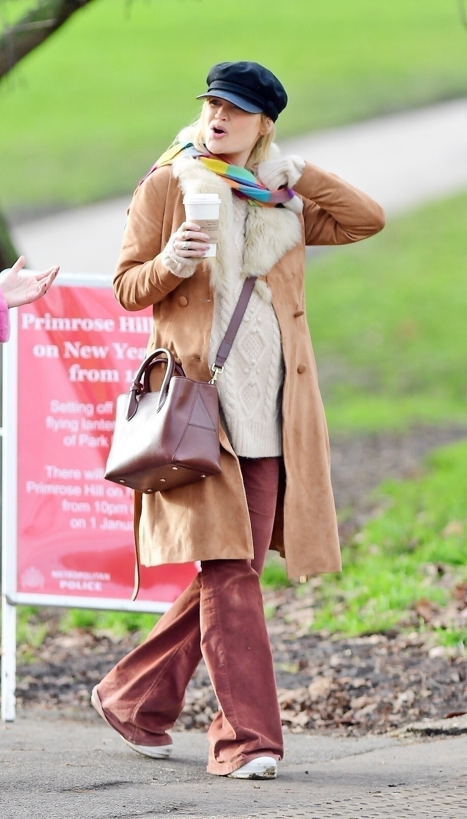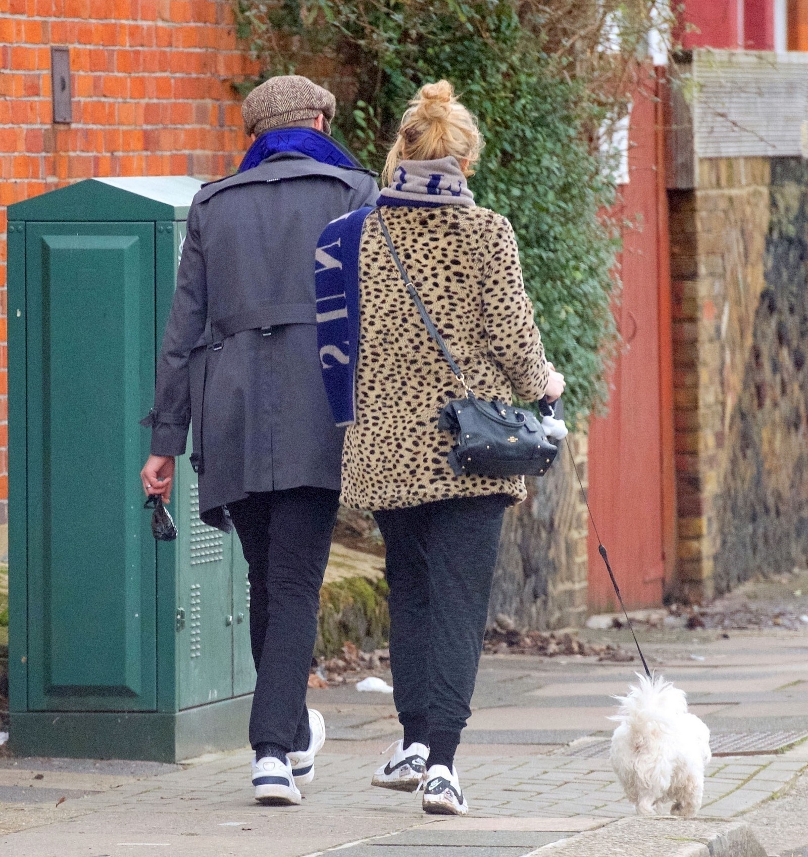 Pregnant Laura Whitmore bundles up in a fluffy brown jacket as she joins husband Iain Stirling on a dog walk