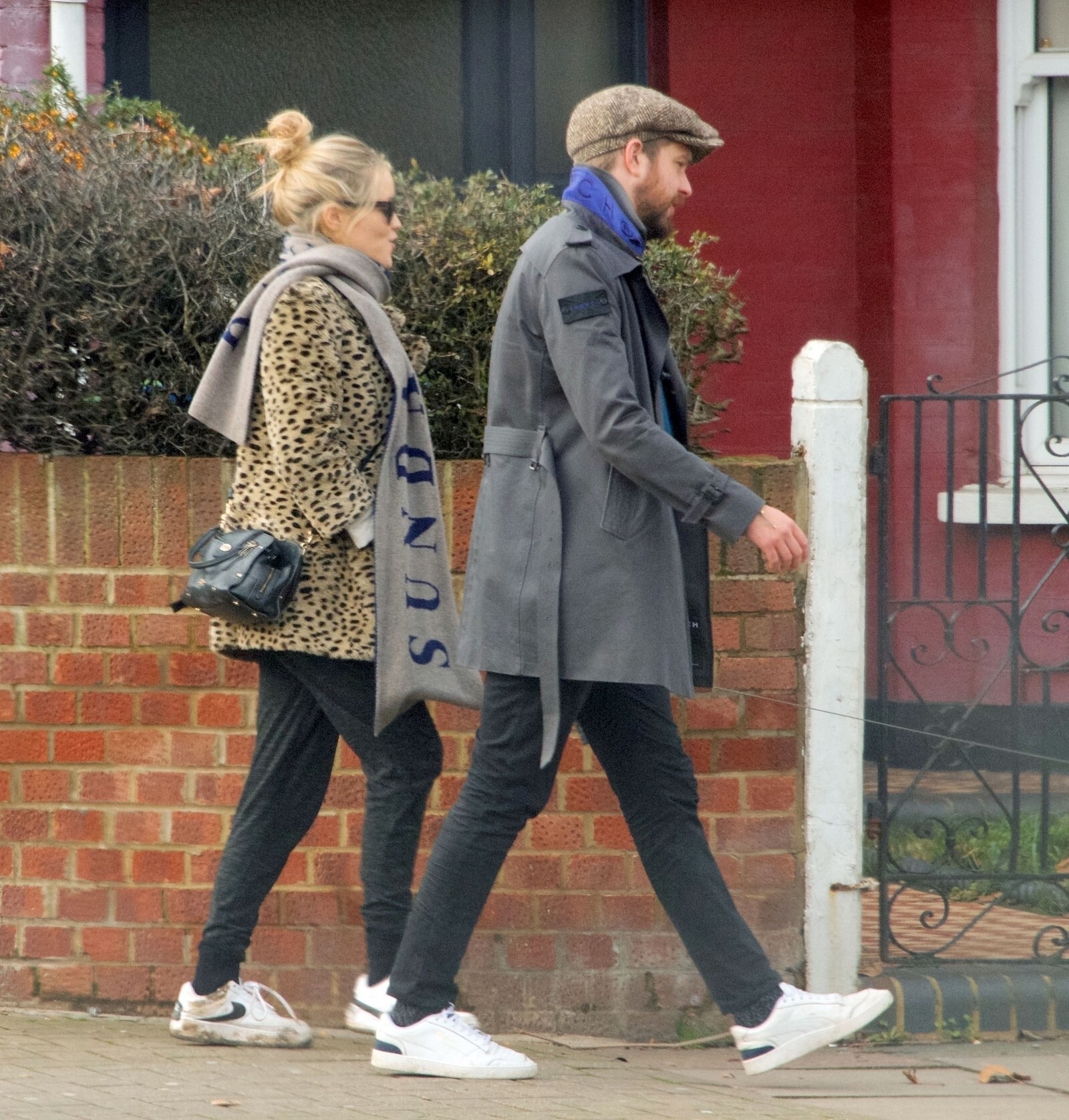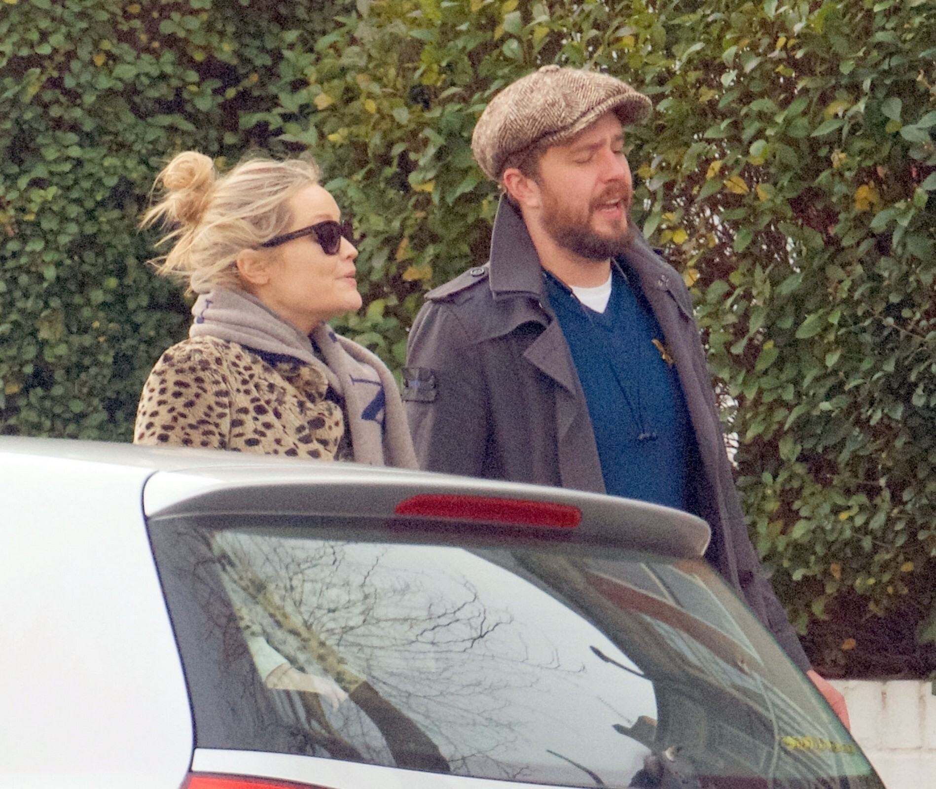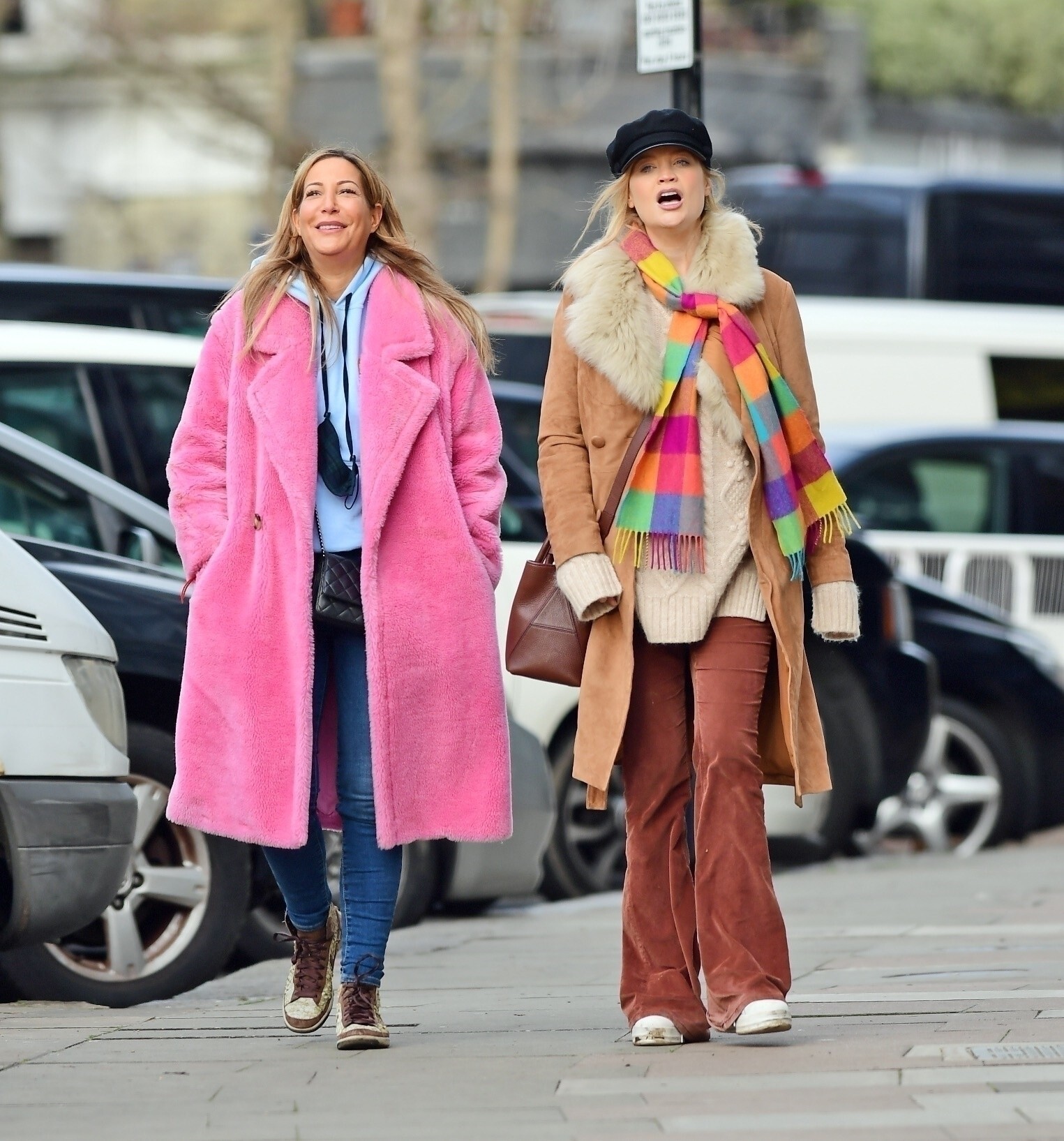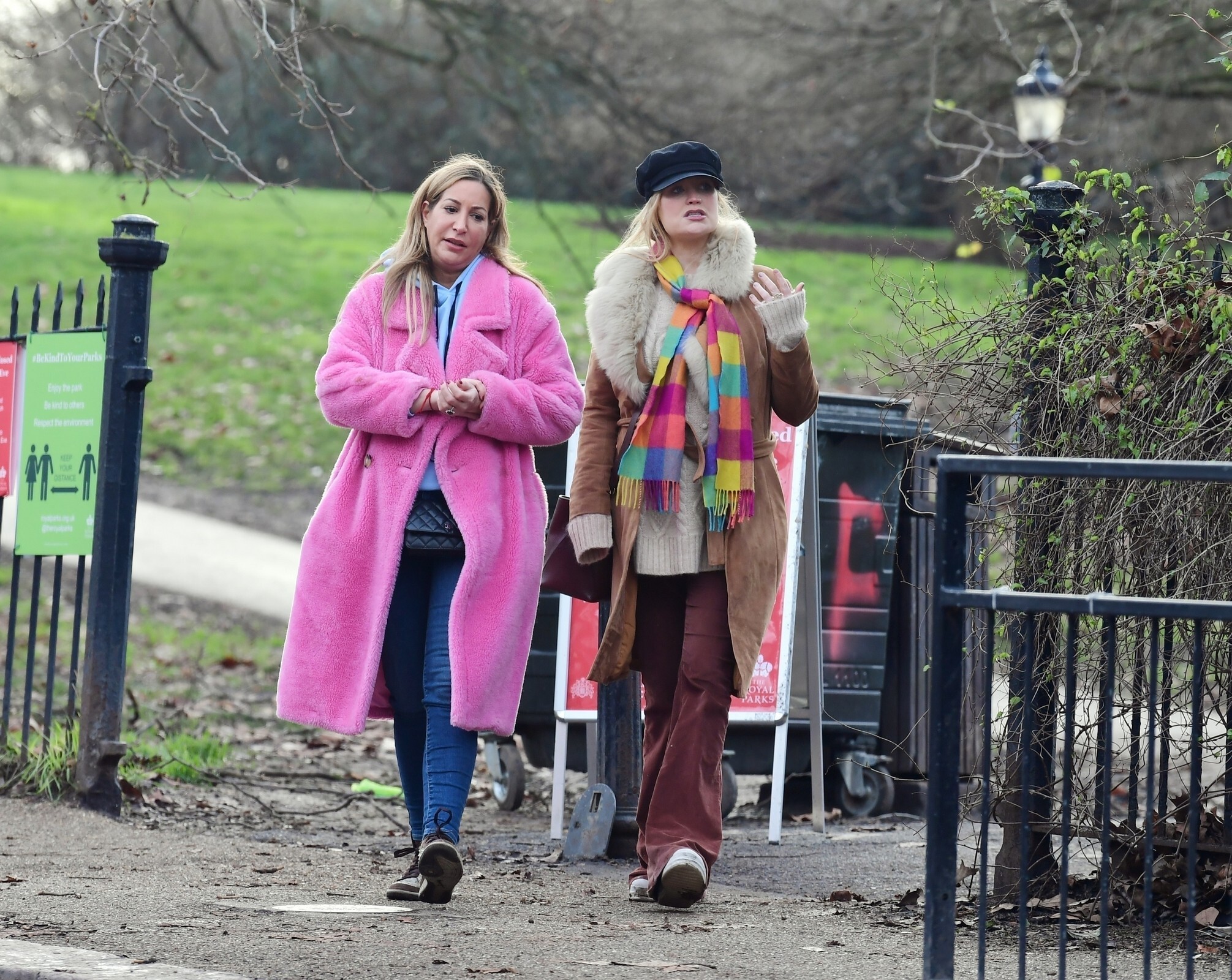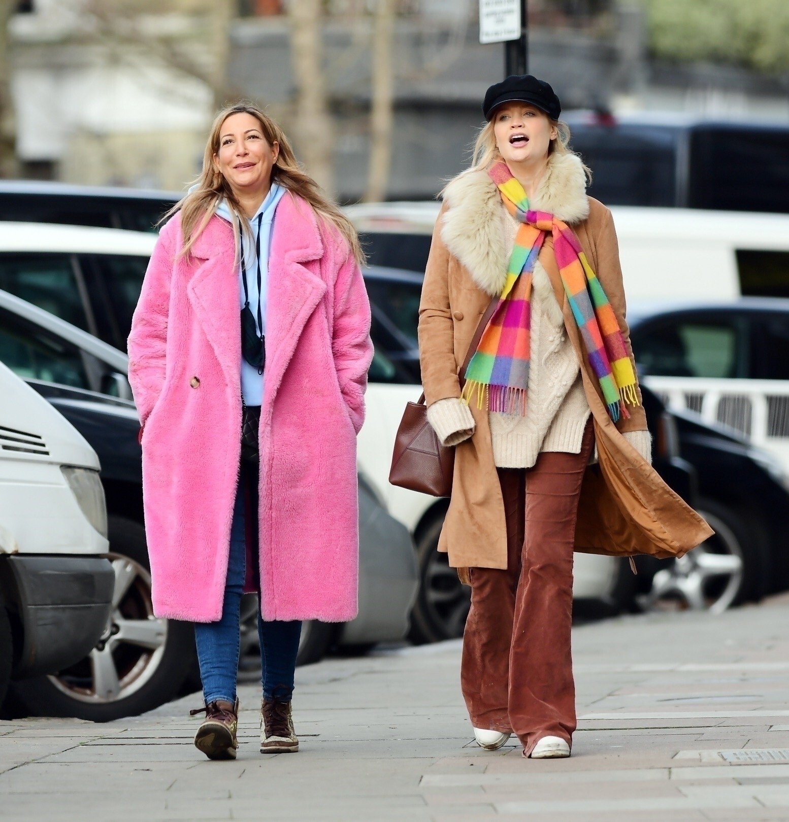 Pregnant Laura Whitmore bundles up in a fluffy brown jacket as she joins husband Iain Stirling on a dog walk