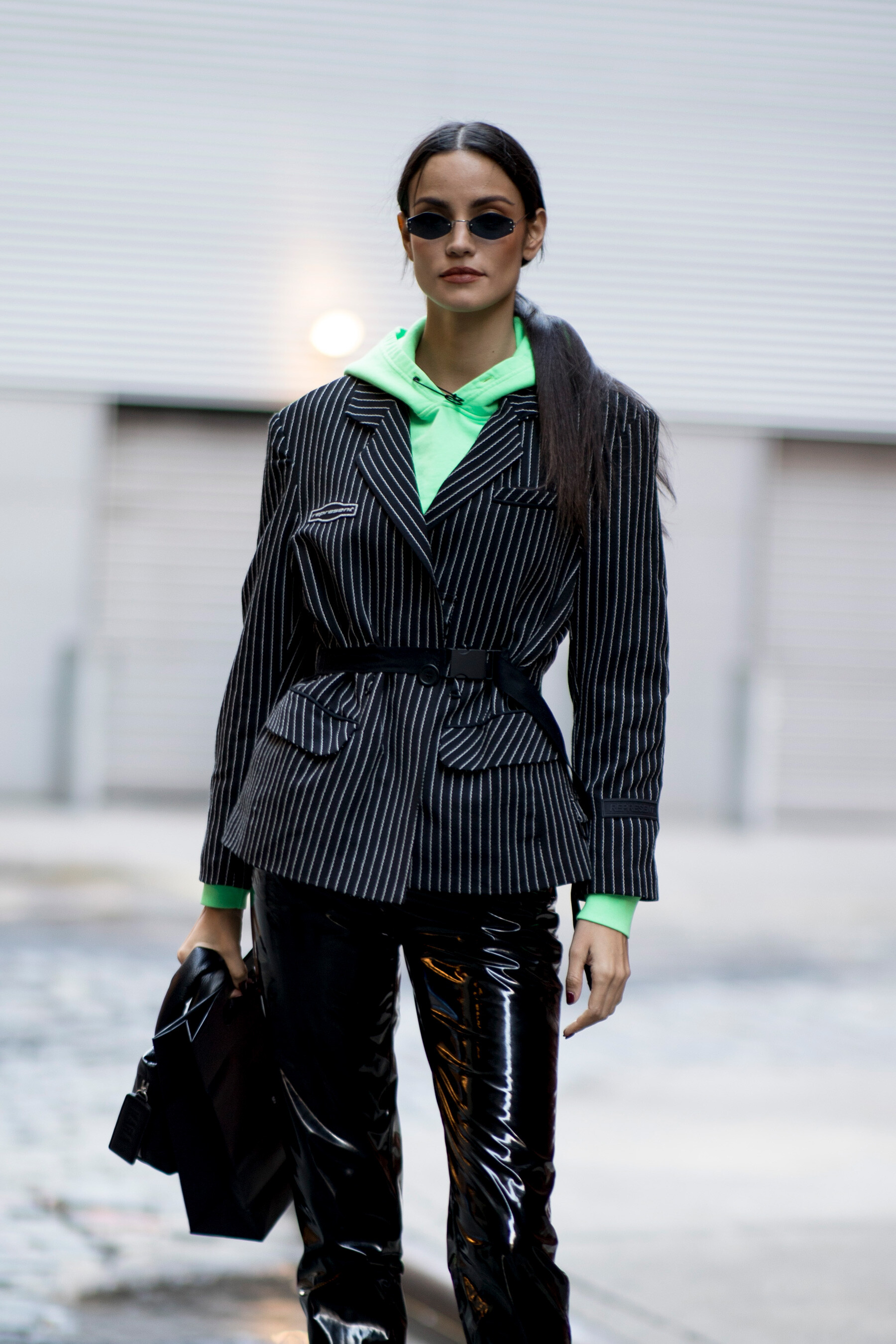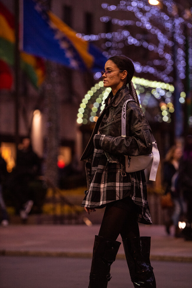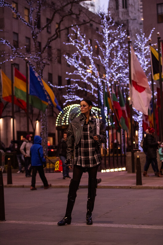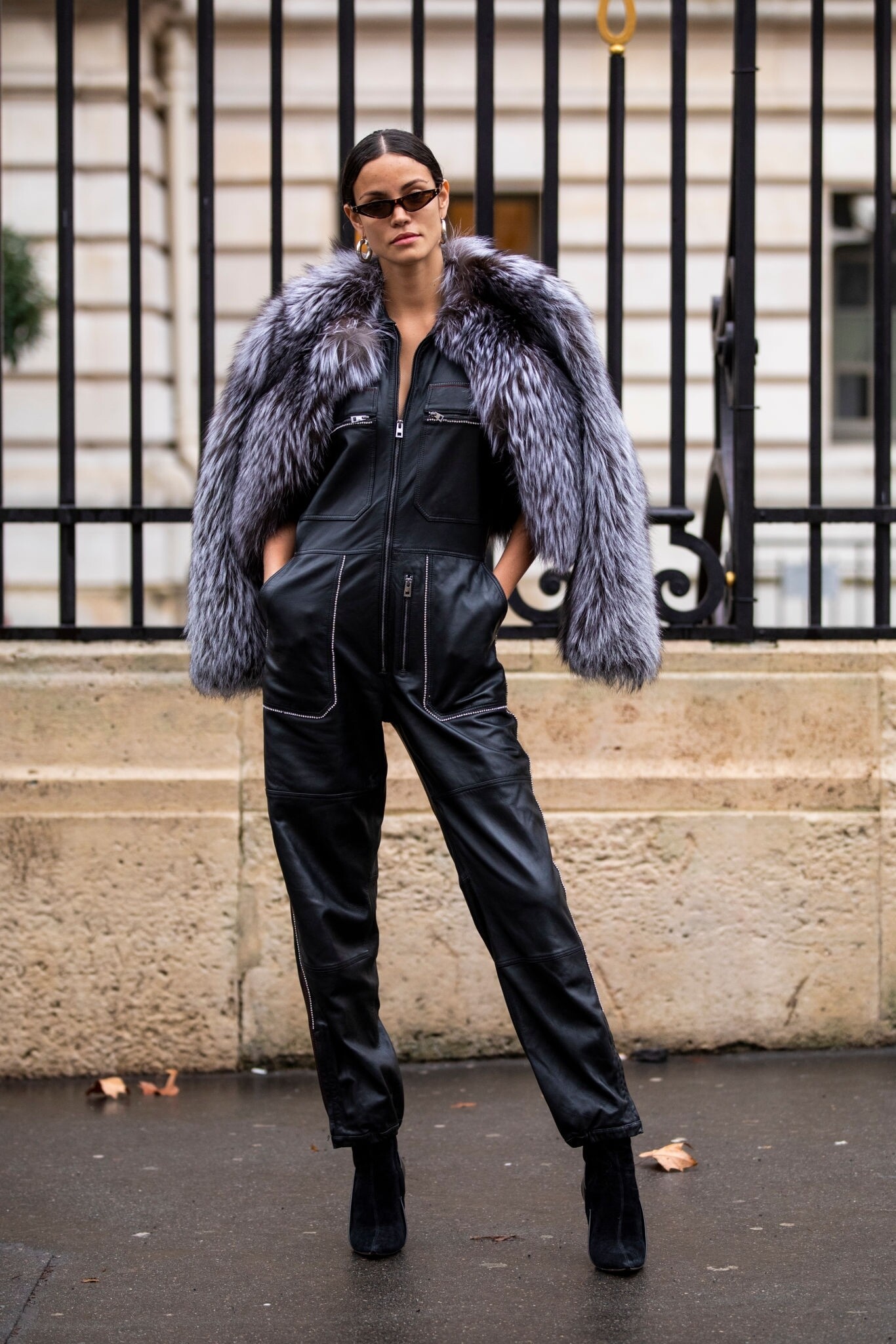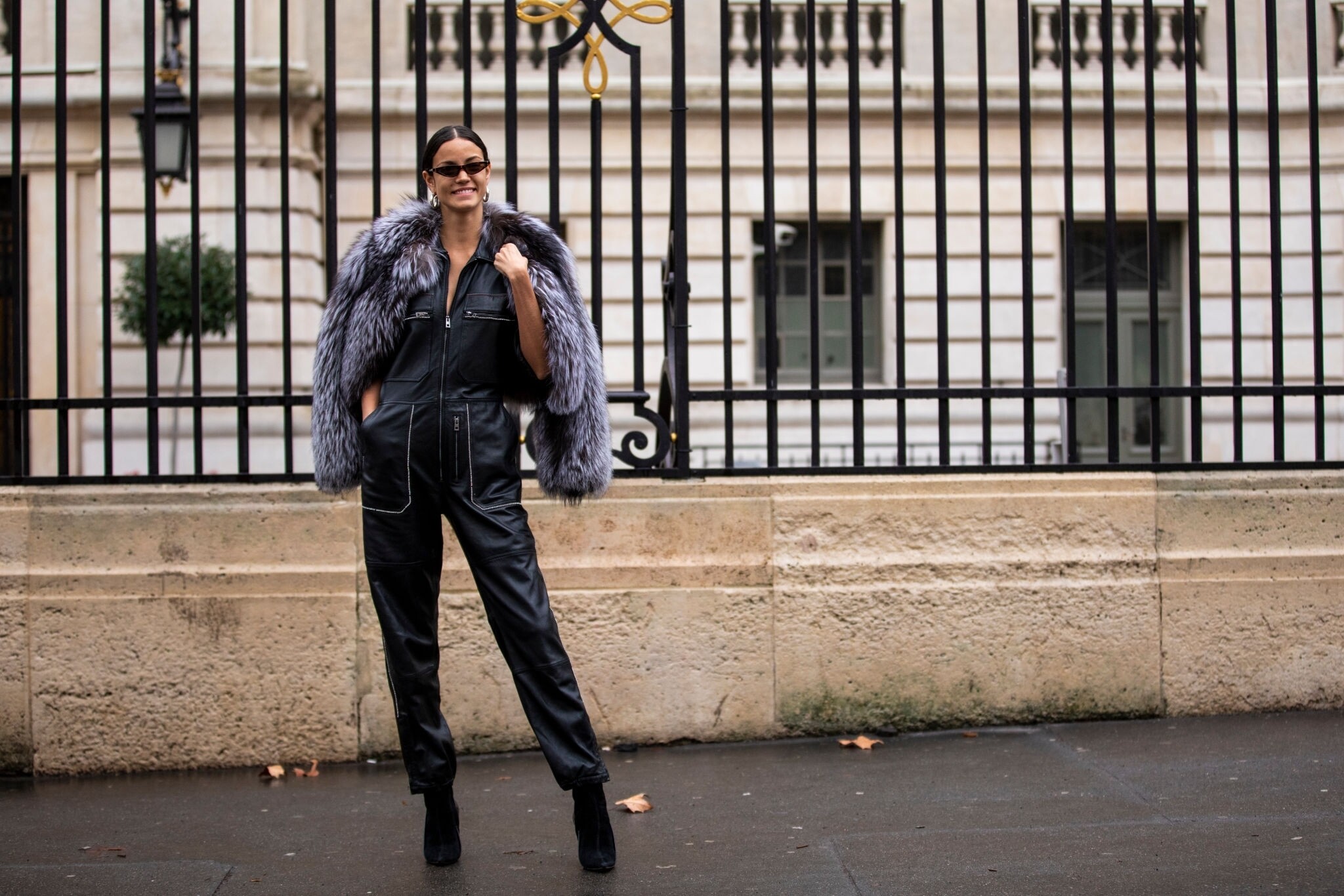Model Sofia Resing, wearing a black jumpsuit, black boots and grey fur jacket, is seen outside Zuhair Murad show during Paris Fashion Week - Haute Couture Spring Summer 2019 on January 23, 2019 in Paris, France. (Photo by Claudio Lavenia) (HQ)