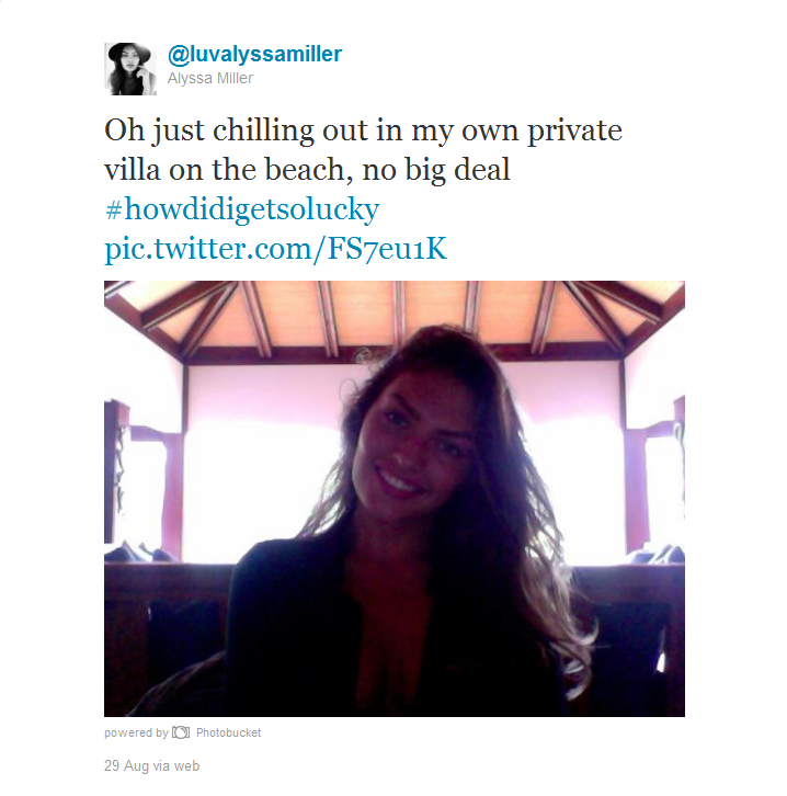 . Later on Darcie Baum tweets that the models have arrived and then Alyssa post this:On my way to paradise!!! Yay!! About to see some of my favorite people eva! Can't wait!