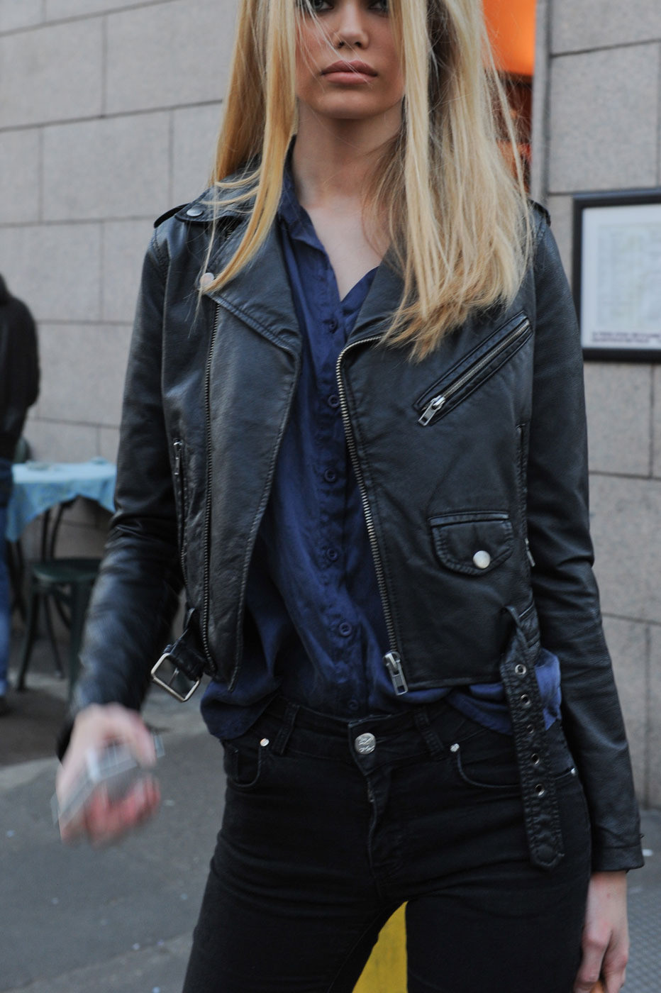 What are you wearing? A top from T by Alexander Wang, Helmut Lang leather leggings, and sneakers by ASH. What are the three items you always keep in your purse? My iPhone, lip balm, and headphones.